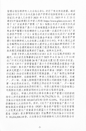 关于《广发证券资产管理(广东)有限公司 关于广发资管智荟广易六个月持有期混合型基金中基金(FOF)集合资产管理计划份额持有人大会表决结果暨决议生效的公告》的更正公告 广发证券资产管理(广东)有限公司(以下简称“本公司”)于2025年6月25日对外披露了《广发证券资产管理(广东)有限公司关于广发资管智荟广易六个月持有期混合型基金中基金(FOF)集合资产管理计划份额持有人大会表决结果暨决议生效的公告》(以下简称“决议生效公告”),根据《广发资管智荟广易六个月持有期混合型基金中基金(FOF)集合资产管理计划资产管理合同》的有关约定,现对决议生效公告中“一、份额持有人大会会议情况”的表述予以更正,更正后的表述如下: 同意本次大会议案的集合计划份额占参加本次会议表决的持有人及代理人所代表表决权的93.502%,达到三分之二以上,符合《中华人民共和国证券投资基金法》、《公开募集证券投资基金运作管理办法》等法律法规的规定和《集合合同》的有关约定,本次会议议案获得通过。 本次份额持有人大会律师费12000元,公证费7000元,合计为19000元,以上费用从本集合计划资产列支。 由此给投资者带来不便,本公司深表歉意。 特此公告。 广发证券资产管理(广东)有限公司 2025年6月26日 广发证券资产管理(广东)有限公司关于 广发资管平衡精选一年持有混合型集合资产管理计划延长存续期限并修改资产管理合同、招募说明书的公告 为更好地服务广发资管平衡精选一年持有混合型集合资产管理计划(以下简称“本集合计划”)投资者,在切实保护现有份额持有人利益的前提下,广发证券资产管理(广东)有限公司(以下简称“本公司”)根据《中华人民共和国证券投资基金法》《公开募集证券投资基金运作管理办法》等相关法律法规的规定及《广发资管平衡精选一年持有混合型集合资产管理计划资产管理合同》(以下简称“资产管理合同”)的约定,经与托管人中国工商银行股份有限公司(以下简称“托管人”)协商一致,决定对本集合计划延长存续期限至2025年11月30日,并对本集合计划的资产管理合同和《广发资管平衡精选一年持有混合型集合资产管理计划招募说明书》(以下简称“招募说明书”)等法律文件进行相应修改。现将相关事宜公告如下: 一、延长存续期限方案 本集合计划存续期限由“自本集合合同变更生效日起存续期至2025年6月30日”延长为“自本集合合同变更生效日起存续期至2025年11月30日”。 本集合合同变更生效日特指根据《证券公司大集合资产管理业务适用〈关于规范金融机构资产管理业务的指导意见〉操作指引》变更后的《广发资管平衡精选一年持有混合型集合资产管理计划资产管理合同》生效日,即2020年11月30日。 二、本集合计划资产管理合同和招募说明书的修改 本集合计划资产管理合同、招募说明书的修改详见附件《广发资管平衡精选一年持有混合型集合资产管理计划资产管理合同、招募说明书修改前后文对照表》。本集合计划资产管理合同、招募说明书的修改符合相关法律法规,且本集合计划管理人已履行规定程序。 本集合计划管理人将根据上述内容更新产品资料概要相关部分。 三、本集合计划延长存续期限事宜及资产管理合同、招募说明书修改自本公告发布之日起生效。此外,对本集合计划设置特殊开放期(2025年6月30日、7月2日至2025年7月7日)。在特殊开放期内,本集合计划份额持有人可提出赎回申请,上述赎回不受1年锁定持有期限制,且各类份额在此期间的赎回不收取赎回费,同时暂停特殊开放期及2025年6月24日至2025年6月30日的申购,暂停申购及恢复申购事宜请详见管理人公告。若本集合计划份额持有人不同意延长存续期限事宜的,可于特殊开放期内,自行通过本集合计划销售机构办理赎回事宜。 四、其他事项 1、本公告仅对广发资管平衡精选一年持有混合型集合资产管理计划延长存续期限有关事项予以说明。投资者欲了解本集合计划的详细情况,可通过本公司网站查阅《广发资管平衡精选一年持有混合型集合资产管理计划资产管理合同》《广发资管平衡精选一年持有混合型集合资产管理计划招募说明书》《广发资管平衡精选一年持有混合型集合资产管理计划(广发资管平衡精选一年持有混合A)基金产品资料概要》《广发资管平衡精选一年持有混合型集合资产管理计划(广发资管平衡精选一年持有混合C)基金产品资料概要》及其更新等相关资料。 2、本集合计划自资产管理合同生效日起存续期至2025年11月30日,期限届满后可能存在资产管理合同终止的风险。特此提示。 3、本公告所述的“基金”也包括按照《证券公司大集合资产管理业务适用〈关于规范金融机构资产管理业务的指导意见〉操作指引》的要求完成变更后的证券公司大集合产品。 4、风险提示:集合计划管理人承诺以诚实信用、勤勉尽责的原则管理和运用集合计划资产,但不保证集合计划一定盈利,也不保证最低收益。投资者投资于本集合计划前应认真阅读本集合计划的资产管理合同、招募说明书、产品资料概要等法律文件。 5、如有疑问,敬请致电或登录管理人网站了解相关情况,咨询电话:95575,公司网站:www.gfam.com.cn。 特此公告。 附件:《广发资管平衡精选一年持有混合型集合资产管理计划资产管理合同、招募说