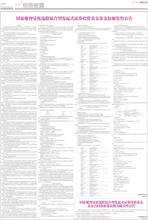 重要提示 1、国泰聚智量化选股混合型发起式证券投资基金(以下简称“本基金”)已获中国证监会证监许可【2025】81号文准予注册募集。中国证监会对本基金募集的注册,并不表明其对本基金的投资价值、市场前景和收益做出实质性判断或保证,也不表明投资于本基金没有风险。 2、本基金为混合型证券投资基金。基金运作方式为契约型开放式。 3、本基金的基金管理人和登记机构为国泰基金管理有限公司(以下简称“本公司”),基金托管人为中信证券股份有限公司。 4、本基金的发售对象为符合法律法规规定的可投资于证券投资基金的个人投资者、机构投资者、合格境外投资者、发起资金提供方以及法律法规或中国证监会允许购买证券投资基金的其他投资人。 5、本基金自2025年7月8日至2025年9月24日通过基金管理人指定的销售机构公开发售。本基金的募集期限不超过3个月,自基金份额开始发售之日起计算。本公司也可根据基金销售情况,在符合相关法律法规的情况下,在募集期限内适当调整基金发售时间,并及时公告。 6、本基金可设置募集规模上限,具体募集上限及相关安排详见届时公告。 7、本基金的销售机构包括直销机构和其他销售机构。直销机构包括本公司直销柜台和电子交易平台。其他销售机构详见“七(三)2、其他销售机构”。各销售机构的办理地点、办理日期、办理时间和办理程序等事项参照各销售机构的具体规定。 8、投资人在首次认购本基金时,如尚未开立国泰基金管理有限公司基金账户,需按销售机构的规定,提出开立国泰基金管理有限公司基金账户和销售机构交易账户的申请。开户和认购申请可同时办理,一次性完成,但认购申请的确认须以开户确认成功为前提条件。一个投资人只能开立和使用一个基金账户,已经开立国泰基金管理有限公司基金账户的投资人可免予开户申请。 投资人不得非法利用他人账户或资金进行认购,也不得违规融资或帮助他人违规进行认购。 9、持有中国工商银行卡、中国农业银行卡、中国建设银行卡、招商银行卡等的个人投资者在本公司网站(www.gtfund.com)与本公司达成网上交易的相关协议,接受本公司有关服务条款并办理相关手续后,即可通过本公司网上交易办理基金账户开立、基金认购、基金申购、基金转换、基金赎回、资料变更、分红方式变更、信息查询等各项业务。有关基金网上交易的具体业务规则请登录本公司网站查询。 10、基金份额的认购采用金额认购方式。投资人认购时,需按销售机构规定的方式全额缴款。若资金未全额到账则认购无效,基金管理人将认购无效的款项退回。投资人在募集期内可以多次认购基金份额,A类基金份额的认购费按每笔认购申请单独计算。认购一经受理不得撤销。投资人单笔最低认购金额为1.00元(含认购费)。各销售机构对本基金最低认购金额及交易级差有其他规定的,以各销售机构的业务规定为准。 11、销售机构对认购申请的受理并不代表该申请一定成功,而仅代表销售机构确实接收到认购申请。认购的确认以登记机构的确认结果为准。对于认购申请及认购份额的确认情况,投资人应及时查询并妥善行使合法权利,否则,由此产生的投资人任何损失由投资人自行承担。 12、本公告仅对本基金募集的有关事项和规定予以说明,投资人欲了解本基金的详细情况,请详细阅读2025年7月4日发布在本公司网站(www.gtfund.com)等规定网站上的《国泰聚智量化选股混合型发起式证券投资基金招募说明书》等文件,投资人亦可通过本公司网站下载基金业务申请表格和了解本基金募集相关事宜。本基金的基金合同及招募说明书提示性公告和本公告将同时刊登在《中国证券报》。 13、在募集期间,除本公告所列的销售机构外,如增加其他销售机构,本公司将及时公告或在基金管理人网站列示。 14、投资人可拨打本公司客户服务电话(400-888-8688、021-31089000)或其他销售机构咨询电话了解认购事宜。 15、本基金管理人可综合各种情况对发售安排做适当调整。 16、风险提示 证券投资基金(以下简称“基金”)是一种长期投资工具,其主要功能是分散投资,降低投资单一证券所带来的个别风险。基金不同于银行储蓄和债券等能够提供固定收益预期的金融工具,投资人购买基金,既可能按其持有份额分享基金投资所产生的收益,也可能承担基金投资所带来的损失。 基金分为股票型基金、混合型基金、债券型基金、货币市场基金等不同类型,投资人投资不同类型的基金将获得不同的收益预期,也将承担不同程度的风险。一般来说,基金的收益预期越高,投资人承担的风险也越大。 本基金投资于证券市场,基金净值会因为证券市场波动等因素产生波动。投资人在投资本基金前,需全面认识本基金产品的风险收益特征和产品特性,充分考虑自身的风险承受能力,理性判断市场,对投资本基金的意愿、时机、数量等投资行为做出独立决策。投资人根据所持有的基金份额享受基金的收益,但同时也需承担相应的投资风险。基金投资中的风险包括:系统性风险、非系统性风险、运作管理风险、流动性风险、本基金特定风险、本基金法律文件中涉及基金风险特征的表述与销售机构对基金的风险评级可能不一致的风险和其他风险等。 本基金可投资内地与香港股票市场交易互联互通机制允许买卖的规
