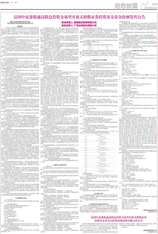 富国中证港股通高股息投资交易型 开放式指数证券投资基金基金份额发售公告 重要提示 1、富国中证港股通高股息投资交易型开放式指数证券投资基金(以下简称“本基金”)已于2025年6月18日获得中国证监会准予注册的批复(证监许可〔2025〕1273号)。中国证监会对本基金募集的注册,并不表明其对本基金的投资价值、收益和市场前景等做出实质性判断或者保证,也不表明投资于本基金没有风险。 2、本基金的基金类别是股票型证券投资基金,基金运作方式是契约型,交易型开放式。 3、本基金的基金管理人为富国基金管理有限公司(以下简称“本公司”或“基金管理人”),基金托管人为广发证券股份有限公司,登记机构为中国证券登记结算有限责任公司。 4、本基金募集对象为符合法律法规规定的可投资于证券投资基金的个人投资者、机构投资者、合格境外投资者以及法律法规或中国证监会允许购买证券投资基金的其他投资人。 5、投资者可选择网上现金认购和网下现金认购2种方式认购本基金。基金管理人可根据情况增加其他认购方式,具体以相关公告为准。 网上现金认购是指投资者通过具有基金销售业务资格的深圳证券交易所会员用深圳证券交易所网上系统以现金进行的认购。 网下现金认购是指投资者通过基金管理人及其指定的发售代理机构以现金进行的认购。 6、本基金募集期自2025年7月17日至2025年7月31日。其中,网上现金认购的日期为2025年7月17日至2025年7月31日;网下现金认购的日期为2025年7月17日至2025年7月31日。如深圳证券交易所对网上现金认购时间做出调整,本公司将相应调整并及时公告。基金管理人可根据募集情况在募集期限内适当调整本基金的募集期限并及时公告。 7、募集期内,本基金募集规模上限为20亿元人民币(不包括募集期利息和认购费用,下同)。 8、投资人认购本基金时需具有深圳证券交易所A股账户(以下简称“深圳A股账户”)或深圳证券交易所证券投资基金账户(以下简称“深圳证券投资基金账户”)。 9、网上现金认购以基金份额申请。单一账户每笔认购份额需为1000份或其整数倍。投资者可以多次认购,累计认购份额不设上限,但法律法规或监管要求另有规定的除外。 网下现金认购以基金份额申请。投资者单笔认购须为1000份或其整数倍。投资者可以多次认购,累计认购金额不设上限,但法律法规或监管要求另有规定的除外。 10、投资者认购本基金时,需按发售机构(指发售代理机构和/或直销机构)的规定,备足认购资金,办理认购手续。 11、发售机构对认购申请的受理并不表示对该申请的成功确认,而仅代表发售机构确实接受了认购申请。申请的成功确认应以基金合同生效后,登记机构的确认登记为准。投资者可以在基金合同生效后到原认购的销售网点打印认购成交确认凭证。 投资者应提前了解发售机构相关业务规则,敬请投资者留意相关风险。 12、本公告仅对富国中证港股通高股息投资交易型开放式指数证券投资基金发售的有关事项和规定予以说明。投资者欲了解本基金的详细情况,请详细阅读同时发布在中国证监会基金电子披露网站(http://eid.csrc.gov.cn/fund)和本公司网站(www.fullgoal.com.cn)的基金合同全文和招募说明书全文,投资者亦可通过本公司网站下载基金业务申请表格和了解本基金募集相关事宜。 13、发售机构的销售网点以及开户认购等事项的详细情况请向各发售机构咨询。 14、投资者可拨打本公司的客户服务电话95105686、400-888-0688咨询购买事宜。 15、基金管理人可综合各种情况对募集安排做适当调整。 16、基金管理人依照恪尽职守、诚实信用、谨慎勤勉的原则管理和运用基金财产,但不保证基金一定盈利,也不保证最低收益。 17、本基金属于股票型基金,预期风险与预期收益高于混合型基金、债券型基金与货币市场基金。本基金主要投资于标的指数成份股及备选成份股,具有与标的指数相似的风险收益特征。本基金投资港股通标的股票,将承担港股通机制下因投资环境、投资标的、市场制度以及交易规则等差异带来的特有风险。 18、风险提示 投资者根据所持有的基金份额享受基金收益,同时承担相应的投资风险。投资本基金风险详见招募说明书“风险揭示”章节,包括:因政治、经济、社会等环境因素对证券价格产生影响而形成的系统性风险,个别证券特有的非系统性风险,基金管理人在基金管理实施过程中产生的基金管理风险等。同时由于本基金是交易型开放式基金,特定风险还包括:指数化投资的风险、标的指数的风险、跟踪误差控制未达约定目标的风险、基金份额二级市场交易价格折溢价的风险、套利风险、参考IOPV决策和IOPV计算错误的风险、申购赎回清单差错风险、申购及赎回风险、基金管理人代理申赎投资者买券卖券的风险、退市风险、终止清盘风险、第三方机构服务的风险、投资特定品种的特有风险等等。 本基金投资相关股票市场交易互联互通机制允许买卖的规定范围内的香港联合交易所上市的股票(以下简称“港股通标的股票”)的,将承担港股通机制下因投资环境、投资标的、市场制度以及交易规则等差异带来的特有风险,包括港股市场股价波动较大的风险(港股市场实行T+0回转交易,且对个股不设涨跌幅限制,港股股价可能表现出比A股更为剧烈的股价波动)、汇率风险(汇