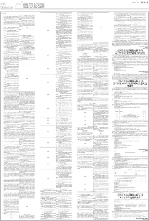 ■ ■ ■ ■ ■ ■ ■ ■ ■ ■ ■ ■ ■ ■ ■ 注:除上述修改外,公司章程其他条款不变。若修订时因条款增删、顺序调整导致条款序号调整、相关援引条款序号调整等不涉及实质性内容修订的,未在上表对比列示。 拟修订的《公司章程》与本公告同日披露于公司指定信息披露网站巨潮资讯网(www.cninfo.com.cn)。 本次变更公司注册地址并修改《公司章程》事宜尚需提交股东大会审议批准,并提请股东大会授权公司董事会,并由董事会授权经营管理层根据最终经核准的注册地址、《公司章程》条款修订及相关变更登记/备案等事宜,授权期限自股东大会审议通过本议案之日起至该等具体执行事项办理完毕之日止。上述变更及备案登记最终以市场监督管理机关备案、登记的内容为准。 特此公告。 金鸿控股集团股份有限公司 董事会 2025年7月8日 证券代码:000669 证券简称:ST金鸿 公告编号:2025-055 金鸿控股集团股份有限公司 关于聘任公司董事会秘书的公告 本公司及董事会全体成员保证信息披露的真实、准确、完整,没有虚假记载、误导性陈述或重大遗漏。 金鸿控股集团股份有限公司(以下简称“公司”)于2025年7月8日召开第十一届董事会2025年第五次会议,审议通过了《关于聘任公司董事会秘书的议案》。 2025年1月14日,公司第十届董事会已换届完成,第十一届董事会新任董事已经股东大会审议通过。因公司尚未聘任董事会秘书,根据《深圳证券交易所股票上市规则》等有关规定,第十一届董事会2025年第一次会议审议通过《关于选举郭韬先生为公司第十一届董事会董事长的议案》,选举郭韬先生为公司第十一届董事会董事长,董事会秘书职责暂由公司董事长郭韬先生代为履行,具体内容请参阅公司于2025年1月16日在巨潮资讯网(www.cninfo.com.cn)披露的《第十一届董事会2025年第一次会议决议公告》(公告编号:2025-006)。 根据《深圳证券交易所股票上市规则》《深圳证券交易所上市公司自律监管指引第1号一一主板上市公司规范运作》及《公司章程》的有关规定,经董事长提名,董事会提名委员会审查,董事会同意聘任赵睿先生(简历详见附件)为公司董事会秘书,任期自董事会审议通过之日起至第十一届董事会任期届满之日止,董事长郭韬先生不再代行董事会秘书职责。 赵睿先生已取得深圳证券交易所颁发的上市公司董事会秘书培训证明,具备履行职责所需的专业知识和管理能力,其任职资格符合《深圳证券交易所股票上市规则》《深圳证券交易所上市公司自律监管指引第1号一一主板上市公司规范运作》等有关规定。 公司董事会秘书赵睿先生联系方式如下: 联系地址:湖南省衡阳市石鼓区蔡伦大道218号金鸿控股16层 邮政编码:421000 办公电话:0734-8800669 传真号码:0734-8133585 电子邮箱:dm@jinhong-holding.com 金鸿控股集团股份有限公司 董事会 2025年7月8日 附件:赵睿先生简历 赵睿,男,1990年出生,中国国籍,无境外永久居留权,研究生学历,保荐代表人、非执业注册会计师、法律职业资格。先后在中山证券、南京证券、申万宏源承销保荐从事承销保荐业务,2025年2月加入金鸿控股。 赵睿先生未直接或间接持有公司股票,与上市公司或持有公司5%以上股份的股东、实际控制人、公司其他董事、监事、高级管理人员不存在关联关系;未受到过中国证监会及其他有关部门的处罚或证券交易所惩戒,不属于最高人民法院公布的“失信被执行人”;不存在《中华人民共和国公司法》《深圳证券交易所股票上市规则》《深圳证券交易所上市公司自律监管指引第1号一一主板上市公司规范运作》中规定的不得担任公司高级管理人员的情形,符合相关法律法规、规范性文件、交易所其他规定及《公司章程》等规定的任职要求。 证券代码:000669 证券简称:ST金鸿 公告编号:2025-056 金鸿控股集团股份有限公司 关于召开2025年第三次临时股东大会的通知 本公司及董事会全体成员保证信息披露的内容真实、准确、完整,没有虚假记载、误导性陈述或重大遗漏。 金鸿控股集团股份有限公司(以下简称“公司”)第十一届董事会2025年第五次会议审议通过了《关于召开2025年第三次临时股东大会的议案》,定于2025年7月25日(星期五)召开2025年第三次临时股东大会,审议董事会提交的相关提案。本次股东大会采用现场投票与网络投票的方式进行表决,现将有关事项通知如下: 一、召开会议的基本情况 1、股东大会届次:2025年第三次临时股东大会 2、会议召集人:公司董事会 3、会议召开的合法、合规性:公司于2025年7月8日召开第十一届董事会2025年第五次会议,审议通过了《关于召开2025年第三次临时股东大会的议案》,本次股东大会的召开符合有关法律、行政法规、部门规章、规范性文件和《公司章程》等的规定。 4、会议召开时间: (1)现场会议召开时间:2025年7月25日(星期五)14:00 (2)网络投票时间: 通过深圳证券交易所交易系统进行网络投票的具体时间为:2025年7月25日9:15至9:25,9:30至11:30,13:00至15:00;通过深圳证券交易所互联网投票的具体时间为:2025年7月25日9:15至15:00期间的任意时间。 5、会议召开方式: 本次股东大会采用现场表决与网络投票相结合的方式召开。 6、股权登记日:2025年7月18日(星期五) 7、出席对象: (1)2025年7月18日下午收市时,在中国证券登记结算有限责任公司深圳分公司登记在册的公司全体股东均有权出