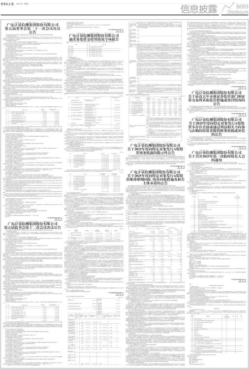 证券代码:002967 证券简称:广电计量 公告编号:2025-036 广电计量检测集团股份有限公司 第五届董事会第二十一次会议决议公告 本公司及董事会全体成员保证信息披露的内容真实、准确、完整,没有虚假记载、误导性陈述或重大遗漏。 一、董事会会议召开情况 广电计量检测集团股份有限公司(以下简称“公司”)第五届董事会第二十一次会议于2025年7月21日以通讯方式召开。会议通知于2025年7月18日以书面及电子邮件、电话等方式发出。会议应出席董事9名,实际出席董事9名,符合《公司法》等有关法律法规和公司章程的规定,合法有效。 二、董事会会议审议情况 (一)审议通过《关于公司符合向特定对象发行A股股票条件的议案》 根据《公司法》《证券法》《上市公司证券发行注册管理办法》等法律法规及规范性文件的有关规定,经公司逐项自查,公司符合向特定对象发行A股股票的有关规定,具备向特定对象发行A股股票的条件。 表决结果:同意9票,反对0票,弃权0票。 本议案尚需提交公司股东大会审议。 (二)逐项审议通过《关于公司向特定对象发行A股股票方案的议案》 1.发行股票种类和面值 本次向特定对象发行股票的种类为境内上市人民币普通股(A股),每股面值为人民币1.00元。 表决结果:同意9票,反对0票,弃权0票。 2.发行方式和发行时间 本次发行采取向特定对象发行方式,公司将在中国证监会关于本次发行作出予以注册决定的有效期内择机实施。 表决结果:同意9票,反对0票,弃权0票。 3.发行对象及认购方式 本次向特定对象发行股票的发行对象不超过35名,为符合监管机构规定条件的法人、自然人或者其他合法投资组织。证券投资基金管理公司、证券公司、理财公司、保险公司、合格境外机构投资者、人民币合格境外机构投资者以其管理的两只以上产品认购的,视为一个发行对象;信托公司作为发行对象的,只能以自有资金认购。若发行时法律、法规或规范性文件对发行对象另有规定的,从其规定。 最终发行对象由公司董事会或其授权人士根据股东大会授权,在公司取得中国证监会对本次发行予以注册的决定后,与保荐机构(主承销商)按照相关法律、法规和规范性文件的规定及本次发行申购报价情况,遵照价格优先等原则协商确定。若发行时法律、法规及规范性文件对本次发行对象有新的规定,公司将按新的规定进行调整。 本次发行的所有发行对象均以人民币现金方式并按同一价格认购本次发行的股票。 表决结果:同意9票,反对0票,弃权0票。 4.定价基准日、定价原则及发行价格 本次向特定对象发行股票采取竞价发行方式,本次发行的定价基准日为发行期首日。发行价格不低于定价基准日前20个交易日股票交易均价的80%(即“发行底价”,定价基准日前20个交易日公司股票交易均价=定价基准日前20个交易日股票交易总额/定价基准日前20个交易日股票交易总量)。若公司在定价基准日至发行日的期间发生派息、送股、资本公积金转增股本等除权、除息事项,本次发行的发行底价将进行相应调整。调整方式如下: 派送现金股利:P1=P0-D 送股或转增股本:P1=P0/(1+N) 两项同时进行:P1=(P0-D)/(1+N) 其中,P0为调整前发行底价,D为每股派发现金股利,N为每股送股或转增股本数,P1为调整后发行底价。 本次向特定对象发行股票通过竞价方式确定发行价格,最终发行价格将由董事会或其授权人士根据股东大会授权,在公司取得中国证监会对本次发行予以注册的决定后,与保荐机构(主承销商)按照相关法律、法规和规范性文件的规定,遵照价格优先等原则,根据发行对象申购报价情况协商确定,但不低于前述发行底价。 表决结果:同意9票,反对0票,弃权0票。 5.发行数量 本次向特定对象发行股票预计募集资金总额不超过130,000万元(含本数)。本次发行的数量按照募集资金总额除以发行价格确定(计算结果出现不足1股的,尾数应向下取整;对于不足1股部分的对价,在认购总价款中自动扣除),且不超过67,131,773股(含本数),不超过本次发行前公司总股本的30%。最终发行数量上限以经深圳证券交易所审核通过并经中国证监会同意注册的发行数量上限为准。 若公司在审议本次向特定对象发行股票事项的董事会决议公告日至发行日期间发生送股、资本公积金转增股本等除权事项或者因股份回购、员工股权激励计划等事项导致公司总股本发生变化,本次发行的股票数量上限将作相应调整。 若本次向特定对象发行股票的股份总数因监管政策变化或根据发行注册文件的要求予以调整的,则本次发行的股份总数及募集资金总额届时将相应调整。 表决结果:同意9票,反对0票,弃权0票。 6.限售期 本次向特定对象发行股票完成后,发行对象认购的本次发行的股票自发行结束之日起6个月内不得转让。 本次发行对象所取得的股份因公司送股、资本公积金转增股本等形式所衍生取得的股份亦应遵守上述股份锁定安排。限售期届满后按中国证监会及深圳证券交易所的有关规定执行。 表决结果:同意9票,反对0票,弃权0票。 7.股票上市地点 本次发行的股票将在深圳证券交易所上市交易。 表决结果:同意9票,反对0票,弃权0票。 8.募集资金总额及用途 本次向特定对象发行股票的募集资金总额不超过130,000万元(含本数),扣除发行费用后的募集资金净额将用于以下项目: ■ 本次向特定对象发行股票募集资金到位