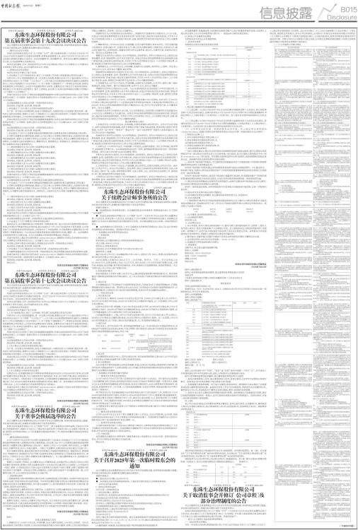 证券代码:603359 证券简称:东珠生态 公告编号:2025-036 东珠生态环保股份有限公司 第五届董事会第十九次会议决议公告 本公司董事会及全体董事保证本公告内容不存在任何虚假记载、误导性陈述或者重大遗漏,并对其内容的真实性、准确性和完整性承担法律责任。 一、董事会会议召开情况 东珠生态环保股份有限公司(以下简称“公司”)第五届董事会第十九次会议于2025年7月12日以书面形式及邮件方式通知全体董事、监事及高级管理人员,会议于2025年7月22日在公司会议室以现场结合通讯方式召开。会议应到董事9名,实到董事9名。本次会议由董事长席惠明先生主持,公司高级管理人员列席会议。 本次会议的通知、召开、表决程序符合《中华人民共和国公司法》《公司章程》《公司董事会议事规则》等有关规定,会议形成的决议合法、有效。 二、董事会会议审议情况 本次会议审议并通过了如下议案: 1、审议通过了《关于取消监事会、修订〈公司章程〉并办理工商变更登记事宜的议案》 为符合对上市公司的规范要求,进一步完善公司治理,根据2024年7月1日起实施的《中华人民共和国公司法》(以下简称“《公司法》”)、《关于新公司法配套制度规则实施相关过渡期安排》《上市公司章程指引(2025年修订)》(以下简称“《章程指引》”)等相关法律法规、规章及其他规范性文件的规定,公司拟不再设置监事会与监事,由董事会审计委员会行使监事会职权,同时废止公司《监事会议事规则》。基于上述情况,对应修订《东珠生态环保股份有限公司章程》(以下简称“《公司章程》”)。 具体内容详见公司同日于指定信息披露媒体披露的《东珠生态环保股份有限公司关于取消监事会并修订〈公司章程〉及修订部分公司治理制度的公告》(公告编号2025-039)及修订后的《公司章程》。 本议案尚需提交公司2025年第一次临时股东会审议。 表决情况:同意9票,反对0票,弃权0票。 2、审议通过了《关于修订公司部分治理制度的议案》 为了进一步完善公司治理结构,促进公司规范运作,与修改后的《公司章程》规定保持一致,结合公司的实际情况,根据《公司法》《章程指引》《上海证券交易所股票上市规则》等法律法规和规范性文件的规定,公司对部分治理制度进行了相应修订。 具体内容详见公司同日于指定信息披露媒体披露的《东珠生态环保股份有限公司关于取消监事会并修订〈公司章程〉及修订部分公司治理制度的公告》(公告编号2025-039)及修订后的相关制度。 本议案尚需提交公司2025年第一次临时股东会审议。 表决情况:同意9票,反对0票,弃权0票。 3、审议通过了《关于公司董事会换届选举暨提名第六届董事会非独立董事候选人的议案》 公司第五届董事会任期将届满,根据《公司法》和《公司章程》等相关规定,应按程序进行董事会换届选举。根据《公司章程》并结合公司实际,经广泛征求意见,并经公司董事会提名委员会审核后,公司董事会提名席惠明先生、曹敏伟先生、缪春晓先生、李嘉俊先生、谈劭旸先生为公司第六届董事会非独立董事候选人。 (1)提名席惠明先生为公司第六届董事会非独立董事; 表决情况:同意9票,反对0票,弃权0票。 (2)提名曹敏伟先生为公司第六届董事会非独立董事; 表决情况:同意9票,反对0票,弃权0票。 (3)提名缪春晓先生为公司第六届董事会非独立董事; 表决情况:同意9票,反对0票,弃权0票。 (4)提名李嘉俊先生为公司第六届董事会非独立董事; 表决情况:同意9票,反对0票,弃权0票。 (5)提名谈劭旸先生为公司第六届董事会非独立董事; 表决情况:同意9票,反对0票,弃权0票。 具体内容详见公司同日于指定信息披露媒体披露的《东珠生态环保股份有限公司关于董事会换届选举的公告》(公告编号2025-038)。 本议案尚需提交2025年第一次临时股东会通过累积投票制审议。 4、审议通过了《关于公司董事会换届选举暨提名第六届董事会独立董事候选人的议案》 公司第五届董事会任期将届满,根据《公司法》和《公司章程》等相关规定,应按程序进行董事会换届选举。根据《公司章程》并结合公司实际,经广泛征求意见,并经公司董事会提名委员会审核后,公司董事会提名张春景先生、刘和先生、万梁浩先生为公司第六届董事会独立董事候选人。 (1)提名张春景先生为公司第六届董事会独立董事; 表决情况:同意9票,反对0票,弃权0票。 (2)提名刘和先生为公司第六届董事会独立董事; 表决情况:同意9票,反对0票,弃权0票。 (3)提名万梁浩先生为公司第六届董事会独立董事。 表决情况:同意9票,反对0票,弃权0票。 具体内容详见公司同日于指定信息披露媒体披露的《东珠生态环保股份有限公司关于董事会换届选举的公告》(公告编号2025-038)。 本议案尚需提交2025年第一次临时股东会通过累积投票制审议。 5、审议通过了《关于续聘会计师事务所的议案》 董事会认为:北京德皓国际会计师事务所(特殊普通合伙)是公司2024年度聘用的外部审计机构,在任期内严格遵守相关法律法规,独立完成审计工作,为公司出具的审计报告客观、公正地反映了公司的财务状况和经营成果。为保持审计工作的连续性,公司拟续聘北京德皓国际会计师事务所(特殊普通合伙)为公司2025年度财务报表及内部控制审计机构,聘期一年。本次续聘会计师事务所符合《国有企业、上