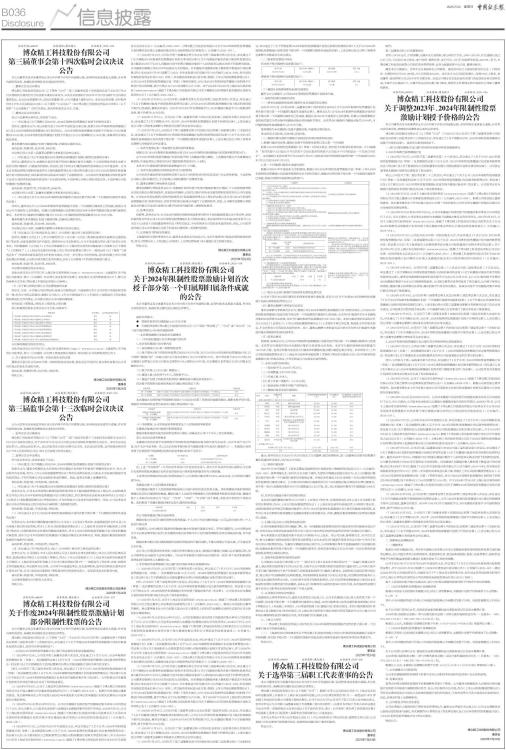 证券代码:688097 证券简称:博众精工 公告编号:2025-034 博众精工科技股份有限公司 第三届董事会第十四次临时会议决议公告 本公司董事会及全体董事保证本公告内容不存在任何虚假记载、误导性陈述或者重大遗漏,并对其内容的真实性、准确性和完整性依法承担法律责任。 一、董事会会议召开情况 博众精工科技股份有限公司(以下简称“公司”)第三届董事会第十四次临时会议于2025年7月23日以现场结合通讯的方式在总部大楼会议室召开。本次会议的通知于2025年7月16日以邮件方式向各位董事发出。会议应出席董事7名,实际出席董事7名,占公司董事人数的100%。本次会议的召集、召开程序符合《中华人民共和国公司法》(以下简称“《公司法》”)和《博众精工科技股份有限公司章程》(以下简称“《公司章程》”)的有关规定,表决所形成决议合法、有效。 二、董事会会议审议情况 经过与会董事认真审议,形成如下决议: (一)审议通过《关于调整公司2023年、2024年限制性股票激励计划授予价格的议案》 经审议,董事会认为:因已实施完成了2024年年度权益分派方案,根据《2023年限制性股票激励计划》及《2024年限制性股票激励计划》相关规定, 2023年限制性股票激励计划授予价格由6.18元/股调整为6.04元/股,2024年限制性股票激励计划授予价格由12.52元/股调整为12.38元/股,该事项符合相关规定要求。 董事蒋健为相关激励计划授予激励对象,回避该议案的表决。 表决结果:同意6票,反对0票,弃权0票。 本议案已经公司第三届董事会薪酬与考核委员会审议通过。 (二)审议通过《关于作废处理2024年限制性股票激励计划部分限制性股票的议案》 经审议,董事会认为:本激励计划首次授予的部分激励对象存在离职、个人层面绩效考核未达到当批次全部归属条件、自愿放弃的情形,对应的已授予但尚未归属的限制性股票将由公司作废处理。公司本次作废处理部分限制性股票符合《股权激励管理办法》等法律法规以及公司《2024年限制性股票激励计划》的相关规定,相关事项的审议和表决均履行了必要的程序。公司本次作废处理部分限制性股票不会对公司的财务状况和经营成果产生实质性影响,不会影响公司核心团队的稳定性,不会影响公司股权激励计划继续实施。 表决结果:同意票7票,不同意0票,弃权0票。 本议案已经公司第三届董事会薪酬与考核委员会审议通过。 (三)审议通过《关于公司2024年限制性股票激励计划首次授予部分第一个归属期归属条件成就的议案》 经审议,董事会认为:公司2024年限制性股票激励计划第一个归属期归属条件已经成就,根据公司2023年年度股东大会的授权,同意公司按照激励计划的相关规定为符合条件的激励对象办理归属相关事宜。本次符合归属条件的激励对象共计164名,可归属的限制性股票数量为126.7625万股。 董事蒋健为本次激励计划授予激励对象,回避该议案的表决。 表决结果:同意6票,反对0票,弃权0票。 本议案已经公司第三届董事会薪酬与考核委员会审议通过。 (四)审议通过《关于取消监事会、修订〈公司章程〉暨办理工商变更的议案》 经审议,根据《公司法》《上市公司章程指引》《关于新〈公司法〉配套制度规则实施相关过渡期安排》等法律、法规及规范性文件的规定,同时结合公司实际情况,公司不再设置监事会;鉴于取消公司监事会,同时根据新《公司法》《上市公司章程指引》《上海证券交易所科创板股票上市规则》(以下简称“《上市规则》”)、《上海证券交易所科创板上市公司自律监管指引第1号--规范运作》(以下简称“《规范运作》”)等法律法规及规范性文件的相关规定,为进一步完善公司治理结构,适应科创板上市公司规范治理运作需要,公司结合相关规定及实际情况,拟对《公司章程》中的相关条款进行修订。 表决结果:同意7票,反对0票,弃权0票。 本议案尚需提交股东会审议。 具体内容详见公司于同日在上海证券交易所网站(http:// www.sse.com.cn)上披露的《关于取消公司监事会、修订〈公司章程〉并办理工商变更登记及修订、制定部分公司治理制度的公告》,修订后的章程全文详见《博众精工科技股份有限公司章程》。 (五)关于修订和制定部分公司治理制度的议案 经审议,为进一步完善公司治理结构,促进公司规范运作,与最新修订的《公司章程》的最新规定保持一致,结合公司的实际情况,根据《公司法》《上市公司章程指引》《上市规则》《规范运作》等法律法规和规范性文件的规定,公司修订部分公司内部治理制度。 表决结果:7票赞成,0票反对,0票弃权,0票回避 部分制度需经股东会审议后方可生效,具体如下: ■ 本议案尚需提交股东会审议。 具体内容详见公司于同日在上海证券交易所网站(http:// www.sse.com.cn)上披露的《关于取消公司监事会、修订〈公司章程〉并办理工商变更登记及修订、制定部分公司治理制度的公告》。 六、关于提请召开2025年第一次临时股东会的议案 董事会同意召开公司2025年第一次临时股东会的议案,股东会召开的时间、地点等具体事宜以公司另行发出的股东会通知为准。 表决结果:同意票7票,反对0票,弃权0票。 特此公告。 博众精工科技股份有限公司 董事会 2025年7月24日 证券代码:688097 证券简称:博众精工 公告编号:2025-035 博众精工科技股份有限公司 第三届监事会第十三