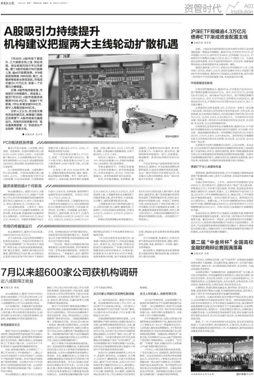 ● 本报记者 赵中昊 近期,上海证券交易所和深圳证券交易所分别在行业内部通报最新一期基金市场数据。截至6月末,沪市ETF共701只,总市值逾3.14万亿元;深市ETF共495只,总市值超1.15万亿元。沪深两市ETF规模合计逾4.3万亿元,较上个月稳步上升。从券商经纪业务角度看,在ETF业务竞争格局中,中信证券、国泰海通等传统龙头券商凭借综合实力稳居第一梯队。 需要注意的是,7月17日,首批10只科创债ETF上市,引发市场广泛关注。券商人士认为,首批科创债ETF的上市重塑了债券ETF的市场格局。债券ETF正加速迈入发展快车道,成为当前二级市场中不可忽视的重要力量,未来发展空间可期。 市场规模迭创新高 沪深交易所数据显示,截至6月末,沪市基金产品共870只,资产管理总规模为32259.87亿元。其中,ETF共701只,总市值为31473.20亿元。深市基金产品共783只,资产管理总规模为11910.20亿元。其中,ETF共495只,总市值为11539.20亿元。截至2025年6月末,沪深两市ETF总市值为43012.40亿元,较上个月稳步攀升。 从券商经纪业务角度看,6月,沪市ETF(非货币)成交额(经纪业务)排名前五位的券商分别为华泰证券、中信证券、国泰海通、东方证券和中国银河,当月成交额在市场中的占比分别为11.75%、11.04%、6.55%、5.30%和4.71%。当月深市ETF交易金额(经纪业务)排名前五位的券商分别为东北证券、东方财富、东方证券、方正证券和港裕信息。 从券商经纪业务持有的ETF规模来看,截至6月末,沪市持有ETF规模排名前五位的券商分别为中国银河、申万宏源、中信证券、国泰海通和招商证券,持有规模在市场中的占比分别为24.03%、17.61%、6.26%、4.78%和4.63%。深市持有ETF规模排名前五位的券商分别为东方财富、东方证券、方正证券、光大证券和广发证券。 从券商ETF业务月度数据可以发现,以东方财富、东北证券、方正证券等为代表的采取差异化战略的特色券商,已成功构建了自身的核心竞争力。值得注意的是,聚焦于深股通服务及深交所ETF交易的港裕信息等特色化经营机构表现亮眼,近两月交易规模稳居深市前五。资源与综合实力雄厚的头部券商,如中信证券、国泰海通、中国银河持续保持着市场主导地位。 债券ETF步入发展快车道 凭借高效、透明和低成本优势,ETF不仅稳固占据机构投资者资产配置的核心地位,更在个人投资者、尤其是年轻群体中赢得广泛青睐。 华泰证券研究表示,上半年,国内ETF市场继续扩容近5800亿元,其中债券ETF、港股ETF成为“吸金”的主要品种。多数基金公司上半年着力发行港股、科创板、创业板及其细分赛道主题的ETF,创新药、机器人、人工智能等ETF成为热门之选,26只ETF上半年规模增长超百亿元。数量方面,上半年股票型ETF数量增长最多,从893只增长至1055只,债券型ETF从21只增至29只。规模方面,上半年ETF规模增加约36%是债券型ETF贡献,规模增加超过2000亿元;而在股票型ETF上半年规模增加的2415亿元中,约有1200亿元是港股ETF规模增长所贡献。 东吴证券认为,债券ETF正加速迈入发展快车道,固收类资产的被动投资趋势日益显著,成为当前二级市场中不可忽视的重要力量。截至2025年一季度末,全市场债券型ETF总规模已达2181亿元,投资者对债券指数化产品的认可度持续提升。在技术、产品及政策等多重利好因素的共同驱动下,债券ETF具备较大的增长潜力,伴随2025年上半年首批基准做市信用债ETF的落地,未来有望实现规模大幅提升。