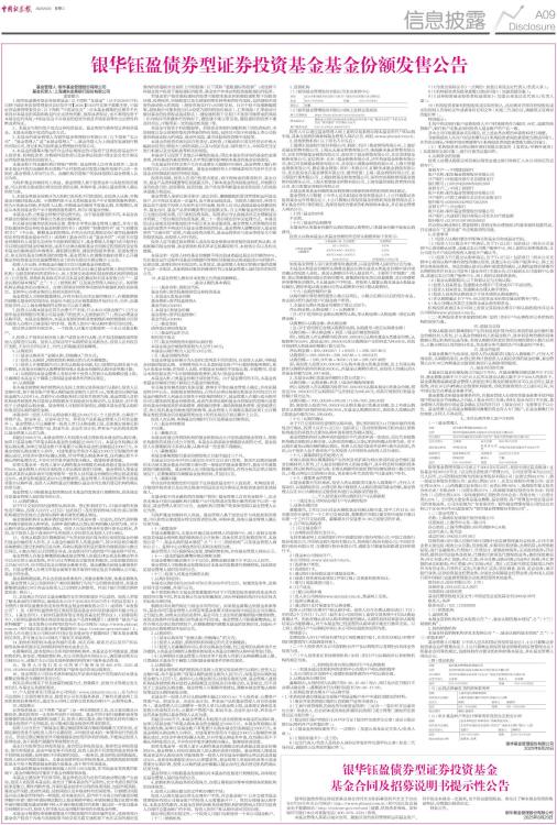 基金管理人:银华基金管理股份有限公司 基金托管人:上海浦东发展银行股份有限公司 重要提示 1、银华钰盈债券型证券投资基金(以下简称“本基金”)已于2025年7月5日获中国证券监督管理委员会证监许可【2025】1433号文准予募集注册。中国证券监督管理委员会(以下简称“中国证监会”)对本基金募集的注册并不代表其对本基金的风险和收益作出实质性判断、推荐或者保证,也不表明投资于本基金没有风险。中国证监会不对基金的投资价值及市场前景等作出实质性判断或者保证。 2、本基金为契约型开放式证券投资基金,基金类别为债券型证券投资基金。本基金采取开放式的运作方式。 3、本基金的基金管理人为银华基金管理股份有限公司(以下简称“本公司”、“基金管理人”或“本基金管理人”),基金托管人为上海浦东发展银行股份有限公司,登记机构为银华基金管理股份有限公司。 4、本基金的募集对象为符合法律法规规定的可投资于证券投资基金的个人投资者、机构投资者、合格境外投资者以及法律法规或中国证监会允许购买证券投资基金的其他投资人。 本基金暂不向金融机构自营账户销售(基金管理人自有资金除外),如未来本基金开放向金融机构自营账户公开发售或对发售对象的范围予以进一步限定,基金管理人将另行公告。金融机构自营账户的具体范围以基金管理人认定为准。 为保护基金份额持有人利益,基金管理人基于投资运作与风险控制的需要,可以拒绝全部或部分特定投资者的认购、申购申请,具体以基金管理人确认结果为准。 5、本基金将基金份额分为A类和C类两类不同的类别。在投资人认购、申购基金份额时收取认购、申购费用而不从本类别基金资产中计提销售服务费的,称为A类基金份额;在投资人认购、申购基金份额时不收取认购、申购费用,而是从本类别基金资产中计提销售服务费的,称为C类基金份额。 本基金A类、C类基金份额分别设置代码。由于基金费用的不同,本基金各类基金份额将分别计算和公告基金份额净值。 有关基金份额类别的具体设置、费率水平等由基金管理人确定,并在《银华钰盈债券型证券投资基金招募说明书》(或简称“招募说明书”或“《招募说明书》”)中公告。根据基金销售情况,在符合法律法规规定和《银华钰盈债券型证券投资基金基金合同》(或简称《基金合同》或“基金合同”)约定且对基金份额持有人利益无实质性不利影响的情况下,基金管理人在履行适当程序后可以增加新的基金份额类别,或者在法律法规和基金合同规定的范围内变更现有基金份额类别的申购费率、调低赎回费率、调低销售服务费率、变更收费方式、停止现有基金份额类别的销售等,基金管理人在调整实施前依照《公开募集证券投资基金信息披露管理办法》的有关规定在规定媒介上公告。 投资人在认购、申购基金份额时可自行选择基金份额类别。 6、本基金于2025年9月8日至2025年9月22日通过基金管理人指定的销售机构(包括直销机构的直销中心、网上直销交易系统和其他销售机构的销售网点)公开发售。销售机构具体名单详见本基金招募说明书及本发售公告“一、基金认购的基本情况”之“(十三)销售机构”以及基金管理人网站公示。各销售机构认购业务的办理网点、办理日期和时间等事项参照各销售机构的具体规定。直销中心办理业务时以其相关规则为准。 基金管理人可根据募集情况,在符合相关法律法规的情况下,在募集期限内调整本基金的发售时间,但最长不超过法定募集期限并及时公告。另外,如遇突发事件,以上基金募集期的安排也可以适当调整。 7、投资人认购本基金应首先办理开户手续,开立本公司基金账户(已开立银华基金管理股份有限公司基金账户的投资人无需重新开户),然后办理基金认购手续。本基金发售期内,本基金直销机构和其他销售机构的销售网点同时为投资人办理开立基金账户的手续。投资人的开户和认购申请可同时办理。 除法律法规另有规定外,一个投资人只能开设和使用一个本公司基金账户。 8、投资人不得非法利用他人账户或资金进行认购,也不得违规融资或帮助他人违规进行认购。投资人应保证用于认购的资金来源合法,投资人应有权自行支配,不存在任何法律上、合约上的瑕疵或其他障碍。 9、认购原则 (1)基金认购采用“金额认购、份额确认”的方式; (2)投资人认购时,需按销售机构规定的方式全额缴款; (3)投资人在募集期内可以多次认购基金份额,但已受理的认购申请不允许撤销,A类基金份额的认购费率按每笔A类基金份额的认购申请单独计算; (4)认购期间本基金管理人有权对单个投资人的累计认购规模设置上限,且需满足本基金关于募集上限和基金备案条件的相关规定。 10、认购限额 在本基金销售机构的销售网点及网上直销交易系统进行认购时,投资人以金额申请,每个基金账户首笔认购的最低金额为人民币1元,每笔追加认购的最低金额为人民币1元。直销中心办理业务时以其相关规则为准。基金管理人直销机构或各销售机构对最低认购限额及交易级差另有规定的,从其规定,但不得低于上述最低认购金额。基金管理人可根据市场情况,调整本基金首笔认购和每笔追加认购的最低金额。 本基金单一投资人单日认购金额不超过1000万元(个人投资者、公募