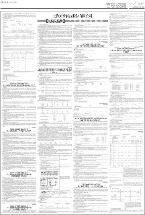 公司代码:688603 公司简称:天承科技 第一节 重要提示 1.1本半年度报告摘要来自半年度报告全文,为全面了解本公司的经营成果、财务状况及未来发展规划,投资者应当到www.sse.com.cn网站仔细阅读半年度报告全文。 1.2重大风险提示 公司已在本报告中详细阐述公司在经营过程中可能面临的各种风险及应对措施,敬请查阅本报告“第三节 管理层讨论与分析”之“四、风险因素”。 1.3本公司董事会、监事会及董事、监事、高级管理人员保证半年度报告内容的真实性、准确性、完整性,不存在虚假记载、误导性陈述或重大遗漏,并承担个别和连带的法律责任。 1.4公司全体董事出席董事会会议。 1.5本半年度报告未经审计。 1.6董事会决议通过的本报告期利润分配预案或公积金转增股本预案 无。 1.7是否存在公司治理特殊安排等重要事项 □适用 √不适用 第二节 公司基本情况 2.1公司简介 公司股票简况 ■ 公司存托凭证简况 □适用 √不适用 联系人和联系方式 ■ 2.2主要财务数据 单位:元 币种:人民币 ■ 2.3前10名股东持股情况表 单位: 股 ■ 2.4前十名境内存托凭证持有人情况表 □适用 √不适用 2.5截至报告期末表决权数量前十名股东情况表 □适用 √不适用 2.6截至报告期末的优先股股东总数、前10名优先股股东情况表 □适用 √不适用 2.7控股股东或实际控制人变更情况 □适用 √不适用 2.8在半年度报告批准报出日存续的债券情况 □适用 √不适用 第三节 重要事项 公司应当根据重要性原则,说明报告期内公司经营情况的重大变化,以及报告期内发生的对公司经营情况有重大影响和预计未来会有重大影响的事项 □适用 √不适用 证券代码:688603 证券简称:天承科技 公告编号:2025-044 上海天承科技股份有限公司 关于使用部分超募资金永久补充流动资金的公告 本公司董事会及全体董事保证本公告内容不存在任何虚假记载、误导性陈述或者重大遗漏,并对其内容的真实性、准确性和完整性承担法律责任。 重要内容提示: ● 上海天承科技股份有限公司(以下简称“公司”或“天承科技”)于2025年8月19日召开了第二届董事会第二十次会议及第二届监事会第十四次会议,审议通过了《关于使用部分超募资金永久补充流动资金的议案》,在确保募集资金投资项目建设的资金需求和募集资金项目正常进行的前提下,同意将部分超募资金人民币9,100.00万元用于永久补充公司流动资金,占超募资金总额的比例为29.71%。保荐机构民生证券股份有限责任公司(以下简称“保荐机构”)对上述事项出具了明确同意的核查意见。该事项尚需提交公司股东会审议通过后方可实施。 一、募集资金基本情况 经中国证券监督管理委员会《关于同意广东天承科技股份有限公司首次公开发行股票注册的批复》(证监许可〔2023〕849号)同意注册,并经上海证券交易所同意,公司首次公开发行股份的数量为14,534,232股,发行价格为每股人民币55.00元,募集资金总额为人民币799,382,760.00元。扣除各项发行费用(不含增值税)后,募集资金净额为人民币707,379,026.55元。截至2023年7月4日,上述募集资金已全部到位,大华会计师事务所(特殊普通合伙)对公司首次公开发行股票的资金到位情况进行了审验,并出具了《验资报告》(大华验字[2023]000411号)。 为规范公司募集资金管理,保护投资者权益,募集资金到账后,已全部存放于募集资金专项账户内,公司及募投项目实施主体与保荐机构、募集资金专户开户银行签署了募集资金专户存储三方及四方监管协议。 二、募集资金投资项目的基本情况 根据《广东天承科技股份有限公司首次公开发行股票并在科创板上市招股说明书》《广东天承科技股份有限公司于使用部分超募资金向全资子公司增资暨投资建设新项目的公告》(公告编号:2023-008)《广东天承科技股份有限公司关于变更部分募投项目的公告》(公告编号:2024-013)及《广东天承科技股份有限公司关于变更部分募投项目的公告》(公告编号:2025-035),公司首次公开发行股票募集资金拟投入以下项目的建设: 单位:万元 ■ 公司募集资金净额为70,737.90万元,其中超募资金为30,629.05万元。 三、本次使用部分超募资金永久补充流动资金的计划 在确保募集资金投资项目建设的资金需求和募集资金项目正常进行的前提下,为满足公司流动资金需求,提高募集资金的使用效率,维护上市公司和股东的利益,根据《上海证券交易所科创板上市公司自律监管指引第1号一一规范运作》和公司《募集资金管理制度》的相关规定,公司拟使用部分超募资金永久补充流动资金,用于公司的生产经营,符合公司实际经营发展的需要,符合全体股东的利益。 公司超募资金总额为30,629.05万元,本次拟用于永久补充流动资金的金额为9,100.00万元,占超募资金总额的比例为29.71%。公司最近12个月内累计使用超募资金永久补充流动资金的金额不超过超募资金总额的30%,未违反中国证监会、上海证券交易所关于上市公司募集资金使用的有关规定。 四、相关承诺及说明 (一)相关承诺 公司承诺每十二个月内累计使用超募资金用于补充流动资金或归还贷款金额将不超过超募资金总额的30%。公司承诺本次使用超募资金永久补充流动资金不会影响募集资金投资项目建设的资金需求,在补充流动资金后的十二个月内不进行高风险投资以及为控股子公司以外的对象提供