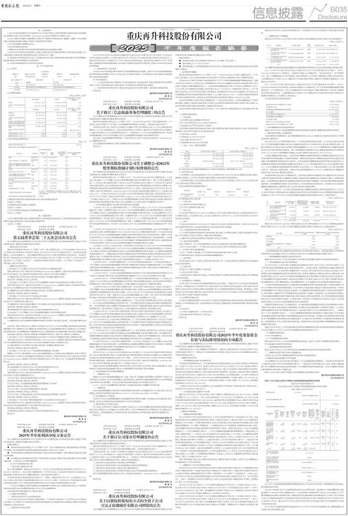 第一节重要提示 1.1本半年度报告摘要来自半年度报告全文,为全面了解本公司的经营成果、财务状况及未来发展规划,投资者应当到上海证券交易所 www.sse.com.cn网站仔细阅读半年度报告全文。 1.2本公司董事会及董事、高级管理人员保证半年度报告内容的真实性、准确性、完整性,不存在虚假记载、误导性陈述或重大遗漏,并承担个别和连带的法律责任。 1.3公司全体董事出席董事会会议。 1.4本半年度报告未经审计。 1.5董事会决议通过的本报告期利润分配预案或公积金转增股本预案 公司2025年半年度利润分配预案:公司拟以实施利润分配方案时股权登记日的总股本为基数,以未分配利润向全体股东每10股派发现金股利人民币0.20元(含税)。 在实施权益分派的股权登记日前,公司总股本发生变动的,拟维持每股分配金额不变,相应调整分配总额,剩余未分配利润结转以后年度分配。 以上利润分配预案尚待公司股东会审议批准。 第二节公司基本情况 2.1公司简介 ■ ■ 2.2主要财务数据 单位:元币种:人民币 ■ 2.3前10名股东持股情况表 单位: 股 ■ 2.4截至报告期末的优先股股东总数、前10名优先股股东情况表 □适用 √不适用 2.5控股股东或实际控制人变更情况 □适用 √不适用 2.6在半年度报告批准报出日存续的债券情况 □适用 √不适用 第三节重要事项 公司应当根据重要性原则,说明报告期内公司经营情况的重大变化,以及报告期内发生的对公司经营情况有重大影响和预计未来会有重大影响的事项 □适用 √不适用 证券代码:603601 证券简称:再升科技 公告编号:临2025-067 债券代码:113657 债券简称:再22转债 重庆再升科技股份有限公司 第五届董事会第二十五次会议决议公告 本公司董事会及全体董事保证本公告内容不存在任何虚假记载、误导性陈述或者重大遗漏,并对其内容的真实性、准确性和完整性承担法律责任。 一、董事会会议召开情况: 重庆再升科技股份有限公司(以下简称“公司”)第五届董事会第二十五次会议通知于2025年8月8日以传真、电话、邮件或专人送达等方式发出,会议于2025年8月20日以现场方式召开。本次会议应出席董事8人,实际出席董事8人。会议由董事长郭茂先生主持,公司部分高级管理人员列席会议。会议的召集、召开、表决程序及审议事项符合《中华人民共和国公司法》(以下简称“《公司法》”)《中华人民共和国证券法》(以下简称“《证券法》”)《重庆再升科技股份有限公司章程》(以下简称“《公司章程》”)等的规定,会议合法有效。 二、董事会会议审议情况: 1、审议通过了《关于确认公司2025年半年度报告全文及摘要的议案》 具体内容详见公司在上海证券交易所网站www.sse.com.cn披露的《重庆再升科技股份有限公司2025年半年度报告》及《重庆再升科技股份有限公司2025年半年度报告摘要》。 公司董事会审计委员会事前已审议通过该议案,并同意提交董事会审议。 表决结果:8票同意,0票反对,0票弃权。 2、审议通过了《关于确认公司2025年半年度募集资金存放与实际使用情况的专项报告的议案》 具体内容详见公司在上海证券交易所网站(www.sse.com.cn)披露的《重庆再升科技股份有限公司2025年半年度募集资金存放与实际使用情况的专项报告》。 公司董事会审计委员会事前已审议通过该议案,并同意提交董事会审议。 表决结果:8票同意,0票反对,0票弃权。 3、审议通过了《公司2025年半年度现金分红预案》 具体内容详见公司在上海证券交易所网站(www.sse.com.cn)披露的《重庆再升科技股份有限公司2025年半年度利润分配方案公告》。 公司董事会审计委员会和独立董事专门会议事前已审议通过该议案,并同意提交董事会审议。 表决结果:8票同意,0票反对,0票弃权。 该议案尚需提交公司股东会审议,召开股东会的通知将另行公告。 4、审议通过了《关于调整公司2022年股票期权激励计划行权价格的议案》 具体内容详见公司在上海证券交易所网站(www.sse.com.cn)披露的《重庆再升科技股份有限公司关于调整公司2022年股票期权激励计划行权价格的公告》。 公司董事会审计委员会和董事会薪酬和考核委员会事前已审议通过该议案,并同意提交董事会审议。 国浩律师(重庆)事务所认为:截至本法律意见书出具之日,公司本次调整已取得现阶段必要的批准和授权,符合《管理办法》及《激励计划》的相关规定;公司本次调整事项符合《管理办法》及《激励计划》的相关规定。本次调整尚需公司按照相关法律、法规及规范性文件的规定履行相应的信息披露义务。 表决结果:5票同意,0票反对,0票弃权;关联董事刘秀琴女士、陶伟先生、谢佳女士回避表决。 5、审议通过了《关于以债权转股权的方式向全资子公司宣汉正原微玻纤有限公司增资的议案》 具体内容详见公司在上海证券交易所网站(www.sse.com.cn)披露的《重庆再升科技股份有限公司关于以债权转股权的方式向全资子公司宣汉正原微玻纤有限公司增资的公告》。 公司独立董事专门会议事前已审议通过该议案,并同意提交董事会审议。 表决结果:8票同意,0票反对,0票弃权。 6、审议通过了《关于修订公司〈信息披露事务管理制度〉的议案》 根据2025年7月1日起实施的《上市公司信息披露管理办法》及相关法律法规的规定,结合公司的实际情况及需求,公司拟对《信息披露事务管理制度》