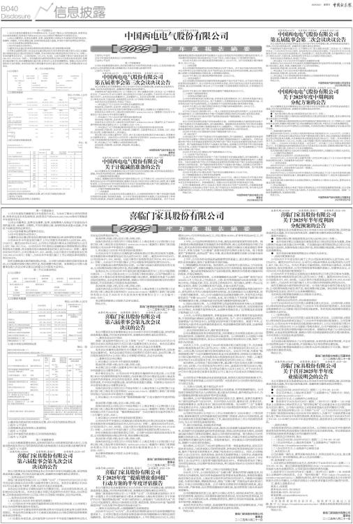 第一节重要提示 1.1本半年度报告摘要来自半年度报告全文,为全面了解本公司的经营成果、财务状况及未来发展规划,投资者应当到www.sse.com.cn网站仔细阅读半年度报告全文。 1.2本公司董事会、监事会及董事、监事、高级管理人员保证半年度报告内容的真实性、准确性、完整性,不存在虚假记载、误导性陈述或重大遗漏,并承担个别和连带的法律责任。 1.3公司全体董事出席董事会会议。 1.4本半年度报告未经审计。 1.5董事会决议通过的本报告期利润分配预案或公积金转增股本预案 公司第五届董事会第三次会议审议通过的2025年度中期利润分配方案为:拟以实施权益分派股权登记日登记的总股本为基数,向全体股东每10股派发现金红利0.47元(含税),至本次董事会召开日,公司总股本5,125,882,352股,以此为基数计算共计派发现金红利240,916,470.54元(含税)。在实施权益分派的股权登记日前公司总股本发生变动的,拟维持分配总额不变,相应调整每股分配比例,并将另行公告具体调整情况。根据公司2024年年度股东大会的授权,本次利润分配方案经董事会审议通过后即可实施,无需提交股东大会审议。 第二节公司基本情况 2.1公司简介 ■ ■ 2.2主要财务数据 单位:元币种:人民币 ■ 2.3前10名股东持股情况表 单位: 股 ■ 2.4截至报告期末的优先股股东总数、前10名优先股股东情况表 □适用√不适用 2.5控股股东或实际控制人变更情况 □适用√不适用 2.6在半年度报告批准报出日存续的债券情况 □适用√不适用 第三节重要事项 公司应当根据重要性原则,说明报告期内公司经营情况的重大变化,以及报告期内发生的对公司经营情况有重大影响和预计未来会有重大影响的事项 □适用√不适用 证券代码:601179 证券简称:中国西电 公告编号:2025-032 中国西电电气股份有限公司 第五届董事会第三次会议决议公告 本公司董事会及全体董事保证本公告内容不存在任何虚假记载、误导性陈述或者重大遗漏,并对其内容的真实性、准确性和完整性承担法律责任。 中国西电电气股份有限公司(以下简称公司)第五届董事会第三次会议(以下简称本次会议)于2025年8月10日以邮件、短信和电话方式发出会议通知,于2025年8月20日以现场方式召开,本次会议应出席董事9人,实到董事9人。本次会议的召集、召开程序符合《公司法》等有关法律、行政法规、其他规范性文件及《公司章程》的相关规定。 本次会议经过有效表决,形成以下决议: 一、审议通过了关于2025年半年度报告及摘要的议案 表决结果:同意9票、反对0票、弃权0票,审议通过。 该议案已经公司审计及关联交易控制委员会审议通过,同意提交公司董事会审议。 具体详见公司同日在上海证券交易所网站(www.sse.com.cn)披露的《2025年半年度报告》及《2025年半年度报告摘要》。 二、审议通过了关于2025年度中期利润分配的议案 表决结果:同意9票、反对0票、弃权0票,审议通过。 具体详见公司同日在上海证券交易所网站(www.sse.com.cn)披露的《关于2025年度中期利润分配方案的公告》(公告编号:2025-034)。 三、审议通过了关于西电集团财务有限责任公司风险持续评估报告的议案 表决结果:同意3票、反对0票、弃权0票、回避6票(关联董事赵永志、朱琦琦、马玎、刘克民、沈志翔、方楠回避表决),审议通过。 该议案已经公司独立董事专门会议、审计及关联交易控制委员会审议通过,同意提交公司董事会审议。具体详见公司同日在上海证券交易所网站(www.sse.com.cn)披露的《关于西电集团财务有限责任公司的风险持续评估报告》。 四、审议通过了关于调整公司组织机构的议案 表决结果:同意9票、反对0票、弃权0票,审议通过。 特此公告。 中国西电电气股份有限公司 董事会 2025年8月21日 证券代码:601179 证券简称:中国西电 公告编号:2025-035 中国西电电气股份有限公司 关于计提减值准备的公告 本公司董事会及全体董事保证本公告内容不存在任何虚假记载、误导性陈述或者重大遗漏,并对其内容的真实性、准确性和完整性承担法律责任。 一、计提减值准备情况概述 为真实、准确地反映中国西电电气股份有限公司(以下简称公司)2025年6月30日的财务状况及2025年半年度的经营成果,根据《企业会计准则》和公司相关会计政策,基于谨慎性原则,公司对2025年半年度财务报告合并会计报表范围内相关资产进行减值测试,对存在减值迹象的资产计提了相应的减值准备,具体情况如下。 二、计提信用减值准备情况 (一)应收款项 对于应收款项,无论是否包含重大融资成分,公司始终按照相当于整个存续期内预期信用损失的金额计量其损失准备。对于存在客观证据表明存在减值,以及其他适用于单项评估的应收账款,单独进行减值测试,确认逾期信用损失,计提单项减值准备。对于不存在减值客观证据的应收账款或单项金融资产无法以合理成本评估预期信用损失的信息时,公司依据信用风险特征将应收款项划分为若干组合,在组合基础上计算预期信用损失。 2025年半年度公司计提应收款项坏账准备12,142.16万元,其中应收账款计提坏账准备10,385.13万元。 (二)应收票据 本公司依据信用风险特征将应收票据划分为若干组合,对于划分为组合的应收票据,本公司参考历史信用损失经验,结合当前状况以及对未来经济状况的预测,通过违约风险敞口和整个存续期预期信用损失