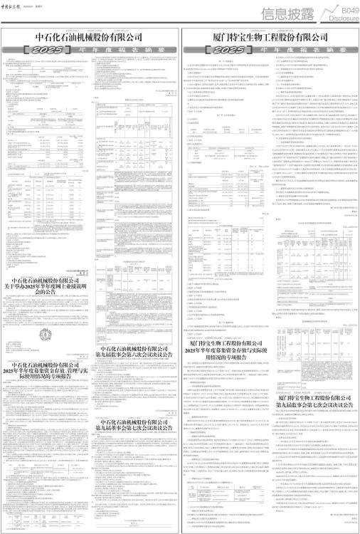 证券代码:000852 证券简称:石化机械 公告编号:2025-050 一、重要提示 本半年度报告摘要来自半年度报告全文,为全面了解本公司的经营成果、财务状况及未来发展规划,投资者应当到证监会指定媒体仔细阅读半年度报告全文。 董事、监事、高级管理人员异议声明 ■ 董事、监事、高级管理人员异议声明的风险提示 由于公司独立董事周京平先生正在接受重庆市监察委员会监察调查,无法正常履行职责,未签署关于2025年半年度报告的书面确认意见。 除下列董事外,其他董事亲自出席了审议本次半年报的董事会会议 ■ 非标准审计意见提示 □适用 √不适用 董事会审议的报告期利润分配预案或公积金转增股本预案 □适用 √不适用 公司计划不派发现金红利,不送红股,不以公积金转增股本。 董事会决议通过的本报告期优先股利润分配预案 □适用 √不适用 二、公司基本情况 1、公司简介 ■ 2、主要会计数据和财务指标 公司是否需追溯调整或重述以前年度会计数据 □是 √否 ■ 3、公司股东数量及持股情况 单位:股 ■ 持股5%以上股东、前10名股东及前10名无限售流通股股东参与转融通业务出借股份情况 □适用 √不适用 前10名股东及前10名无限售流通股股东因转融通出借/归还原因导致较上期发生变化 □适用 √不适用 4、控股股东或实际控制人变更情况 控股股东报告期内变更 □适用 √不适用 公司报告期控股股东未发生变更。 实际控制人报告期内变更 □适用 √不适用 公司报告期实际控制人未发生变更。 5、公司优先股股东总数及前10名优先股股东持股情况表 □适用 √不适用 公司报告期无优先股股东持股情况。 6、在半年度报告批准报出日存续的债券情况 □适用 √不适用 三、重要事项 无。 中石化石油机械股份有限公司 董 事 会 2025年8月21日 证券代码:000852 证券简称:石化机械 公告编号:2025-052 中石化石油机械股份有限公司 关于举办2025年半年度网上业绩说明会的公告 本公司及除独立董事周京平先生外的董事会成员保证信息披露的内容真实、准确、完整,没有虚假记载、误导性陈述或重大遗漏。 中石化石油机械股份有限公司(以下简称“公司”)拟于2025年8月21日披露2025年半年度报告。为便于广大投资者更加全面深入地了解公司2025年半年度经营情况和财务状况,公司定于2025年8月26日(星期二)15:30-17:00在“价值在线”(www.ir-online.cn)举办2025年半年度网上业绩说明会,与投资者进行沟通和交流。本次2025年半年度业绩说明会将采用网络互动的方式举行,投资者可登陆“价值在线”(www.ir-online.cn)参与本次半年度业绩说明会。 一、参加人员 出席本次2025年半年度业绩说明会的人员有:公司董事长王峻乔先生,独立董事郭炜先生,财务总监魏钢先生,董事会秘书王务红先生。(如遇特殊情况,参会人员可能进行调整。) 二、会前问题征集和参加方式 为充分尊重投资者,提升交流的针对性,现就公司2025年半年度业绩说明会提前向投资者公开征集问题,广泛听取投资者的意见和建议。投资者可于2025年8月26日(星期二)前访问https://eseb.cn/1qROyTKGuhW或使用微信扫描下方小程序码,点击“互动交流”进行会前提问。 2025年08月26日(星期二)15:30-17:00通过网址https://eseb.cn/1qROyTKGuhW或使用微信扫描下方小程序码即可进入参与互动交流。公司将在2025年半年度业绩说明会上,在信息披露允许范围内对投资者普遍关注的问题进行回答。 ■ 三、联系人及咨询办法 联系人:周艳霞、桂樨 电话:027-63496803 邮箱:security.oset@sinopec.com 欢迎广大投资者积极参与本次网上业绩说明会。 特此公告。 中石化石油机械股份有限公司 董 事 会 2025年8月21日 ■ 中石化石油机械股份有限公司 2025年半年度募集资金存放、管理与实际使用情况的专项报告 本公司及除独立董事周京平先生外的董事会成员保证信息披露的内容真实、准确、完整,没有虚假记载、误导性陈述或重大遗漏。 根据中国证券监督管理委员会《上市公司募集资金监管规则》《深圳证券交易所上市公司自律监管指引第1号一主板上市公司规范运作》以及《深圳证券交易所上市公司自律监管指南第2号一公告格式》的相关规定,中石化石油机械股份有限公司(以下简称“公司”或“本公司”)就2025年半年度募集资金存放、管理与实际使用情况报告如下: 一、募集资金基本情况 (一)实际募集资金金额和资金到账时间 根据中国证券监督管理委员会《关于核准中石化石油机械股份有限公司非公开发行股票的批复》(证监许可[2021]3929号),公司2022年以非公开发行方式发行A股普通股163,398,692股,发行价格为每股人民币6.12元,募集资金总额为999,999,995.04元,扣除与发行有关的费用人民币5,135,570.74元后,实际募集资金净额为人民币994,864,424.30元。上述资金已于2022年3月31日到位,并经立信会计师事务所(特殊普通合伙)审验,出具“信会师报字[2022]第ZK10077号”《验资报告》。 (二)以前年度已使用金额、本年度使用金额及当前余额 公司2022年非公开发行股票募集资金于2022年3月31日募集到账,2022年度公司实际使用募集资金587,893,861.64元。收到专户存款利息扣除银行手续费的净额8,675,923.33元。 2023年度公司实际使用募集资金33,767,538.53元,收到专户存款利息收入扣除银行手续费的净额8,350,048.91元。 2024年度公司实际使用募集资金66,235,748.75元,收到专户存款利