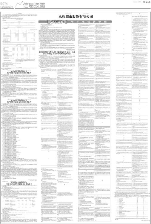 第一节 重要提示 1.1本半年度报告摘要来自半年度报告全文,为全面了解本公司的经营成果、财务状况及未来发展规划,投资者应当到http://www.sse.com.cn网站仔细阅读半年度报告全文。 1.2本公司董事会、监事会及董事、监事、高级管理人员保证半年度报告内容的真实性、准确性、完整性,不存在虚假记载、误导性陈述或重大遗漏,并承担个别和连带的法律责任。 1.3公司全体董事出席董事会会议。 1.4本半年度报告未经审计。 1.5董事会决议通过的本报告期利润分配预案或公积金转增股本预案 不适用 第二节 公司基本情况 2.1公司简介 ■ ■ 2.2主要财务数据 单位:元 币种:人民币 ■ 2.3前10名股东持股情况表 单位: 股 ■ 2.4截至报告期末的优先股股东总数、前10名优先股股东情况表 □适用 √不适用 2.5控股股东或实际控制人变更情况 □适用 √不适用 2.6在半年度报告批准报出日存续的债券情况 □适用 √不适用 第三节 重要事项 公司应当根据重要性原则,说明报告期内公司经营情况的重大变化,以及报告期内发生的对公司经营情况有重大影响和预计未来会有重大影响的事项 □适用 √不适用 证券代码:601933 证券简称:永辉超市 公告编号:2025-045 永辉超市股份有限公司 第六届监事会第四次会议决议公告 本公司及监事会全体成员保证本公告内容不存在任何虚假记载、误导性陈述或者重大遗漏,并对其内容的真实性、准确性和完整性承担法律责任。 永辉超市股份有限公司(下称“公司”)第六届监事会第四次会议于2025年8月19日在公司左海总部六楼会议室召开。会议应出席监事3名, 实际到会监事3名。会议由监事会主席吴乐峰先生主持,董事会秘书列席会议。会议的通知、召开符合《中华人民共和国公司法》及其他相关规定。经全体出席会议的监事审议和表决, 会议审议并通过如下决议: 一、关于公司2025年上半年财务预算执行情况的议案 2025年公司继续贯彻落实整体战略与经营的深度转型工作。公司上半年调改开业门店93家,截至2025年6月30日累计调改门店数量达124家。同时,公司上半年关闭227家亏损门店。报告期公司实现营业收入299.48亿元,较上年同期下降20.73%,归母净利润-2.41亿元,较上年同比减少5.16亿元。 2025年下半年,公司将继续推进门店调改升级,夯实内功和外拓合作并举。对内夯实内功,强化内部能力建设,包括提升门店顾客体验与购物环境、通过标准化流程、数字化管理员工培训等手段推动门店运营管理优化升级、加强商品力建设与品控管理以及基层员工能力和激励建设等措施做好经营转型工作。对外拓展,学习引进胖东来模式,结合公司实际情况与区域市场特点,因地适宜,并在省区进行逐步试点落地,有序推进在全国范围内门店商品品质、门店环境体验等方面的全面提升。 (以上议案同意票3票、反对票0票、弃权票0票) 二、关于公司补充2025年关联交易计划的议案 具体内容详见公司同日披露于上海证券交易所网站(www.sse.com.cn)的《永辉超市股份有限公司关于补充2025年关联交易计划的公告》(公告编号:2025-046)。 (以上议案同意票3票、反对票0票、弃权票0票) 三、关于取消监事会并修订《公司章程》及相关议事规则的议案 根据《中华人民共和国公司法》《中华人民共和国证券法》《上市公司章程指引(2025年修订)》等法律法规、规范性文件的最新规定,结合公司的实际发展和经营状况,公司拟不再设置监事会,监事会的职权由公司董事会审计委员会行使,《监事会议事规则》等监事会相关制度相应废止,并对《公司章程》《股东会议事规则》《董事会议事规则》进行修订。 具体内容详见公司同日披露于上海证券交易所网站(www.sse.com.cn)的《永辉超市股份有限公司关于取消监事会、修订〈公司章程〉及制定、修订管理制度的公告》(公告编号:2025-047)。 (以上议案同意票3票、反对票0票、弃权票0票) 该议案尚需提交股东会审议。 四、关于批准报出《永辉超市股份有限公司2025年半年度报告》及其摘要的议案 根据有关法律、法规及《上海证券交易所股票上市规则》,公司编制了《永辉超市股份有限公司2025年半年度报告》。报告从公司基本情况、股本变动及股东情况、公司治理情况、董事会工作情况、公司重大事项、2025年半年度财务报表及附注(未经审计)等各方面如实反映了公司2025年上半年整体经营运行情况。具体详见公司披露的《永辉超市股份有限公司2025年半年度报告》及其摘要。 (以上议案同意票3票、反对票0票、弃权票0票) 特此公告。 永辉超市股份有限公司监事会 二〇二五年八月二十一日 证券代码:601933 证券简称:永辉超市 公告编号:2025-044 永辉超市股份有限公司 第六届董事会第五次会议决议公告 本公司及董事会全体成员保证本公告内容不存在任何虚假记载、误导性陈述或者重大遗漏,并对其内容的真实性、准确性和完整性承担法律责任。 永辉超市股份有限公司(下称“公司”)第六届董事会第五次会议于2025年8月19日在公司左海总部六楼会议室以现场结合通讯方式召开。会议应出席董事9人,实际出席会议董事9人。公司监事和高级管理人员列席本次会议。会议的通知、召开符合《中华人民共和国公司法》(以下简称《公司法》)及其他相关规定。经全体董事审议和表决,会议通过如下决议: 一、关于公司2025年上半年财务预算执