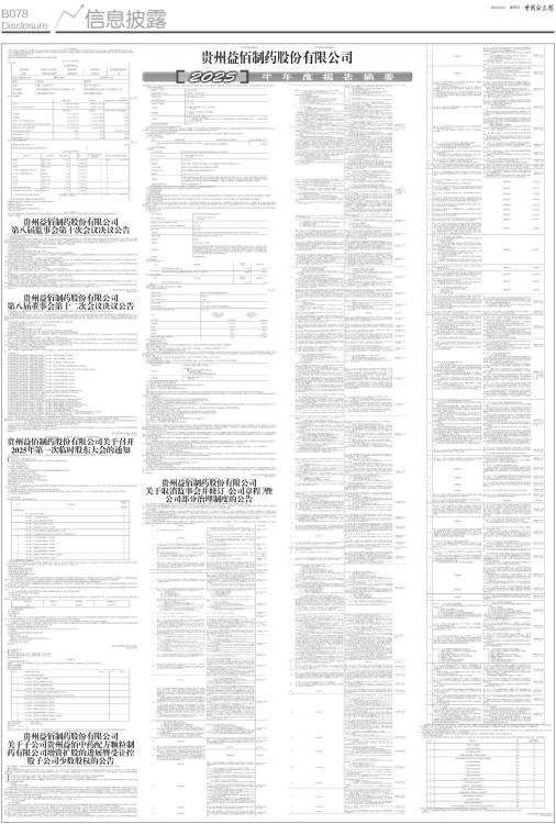 第一节 重要提示 1.1本半年度报告摘要来自半年度报告全文,为全面了解本公司的经营成果、财务状况及未来发展规划,投资者应当到http://www.sse.com.cn网站仔细阅读半年度报告全文。 1.2本公司董事会、监事会及董事、监事、高级管理人员保证半年度报告内容的真实性、准确性、完整性,不存在虚假记载、误导性陈述或重大遗漏,并承担个别和连带的法律责任。 1.3公司全体董事出席董事会会议。 1.4本半年度报告未经审计。 1.5董事会决议通过的本报告期利润分配预案或公积金转增股本预案 无 第二节 公司基本情况 2.1公司简介 ■ ■ 2.2主要财务数据 单位:元 币种:人民币 ■ 2.3前10名股东持股情况表 单位: 股 ■ 2.4截至报告期末的优先股股东总数、前10名优先股股东情况表 □适用 √不适用 2.5控股股东或实际控制人变更情况 □适用 √不适用 2.6在半年度报告批准报出日存续的债券情况 □适用 √不适用 第三节 重要事项 公司应当根据重要性原则,说明报告期内公司经营情况的重大变化,以及报告期内发生的对公司经营情况有重大影响和预计未来会有重大影响的事项 □适用 √不适用 证券代码:600594 证券简称:益佰制药 公告编号:2025-023 贵州益佰制药股份有限公司 第八届监事会第十次会议决议公告 本公司监事会及全体监事保证本公告内容不存在任何虚假记载、误导性陈述或者重大遗漏,并对其内容的真实性、准确性和完整性承担法律责任。 一、监事会会议召开情况 1、贵州益佰制药股份有限公司(以下简称“公司”)第八届监事会第十次会议通知于2025年8月8日以电子邮件等方式送达全体监事,会议增加临时议案《关于受让控股子公司少数股权的议案》的通知于2025年8月19日以电子邮件等方式送达全体监事,全体监事一致同意增加临时议案《关于受让控股子公司少数股权的议案》,并同意本次增加临时议案通知的发出豁免时限的要求,本次会议召集人监事会主席姜韬先生在会议上作出了说明。本次会议于2025年8月19日在公司行政楼会议室以现场会议方式召开。 2、本次会议应出席监事3人,实际出席监事3人。本次会议由监事会主席姜韬先生召集和主持。 3、公司董事会秘书蒋先洪先生列席了会议。 4、本次会议的召集和召开符合《公司法》和《公司章程》等相关规定。 二、监事会会议审议情况 本次会议以记名投票表决方式审议通过了如下议案: 1、会议以3票同意,0票弃权,0票反对,审议通过了《公司2025年半年度报告全文及其摘要》; 详情请参见公司于2025年8月21日披露在《中国证券报》《证券时报》《上海证券报》《证券日报》和上海证券交易所网站(http://www.sse.com.cn)上的《贵州益佰制药股份有限公司2025年半年度报告》全文及其摘要。 2、会议以3票同意,0票弃权,0票反对,审议通过了《关于取消监事会的议案》; 为进一步规范公司运作,不断完善公司治理结构,根据《中华人民共和国公司法》、《上市公司章程指引》等相关法律法规及规范性文件,并结合公司实际情况,公司拟取消监事会,原监事会法定职权将由董事会审计委员会承接,公司《监事会议事规则》同步废止。 详情请参见公司于2025年8月21日披露在《中国证券报》《证券时报》《上海证券报》《证券日报》和上海证券交易所网站(http://www.sse.com.cn)上的《贵州益佰制药股份有限公司关于取消监事会并修订〈公司章程〉暨公司部分治理制度的公告》(公告编号:2025-024)。 本议案尚需提交公司2025年第一次临时股东大会审议。 3、会议以3票同意,0票弃权,0票反对,审议通过了《关于修订〈公司章程〉的议案》; 为进一步完善公司治理结构,根据《公司法》《上市公司章程指引》《上海证券交易所股票上市规则》等相关法律法规的规定,结合公司的实际情况,公司对《公司章程》相关条款进行了修订。 详情请参见公司于2025年8月21日披露在《中国证券报》《证券时报》《上海证券报》《证券日报》和上海证券交易所网站(http://www.sse.com.cn)上的《贵州益佰制药股份有限公司关于取消监事会并修订〈公司章程〉暨公司部分治理制度的公告》(公告编号:2025-024)。 本议案尚需提交公司2025年第一次临时股东大会审议。 4、会议以3票同意,0票弃权,0票反对,审议通过了《关于受让控股子公司少数股权的议案》。 公司拟以人民币8,000万元受让贵州省农业农村现代化发展股权投资基金合伙企业(有限合伙)持有的本公司控股子公司贵州益佰中药配方颗粒制药有限公司40.03%股权。本次受让完成后,公司将持有贵州益佰中药配方颗粒制药有限公司100%股权。 详情请参见公司于2025年8月21日披露在《中国证券报》《证券时报》《上海证券报》《证券日报》和上海证券交易所网站(http://www.sse.com.cn)上的《贵州益佰制药股份有限公司关于子公司贵州益佰中药配方颗粒制药有限公司增资扩股的进展暨受让控股子公司少数股权的公告》(公告编号:2025-025)。 特此公告。 贵州益佰制药股份有限公司监事会 2025年8月21日 证券代码:600594 证券简称:益佰制药 公告编号:2025-022 贵州益佰制药股份有限公司 第八届董事会第十二次会议决议公告 本公司董事会及全体董事保证本公告内容不存在任何虚假记载、误导性陈述或者重大遗漏,并对其内容的真实性、准确性和完整性承担法律责任。 一、董事会会议召开情况 1、贵州益佰制药股