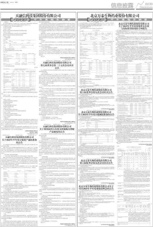 公司代码:603392 公司简称:万泰生物 北京万泰生物药业股份有限公司 第一节重要提示 1.1本半年度报告摘要来自半年度报告全文,为全面了解本公司的经营成果、财务状况及未来发展规划,投资者应当到http://www.sse.com.cn网站仔细阅读半年度报告全文。 1.2本公司董事会、监事会及董事、监事、高级管理人员保证半年度报告内容的真实性、准确性、完整性,不存在虚假记载、误导性陈述或重大遗漏,并承担个别和连带的法律责任。 1.3公司全体董事出席董事会会议。 1.4本半年度报告未经审计。 1.5董事会决议通过的本报告期利润分配预案或公积金转增股本预案 无 第二节公司基本情况 2.1公司简介 ■ ■ 2.2主要财务数据 单位:元币种:人民币 ■ 2.3前10名股东持股情况表 单位:股 ■ 2.4截至报告期末的优先股股东总数、前10名优先股股东情况表 □适用 √不适用 2.5控股股东或实际控制人变更情况 □适用 √不适用 2.6在半年度报告批准报出日存续的债券情况 □适用 √不适用 第三节重要事项 公司应当根据重要性原则,说明报告期内公司经营情况的重大变化,以及报告期内发生的对公司经营情况有重大影响和预计未来会有重大影响的事项 □适用 √不适用 证券代码:603392 证券简称:万泰生物 公告编号:2025-040 北京万泰生物药业股份有限公司 第六届董事会第九次会议决议公告 本公司董事会及全体董事保证本公告内容不存在任何虚假记载、误导性陈述或者重大遗漏,并对其内容的真实性、准确性和完整性承担法律责任。 一、董事会会议召开情况 北京万泰生物药业股份有限公司(以下简称“公司”)于2025年8月10日以电子邮件方式向全体董事发出第六届董事会第九次会议召开通知和会议材料。本次会议于2025年8月20日以通讯方式召开。本次会议由公司董事长邱子欣先生主持,应出席董事7人,实际出席董事7人。本次会议的出席人数、召开和表决方式符合《公司法》等法律、法规及《公司章程》的相关规定,合法有效。 二、董事会会议审议情况 1、审议通过了《2025年半年度报告全文及其摘要》 具体内容详见公司于指定信息披露媒体披露的公司2025年半年度报告全文及其摘要。 表决结果:同意7票、反对0票、弃权0票。 该议案已经第六届董事会审计委员会审议通过。 2、审议通过了《关于公司2025年半年度募集资金存放与实际使用情况的专项报告的议案》 具体内容详见公司于指定信息披露媒体披露的《北京万泰生物药业股份有限公司关于2025年半年度募集资金存放与实际使用情况的专项报告》(公告编号:2025-042)。 表决结果:同意7票、反对0票、弃权0票。 特此公告。 北京万泰生物药业股份有限公司董事会 2025年8月21日 证券代码:603392 证券简称:万泰生物 公告编号:2025-044 北京万泰生物药业股份有限公司 关于2025年半年度计提减值准备的公告 本公司董事会及全体董事保证本公告内容不存在任何虚假记载、误导性陈述或者重大遗漏,并对其内容的真实性、准确性和完整性承担法律责任。 一、本次计提减值准备情况概述 根据《企业会计准则》以及公司会计政策的相关规定,为更加真实、准确地反映公司截至2025年6月30日的资产状况和财务状况,公司及子公司对存在减值迹象的资产采取必要的减值测试和评估,基于谨慎性原则,对可能发生资产减值损失的资产计提减值准备,具体情况如下: ■ (1)公司及子公司应收账款的形成主要来自于疫苗产品销售,客户为全国各区县疾控中心。疾控中心疫苗采购归属于地方财政管理,存在部分地区财政资金紧张,导致未能如期支付货款的情况增加。因此,公司基于账龄情况计提的应收账款信用减值损失也随之增加。公司及子公司一直密切关注行业政策,重视信用风险管控、账期跟进以及与疾控中心的及时沟通,持续加强应收账款管理,进一步降低坏账发生的风险。 二、本次计提减值准备的具体说明 (一)信用减值损失 根据《企业会计准则第22号金融工具确认和计量》以及公司会计政策,公司应收款项、其他应收款以账龄为基础确认信用减值损失,计算方法具体如下: ■ 基于以上账龄计算方法,2025年半年度计提信用减值损失5,743万元。 (二)资产减值损失 1、存货跌价损失 公司严格根据会计准则相关规定,对存货进行减值测试,根据《企业会计准则第1号一存货》要求,在资产负债表日,存货按照成本与可变现净值孰低计量。直接用于出售的存货,在正常生产经营过程中以该存货的估计售价减去估计的销售费用和相关税费后的金额确定其可变现净值;需要经过加工的存货,在正常生产经营过程中以所生产的产成品的估计售价减去至完工时估计将要发生的成本、估计的销售费用和相关税费后的金额确定其可变现净值;资产负债表日,同一项存货中一部分有合同价格约定、其他部分不存在合同价格的,分别确定其可变现净值,并与其对应的成本进行比较,分别确定存货跌价准备的计提或转回的金额。公司及子公司对存货进行了清查和资产减值测试,2025年半年度计提存货跌价损失2,342.62万元。 三、本次计提减值准备对公司的影响 公司2025年半年度计提资产及信用减值准备合计8,085.62万元,对公司2025年半年度合并利润总额影响8,085.62万元。本次计提各项资产减值准备符合《企业会计准则》规定及公司资产实际情况,能够真实客观反映公司截至2025年6月