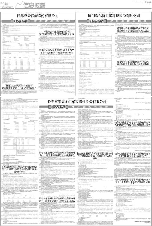 证券代码:002790 证券简称:瑞尔特 公告编号:2025-029 一、重要提示 本半年度报告摘要来自半年度报告全文,为全面了解本公司的经营成果、财务状况及未来发展规划,投资者应当到证监会指定媒体仔细阅读半年度报告全文。 所有董事均已出席了审议本报告的董事会会议。 非标准审计意见提示 □适用 √不适用 董事会审议的报告期利润分配预案或公积金转增股本预案 □适用 √不适用 公司计划不派发现金红利,不送红股,不以公积金转增股本。 董事会决议通过的本报告期优先股利润分配预案 □适用 √不适用 二、公司基本情况 1、公司简介 ■ 2、主要会计数据和财务指标 公司是否需追溯调整或重述以前年度会计数据 □是 √否 ■ 3、公司股东数量及持股情况 单位:股 ■ 持股5%以上股东、前10名股东及前10名无限售流通股股东参与转融通业务出借股份情况 □适用 √不适用 前10名股东及前10名无限售流通股股东因转融通出借/归还原因导致较上期发生变化 □适用 √不适用 4、控股股东或实际控制人变更情况 控股股东报告期内变更 □适用 √不适用 公司报告期控股股东未发生变更。 实际控制人报告期内变更 □适用 √不适用 公司报告期实际控制人未发生变更。 5、公司优先股股东总数及前10名优先股股东持股情况表 □适用 √不适用 公司报告期无优先股股东持股情况。 6、在半年度报告批准报出日存续的债券情况 □适用 √不适用 三、重要事项 公司基于未来发展战略规划及业务发展需要,为进一步提升公司的综合竞争力,促进可持续发展,经审慎研究决定通过公司实施建设“年产10万套装配式智能卫浴产品项目”,本项目初步预计投资总额为74,187万元(含土地费用、工程建设费用、设备投入费用、铺底流动资金等),最终项目投资总额以实际投资为准。公司于2024年11月12日召开第五届董事会第四次会议、第五届监事会第四次会议审议通过了《关于对外投资进行项目建设的议案》,董事会授权管理层具体推进落实该项目,包括但不限于办理项目审批备案手续、签署与本项目相关的各类协议等,具体内容详见公司于2024年11月13日在巨潮资讯网(www.cninfo.com.cn)上披露的《关于对外投资进行项目建设的公告》(公告编号:2024-074)。报告期内,该项目正按规划有序推进项目建设实施工作,公司将严格按照有关法律法规的要求履行信息披露义务。 证券代码:002790 证券简称:瑞尔特 公告编号:2025-027 厦门瑞尔特卫浴科技股份有限公司 第五届董事会第七次会议决议公告 本公司及董事会全体成员保证信息披露内容的真实、准确和完整,没有虚假记载、误导性陈述或重大遗漏。 一、董事会会议召开情况 厦门瑞尔特卫浴科技股份有限公司(以下简称“公司”)第五届董事会第七次(定期)会议(以下简称“会议”),由公司董事长召集。2025年8月15日,以电子邮件及电话方式向全体董事发出会议通知;2025年8月26日上午10时,在厦门市海沧区后祥路18号一楼会议室以现场结合通讯表决方式召开会议。 会议应出席的董事9人,实际出席会议的董事9人(其中,委托出席的董事0人,以通讯表决方式出席会议的董事4人),缺席会议的董事0人。副董事长王兵先生、董事邓光荣先生及独立董事罗立国先生、黄兴孪先生以通讯表决方式出席会议。会议由董事长罗远良先生主持,财务总监、董事会秘书及全体监事列席会议。 本次会议的召开符合《中华人民共和国公司法》《厦门瑞尔特卫浴科技股份有限公司章程》《厦门瑞尔特卫浴科技股份有限公司董事会议事规则》的相关规定, 会议决议合法、有效。 二、董事会会议审议情况 1、审议议案一《关于2025年半年度报告全文及其摘要的议案》 表决结果:同意票9票,反对票0票,弃权票0票,议案获得通过。 《厦门瑞尔特卫浴科技股份有限公司2025年半年度报告》《厦门瑞尔特卫浴科技股份有限公司2025年半年度报告摘要》与本决议同日发布公告于中国证监会指定信息披露网站巨潮资讯网(http://www.cninfo.com.cn),《厦门瑞尔特卫浴科技股份有限公司2025年半年度报告摘要》同时刊登公告于中国证监会指定信息披露报刊《证券时报》《上海证券报》《中国证券报》《证券日报》。 本议案已经第五届董事会审计委员会审议通过。 三、备查文件 1、《厦门瑞尔特卫浴科技股份有限公司第五届董事会第七次会议决议》; 2、《厦门瑞尔特卫浴科技股份有限公司2025年半年度报告》《厦门瑞尔特卫浴科技股份有限公司2025年半年度报告摘要》。 特此公告。 厦门瑞尔特卫浴科技股份有限公司董事会 2025年8月27日 证券代码:002790 证券简称:瑞尔特 公告编号:2025-028 厦门瑞尔特卫浴科技股份有限公司 第五届监事会第七次会议决议公告 本公司及监事会全体成员保证信息披露内容的真实、准确和完整,没有虚假记载、误导性陈述或重大遗漏。 一、监事会会议召开情况 厦门瑞尔特卫浴科技股份有限公司(以下简称“公司”)第五届监事会第七次(定期)会议(以下简称“会议”),由公司监事会主席召集。2025年8月15日,以电子邮件方式向全体监事发出会议通知;2025年8月26日14时,在厦门市海沧区后祥路18号一楼会议室召开现场会议。 会议应出席的监事3人,实际出席会议的监事3人(其中,委托出席的监事0人;以通讯表决方式出席会议的监事0人),超过半数。缺席会议的监事0人。会议由