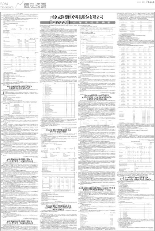 第一节 重要提示 1.1本半年度报告摘要来自半年度报告全文,为全面了解本公司的经营成果、财务状况及未来发展规划,投资者应当到上海证券交易所网站(http://www.sse.com.cn/)网站仔细阅读半年度报告全文。 1.2重大风险提示 公司已在本报告中详细阐述公司在经营过程中可能面临的各种风险及应对措施,敬请查阅本报告“第三节 管理层讨论与分析”之“四、风险因素”。 1.3本公司董事会、监事会及董事、监事、高级管理人员保证半年度报告内容的真实性、准确性、完整性,不存在虚假记载、误导性陈述或重大遗漏,并承担个别和连带的法律责任。 1.4公司全体董事出席董事会会议。 1.5本半年度报告未经审计。 1.6董事会决议通过的本报告期利润分配预案或公积金转增股本预案 不适用 1.7是否存在公司治理特殊安排等重要事项 □适用 √不适用 第二节 公司基本情况 2.1公司简介 公司股票简况 ■ 公司存托凭证简况 □适用 √不适用 联系人和联系方式 ■ 2.2主要财务数据 单位:元 币种:人民币 ■ 2.3前10名股东持股情况表 单位: 股 ■ 2.4前十名境内存托凭证持有人情况表 □适用 √不适用 2.5截至报告期末表决权数量前十名股东情况表 □适用 √不适用 2.6截至报告期末的优先股股东总数、前10名优先股股东情况表 □适用 √不适用 2.7控股股东或实际控制人变更情况 □适用 √不适用 2.8在半年度报告批准报出日存续的债券情况 □适用 √不适用 第三节 重要事项 公司应当根据重要性原则,说明报告期内公司经营情况的重大变化,以及报告期内发生的对公司经营情况有重大影响和预计未来会有重大影响的事项 □适用 √不适用 证券代码:688273 证券简称:麦澜德 公告编号:2025-033 南京麦澜德医疗科技股份有限公司 关于续聘会计师事务所的公告 本公司董事会及全体董事保证本公告内容不存在任何虚假记载、误导性陈述或者重大遗漏,并对其内容的真实性、准确性和完整性依法承担法律责任。 重要内容提示: ● 拟续聘的会计师事务所名称:中兴华会计师事务所(特殊普通合伙)(以下简称“中兴华”) ● 本事项尚需提交南京麦澜德医疗科技股份有限公司(以下简称“公司”或“本公司”)股东大会审议通过。 一、拟聘任会计师事务所的基本情况 (一)机构信息 1、基本信息 事务所名称:中兴华会计师事务所(特殊普通合伙) 成立日期:2013年11月4日 组织形式:特殊普通合伙企业 注册地址:北京市丰台区丽泽路20号院1号楼南楼20层 历史沿革:中兴华成立于1993年,2000年由国家工商管理总局核准,改制为“中兴华会计师事务所有限责任公司”。2009年吸收合并江苏富华会计师事务所,更名为“中兴华富华会计师事务所有限责任公司”。2013年公司进行合伙制转制,转制后的事务所名称为“中兴华会计师事务所(特殊普通合伙)”。 首席合伙人:李尊农 ■ 2、投资者保护能力 中兴华具有良好的投资者保护能力,已按照相关法律法规要求计提职业风险基金和购买职业保险,截至2024年末,计提职业风险基金10,450万元,购买的职业保险累计赔偿限额10,000万元,计提职业风险基金和购买职业保险符合相关规定。 近三年存在执业行为相关民事诉讼:在青岛亨达股份有限公司证券虚假陈述责任纠纷案中,中兴华被判定在20%的范围内对亨达公司承担责任部分承担连带赔偿责任。 3、诚信记录 近三年中兴华因执业行为受到刑事处罚0次、行政处罚4次、行政监管措施18次、自律监管措施2次、纪律处分1次。48名从业人员因执业行为受到刑事处罚0次、行政处罚14人次、行政监管措施41人次、自律监管措施2人次、纪律处分2人次。 (二)项目信息 1、基本信息 项目合伙人(项目负责合伙人):尤开兵先生,2005年成为注册会计师,2013年开始从事上市公司审计,2013年开始在中兴华执业。2024年开始为本公司提供审计服务,近三年为中信尼雅(600084)、麦澜德(688273)等上市公司签署审计报告。 签字注册会计师:尤文波先生,2009年成为注册会计师,2010年开始从事上市公司审计,2024年开始在中兴华执业。2024年开始为本公司提供审计服务,近三年为徐工机械(000425)、中信尼雅(600084)、麦澜德(688273)等上市公司提供审计服务。 质量控制复核人:施兴凤女士,2011年成为注册会计师,2009年开始从事上市公司审计,2019年开始在中兴华执业。2024年开始为本公司提供复核服务,近三年为哈森股份(603958)、实朴检测(301228)、力源科技(688565)等多家上市公司提供年报复核服务。 2、诚信记录 上述项目合伙人、质量控制复核人和本期签字会计师均具有丰富的证券服务业务经验和公司所在行业服务业务经验,近三年不存在因执业行为受到刑事处罚,受到证监会及其派出机构、行业主管部门等的行政处罚、监督管理措施,受到证券交易所、行业协会等自律组织的自律监管措施、纪律处分的情况。 3、独立性 中兴华及项目合伙人、签字注册会计师、项目质量控制复核人不存在可能影响独立性的情形。 4、审计收费 公司根据审计工作量及公允合理的定价原则确定年度审计费用,同时参考其他上市公司收费情况确定。公司2024年度审计(含内控审计)费用为人民币60万元(含税)。公司拟聘请中兴华执行本公司2025年度的审计工作,董事会将提请股东大会授权公司管理层根据审计要求和范围,按照市场原则与中兴华协商确定2025年度相关审计费用及签署相关协议