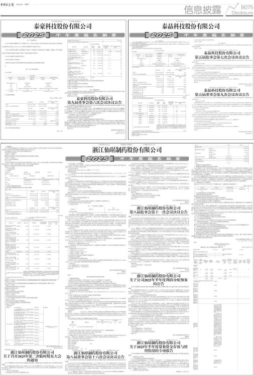 一、重要提示 本半年度报告摘要来自半年度报告全文,为全面了解本公司的经营成果、财务状况及未来发展规划,投资者应当到证监会指定媒体仔细阅读半年度报告全文。 所有董事均已出席了审议本报告的董事会会议。 非标准审计意见提示 □适用 √不适用 董事会审议的报告期利润分配预案或公积金转增股本预案 √适用 □不适用 是否以公积金转增股本 □是 √否 公司经本次董事会审议通过的利润分配预案为:以989,204,866股为基数,向全体股东每10股派发现金红利1元(含税),送红股0股(含税),不以公积金转增股本。 董事会决议通过的本报告期优先股利润分配预案 □适用 √不适用 二、公司基本情况 1、公司简介 ■ 2、主要会计数据和财务指标 公司是否需追溯调整或重述以前年度会计数据 □是 √否 ■ 3、公司股东数量及持股情况 单位:股 ■ 持股5%以上股东、前10名股东及前10名无限售流通股股东参与转融通业务出借股份情况 □适用 √不适用 前10名股东及前10名无限售流通股股东因转融通出借/归还原因导致较上期发生变化 □适用 √不适用 4、控股股东或实际控制人变更情况 控股股东报告期内变更 □适用 √不适用 公司报告期控股股东未发生变更。 实际控制人报告期内变更 □适用 √不适用 公司报告期实际控制人未发生变更。 5、公司优先股股东总数及前10名优先股股东持股情况表 □适用 √不适用 公司报告期无优先股股东持股情况。 6、在半年度报告批准报出日存续的债券情况 □适用 √不适用 三、重要事项 ■ 浙江仙琚制药股份有限公司 2025年8月26日 证券代码:002332 证券简称:仙琚制药 公告编号:2025-039 浙江仙琚制药股份有限公司 关于召开2025年第二次临时股东大会的通知 本公司及董事会全体成员保证信息披露内容的真实、准确和完整,没有虚假记载、误导性陈述或重大遗漏。 浙江仙琚制药股份有限公司(以下简称“公司”)第八届董事会第十六次会议审议通过了《关于召开2025年第二次临时股东大会的议案》,定于2025年9月19日召开公司2025年第二次临时股东大会,会议有关事项如下: 一、召开会议的基本情况 1、会议届次:2025年第二次临时股东大会 2、会议召集人:公司董事会 3、会议召开的合法、合规性:本次股东大会会议的召集、召开符合有关法律、行政法规、部门规章、规范性文件和《公司章程》的有关规定。 4、会议召开时间: 现场会议时间:2025年9月19日(星期五)下午 14:30 网络投票时间: (1)通过深圳证券交易所交易系统进行网络投票时间为2025年9月19日9:15-9:25,9:30-11:30 和 13:00-15:00。 (2)通过深圳证券交易所互联网投票系统开始投票的时间为2025年9月19日9:15- 15:00期间的任意时间。 5、会议召开方式: 本次股东大会采取现场表决与网络投票相结合的方式。公司将通过深圳证券交易所交易系统和互联网投票系统(http://wltp.cninfo.com.cn)向股东提供网络形式的投票平台,股东可在网络投票时间内通过上述系统行使表决权。公司股东应选择现场投票、网络投票中的一种方式,如果同一表决权出现重复投票表决的,以第一次投票表决结果为准。 6、股权登记日:2025年9 月16日(星期二) 7、会议出席对象 (1)在股权登记日持有公司股份的普通股股东或其代理人。 截至2025年9 月16日下午收市时在中国证券登记结算有限责任公司深圳分公司登记在册的公司全体股东均有权出席股东大会,并可以以书面形式委托代理人出席会议和参加表决,该股东代理人不必是本公司股东。 (2)公司董事、监事和高级管理人员。 (3)公司聘请的律师。 8、现场会议地点:浙江省仙居县福应街道现代工业集聚区丰溪西路15号 浙江仙琚制药股份有限公司五楼会议室 二、会议审议事项 表一 本次股东大会提案 ■ 上述议案经公司第八届董事会第十六次会议、公司第八届监事会第十一次会议审议通过,具体内容详见公司2025年8月27日刊登于《证券时报》《上海证券报》《中国证券报》《证券日报》及巨潮资讯网(www.cninfo.com.cn)的相关公告。 根据《上市公司股东大会规则》的要求,股东大会审议影响中小投资者利益的重大事项时,对中小投资者(中小投资者是指除上市公司董事、监事、高级管理人员以及单独或者合计持有上市公司5%以上股份的股东以外的其他股东)的表决应当单独计票,单独计票结果应当及时公开披露。公司将就本次股东大会审议事项1.00对中小投资者表决单独计票,单独计票结果将在本次股东大会决议公告中披露。 三、会议登记等事项 1、登记方式: (1)法人股东的法定代表人出席的,凭本人身份证、法定代表人身份证明书、法人单位营业执照复印件(加盖公章)、证券账户卡、单位持股凭证办理登记;法人股东委托代理人出席的,凭代理人的身份证、授权委托书、法人单位营业执照复印件(加盖公章)、证券账户卡、单位持股凭证办理登记。 (2)自然人股东亲自出席的,凭本人身份证、证券账户卡、持股凭证等办理登记;委托代理人出席的,凭代理人身份证、授权委托书、委托人的证券账户卡、持股凭证等办理登记。 (3)异地股东可凭以上有关证件采取信函或传真方式登记,不接受电话登记。信函或传真须在2025年9月18日11:30前送达本公司。信函或传真请注明“股东大会”字样。 2、登记时间:2025年9月18日(上午9:00-11:30) 3、登记地点:公司董事会秘书办公室 (1)联系地址: