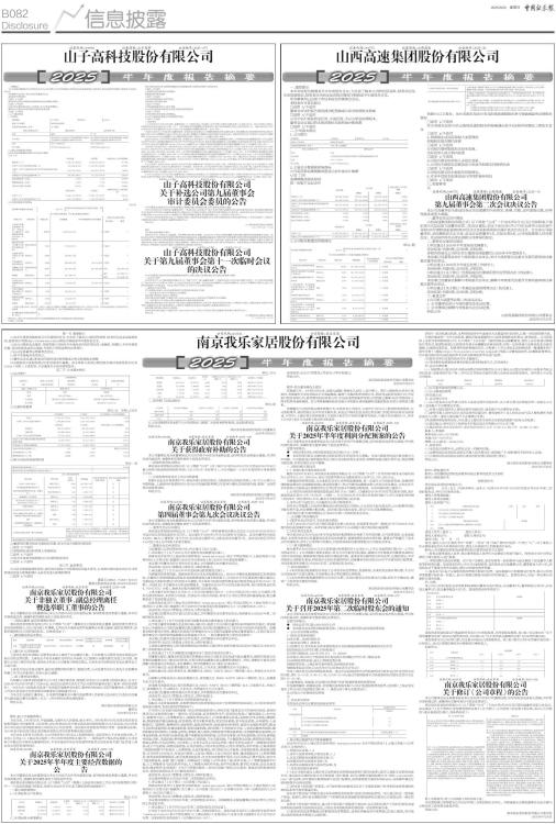 证券代码:000981 证券简称:山子高科 公告编号:2025-057 山子高科技股份有限公司 一、重要提示 本半年度报告摘要来自半年度报告全文,为全面了解本公司的经营成果、财务状况及未来发展规划,投资者应当到证监会指定媒体仔细阅读半年度报告全文。 所有董事均已出席了审议本报告的董事会会议。 非标准审计意见提示 □适用 √不适用 董事会审议的报告期利润分配预案或公积金转增股本预案 □适用 √不适用 公司计划不派发现金红利,不送红股,不以公积金转增股本。 董事会决议通过的本报告期优先股利润分配预案 □适用 √不适用 二、公司基本情况 1、公司简介 ■ 2、主要会计数据和财务指标 公司是否需追溯调整或重述以前年度会计数据 □是 √否 ■ 3、公司股东数量及持股情况 单位:股 ■ 持股5%以上股东、前10名股东及前10名无限售流通股股东参与转融通业务出借股份情况 □适用 √不适用 前10名股东及前10名无限售流通股股东因转融通出借/归还原因导致较上期发生变化 □适用 √不适用 4、控股股东或实际控制人变更情况 控股股东报告期内变更 □适用 √不适用 公司报告期控股股东未发生变更。 实际控制人报告期内变更 □适用 √不适用 公司报告期实际控制人未发生变更。 5、公司优先股股东总数及前10名优先股股东持股情况表 □适用 √不适用 公司报告期无优先股股东持股情况。 6、在半年度报告批准报出日存续的债券情况 □适用 √不适用 三、重要事项 1、公司于2024年7月25日召开第八届董事会第二十三次临时会议,审议通过《关于回购公司股份方案的议案》,公司拟以6亿元-10亿元回购公司股份,回购股份的价格为不超过1.60元/股(含)。本次回购股份的实施期限为自董事会审议通过本次回购股份方案之日起不超过6个月。具体内容详见公司于2024年8月2日在巨潮资讯网 (www.cninfo.com.cn)披露的《回购股份报告书》(2024-050)。 2024年12月31日,公司召开第九届董事会第二次临时会议审议通过《关于调整回购股份价格上限的议案》,具体调整包括:将回购股份的价格上限由不超过人民币1.60元/股调整为不超过人民币3.35元/股,除上述调整外,回购股份方案的其他内容未发生变化。具体内容详见公司于2025年01月02日在巨潮资讯网 (www.cninfo.com.cn)披露的《关于调整回购股份价格上限的公告》(公告编号:2024-096)。 2025年1月24日,公司召开第九届董事会第三次临时会议,审议通过了《关于延长股份回购期限的议案》。公司将股份回购实施期限延长六个月,延期至2025年7月24日止,即回购实施期限为自2024年7月25日至2025年7月24日。除延长回购实施期限外,本次回购股份方案的其他内容不变。具体内容详见公司于2025年1月25日在巨潮资讯网 (www.cninfo.com.cn)披露的《关于回购公司股份的进展暨延长股份回购实施期限的公告》(公告编号:2025-005)。 公司分别于2024年9月5日、2024年10月11日、2024年11月5日、2024年12月5日、2025年1月7日、2025年1月25日、2025年2月8日、2025年3月6日、2025年4月4日、2025年5月9日、2025年6月6日、2025年7月02日在指定媒体披露《关于回购公司股份的进展公告》(公告编号:2024-063、2024-067、2024-078、2024-086、2025-009、2025-012、2025-016)、《关于股份回购期限过半尚未实施的进展公告》(公告编号:2024-076)、《关于回购股份进展暨首次回购公司股份的公告》(公告编号:2025-004)、《关于回购公司股份的进展暨延长股份回购实施期限的公告》(公告编号:2025-005)、《关于股份回购期限过半暨回购进展的公告》(公告编号:2025-038)、《关于股份回购的进展公告》(公告编号:2025-043、2025-047)。截至2025年7月24日,公司本次回购股份的实施期限届满,回购方案尚未实施完毕。2025年7月26日,公司在巨潮资讯网 (www.cninfo.com.cn)对外披露《关于股份回购实施结果暨股份变动的公告》(公告编号:2025-052)。 2、公司分别于 2025年4月8日、2025年4月24日召开第九届董事会第五次临时会议、2025 年第一次临时股东大会,审议通过《关于出售控股子公司股权暨关联交易的议案》,同意公司出售标的公司 100%股权。2025年4月,公司与交易对手方签订《股权转让协议》,双方达成一致,交易对手方将受让公司持有标的公司100%股权,交易对价为人民币4.735亿元人民币。具体内容详见公司分别于2025年4月9日、2025年4月25日在巨潮资讯网 (www.cninfo.com.cn)披露的相关公告(公告编号:2025-018、2025-022)。 3、公司于2025年5月15日召开第九届董事会第八次临时会议审议通过《关于出售控股子公司股权的议案》,同意公司控股子公司山子汽车出售其持有黑龙江云枫汽车有限公司80%的股权。具体内容详见公司于2025年5月17日在巨潮资讯网 (www.cninfo.com.cn)披露的相关公告(公告编号:2025-039) 股票简称:山子高科 股票代码:000981 公告编号:2025-060 山子高科技股份有限公司 关于补选公司第九届董事会 审计委员会委员的公告 本公司董事会全体成员保证公告内容的真实、准确和完整,没有虚假记载、误导 性陈述或者重大遗漏。 公司于2025年8月27日召开第九届董事会第十一次临时会议,审议通过了《关于补选公司第九届董事会审计委员会委员的议案》,因原非独立董事张民先生于2025年7月辞去第九届董事会董事职务,辞职后不在公司担任任何职务,辞职报告自提交董事会之日起生效。具体内容详见公司于2025年7月30日在巨潮资讯网(www.cninf