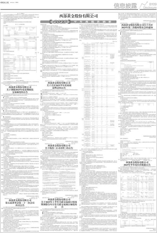 第一节 重要提示 1.1本半年度报告摘要来自半年度报告全文,为全面了解本公司的经营成果、财务状况及未来发展规划,投资者应当到www.sse.com.cn网站仔细阅读半年度报告全文。 1.2本公司董事会及董事、高级管理人员保证半年度报告内容的真实性、准确性、完整性,不存在虚假记载、误导性陈述或重大遗漏,并承担个别和连带的法律责任。 1.3公司全体董事出席董事会会议。 1.4本半年度报告未经审计。 1.5董事会决议通过的本报告期利润分配预案或公积金转增股本预案 不适用 第二节 公司基本情况 2.1公司简介 ■ ■ 2.2主要财务数据 单位:元 币种:人民币 ■ 2.3前10名股东持股情况表 单位: 股 ■ 2.4截至报告期末的优先股股东总数、前10名优先股股东情况表 □适用 √不适用 2.5控股股东或实际控制人变更情况 □适用 √不适用 2.6在半年度报告批准报出日存续的债券情况 □适用 √不适用 第三节 重要事项 公司应当根据重要性原则,说明报告期内公司经营情况的重大变化,以及报告期内发生的对公司经营情况有重大影响和预计未来会有重大影响的事项 □适用 √不适用 证券代码:601069 证券简称:西部黄金 公告编号:2025-060 西部黄金股份有限公司 关于调整2025年度套期保值 交易额度的公告 本公司董事会及全体董事保证本公告内容不存在任何虚假记载、误导性陈述或者重大遗漏,并对其内容的真实性、准确性和完整性依法承担法律责任。 重要内容提示: ● 交易目的、交易品种、交易工具、交易场所和交易金额 1.交易目的:为规避因黄金价格波动对公司生产经营带来的影响和风险,确保公司经营业绩持续、稳定,公司拟在遵守国家政策法规的前提下,开展黄金套期保值交易业务,进一步提升公司生产经营水平和抗风险能力。 2.交易品种:黄金。 3.交易工具:公司开展衍生品交易选用的工具为期货。 4.交易场所:场内交易场所。 5.交易金额:由于2025年生产计划有变,外购合质金预计采购量由8吨增加至15.67吨,加上金价上涨因素,拟开展黄金套期保值交易金额由预计不超过56亿元人民币增加至预计不超过112亿元人民币,占用的保证金额度由预计不超过2.5亿元人民币增加至预计不超过3.5亿元人民币。 ● 已履行及拟履行的审议程序 2025年8月27日,西部黄金股份有限公司(以下简称“公司”)第五届董事会第二十一次会议和公司董事会审计委员会审议并通过《关于公司开展套期保值交易的议案》和《关于开展黄金套期保值业务申请保证金额度的议案》,上述议案尚需提交公司股东会审议通过。 ● 特别风险提示 公司仅开展与生产经营相关的套期保值业务,不进行投机交易,严格控制资金规模,但进行套期保值交易仍存在市场风险、政策风险、流动性风险、操作风险、技术风险等,敬请投资者注意投资风险。 一、交易情况概述 (一)交易目的 为规避因黄金价格波动对公司生产经营带来的影响和风险,确保公司经营业绩持续、稳定,公司拟在遵守国家政策法规的前提下,开展黄金套期保值交易业务,进一步提升公司生产经营水平和抗风险能力。 (二)交易金额 由于2025年生产计划有变,外购合质金预计采购量由8吨增加至15.67吨,加上金价上涨因素,拟开展黄金套期保值交易金额由预计不超过56亿元人民币增加至预计不超过112亿元人民币,占用的保证金额度由预计不超过2.5亿元人民币增加至预计不超过3.5亿元人民币。 (三)资金来源 公司自有资金,不涉及募集资金。 (四)交易方式 1.交易场所: 场内交易场所:根据实际业务需求,公司通过上海期货交易所、上海黄金交易所进行场内交易业务。 2.交易品种:黄金。 3.交易工具:公司开展衍生品交易选用的工具为期货。 4.交易类型:公司通过上海期货交易所挂牌交易的黄金期货合约进行套期保值。交易类型主要包括《上海证券交易所上市公司自律监管指引第5号─交易与关联交易》第四十六条中的(三)至(四)项。 (五)交易期限 自公司股东会审议通过起一年内(追溯至自2025年1月1日起至2025年12月31日)。 二、审议程序 2025年8月27日,公司第五届董事会第二十一次会议和公司董事会审计委员会审议并通过《关于公司开展套期保值交易的议案》和《关于开展黄金套期保值业务申请保证金额度的议案》,上述议案尚需提交公司股东会审议通过。 三、交易风险分析及风控措施 (一)风险分析 公司进行套期保值交易的主要目的是为了降低黄金价格波动所带来的相关经营风险,但同时也存在一定的交易风险: 1、市场风险。套期保值市场本身存在一定的系统风险,同时套期保值交易需要对价格走势作出预判,一旦价格预测发生方向性错误有可能会给公司造成损失。 2、政策风险。套期保值市场的法律法规等政策如发生重大变化,可能引起市场波动或无法交易所带来的风险。 3、流动性风险。在套期保值交易中受市场流动性不足的限制,可能会使公司不能以有利的价格进出套期保值市场。 4、操作风险。套期保值交易系统相对复杂,可能存在操作不当产生的风险。 5、技术风险。由于无法控制和不可预测的系统故障、网络故障、通讯故障等造成交易系统非正常运行,使交易指令出现延迟、中断或数据错误等问题,从而带来相应风险。 (二)风控措施 公司针对以上风险,严格按照公司相关制度规定进行事前、事中及事后的风险控制和管理,有效防范、发现和化解
