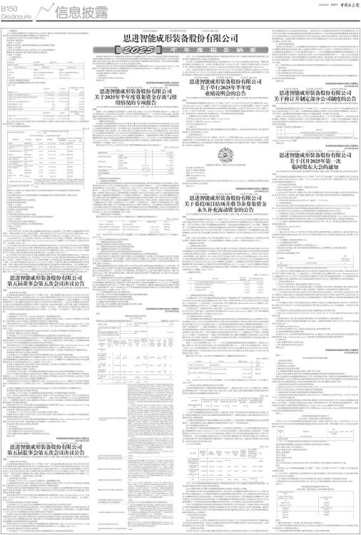 一、重要提示 本半年度报告摘要来自半年度报告全文,为全面了解本公司的经营成果、财务状况及未来发展规划,投资者应当到证监会指定媒体仔细阅读半年度报告全文。 所有董事均已出席了审议本报告的董事会会议。 非标准审计意见提示 □适用 √不适用 董事会审议的报告期利润分配预案或公积金转增股本预案 □适用 √不适用 公司计划不派发现金红利,不送红股,不以公积金转增股本。 董事会决议通过的本报告期优先股利润分配预案 □适用 √不适用 二、公司基本情况 1、公司简介 ■ 2、主要会计数据和财务指标 公司是否需追溯调整或重述以前年度会计数据 □是 √否 ■ 备注:因公司2025年6月实施了资本公积转增股本,根据《企业会计准则》相关规定,对上年同期基本每股收益进行了调整计算。 3、公司股东数量及持股情况 单位:股 ■ 持股5%以上股东、前10名股东及前10名无限售流通股股东参与转融通业务出借股份情况 □适用 √不适用 前10名股东及前10名无限售流通股股东因转融通出借/归还原因导致较上期发生变化 □适用 √不适用 4、控股股东或实际控制人变更情况 控股股东报告期内变更 □适用 √不适用 公司报告期控股股东未发生变更。 实际控制人报告期内变更 □适用 √不适用 公司报告期实际控制人未发生变更。 5、公司优先股股东总数及前10名优先股股东持股情况表 □适用 √不适用 公司报告期无优先股股东持股情况。 6、在半年度报告批准报出日存续的债券情况 □适用 √不适用 三、重要事项 1、2025年4月24日,公司召开第五届董事会第四次会议,审议通过了《关于聘任公司高级管理人员的议案》,聘任金利标先生为公司副总经理。具体内容详见公司于2025年4月26日在巨潮资讯网(http://www.cninfo.com.cn)披露的《关于聘任公司高级管理人员的公告》(公告编号:2025-014)。 2、2025年4月24日,公司召开职工代表大会,选举邵磊先生为公司职工代表监事。具体内容详见公司于2025年4月26日在巨潮资讯网(http://www.cninfo.com.cn)披露的《关于补选职工代表监事的公告》(公告编号:2025-021)。 3、公司分别于2025年4月24日召开第五届董事会第四次会议,2025年5月19日召开2024年年度股东大会,审议通过了《关于补选公司第五届董事会非独立董事的议案》,补选李梦思女士为公司第五届董事会非独立董事。具体内容详见公司于2025年4月26日在巨潮资讯网(http://www.cninfo.com.cn)披露的《关于补选公司第五届董事会非独立董事的公告》(公告编号:2025-013)。 4、公司分别于2025年4月24日召开第五届董事会第四次会议、第五届监事会第四次会议,于2025年5月19日召开2024年年度股东大会,审议通过了《关于公司〈2024年度利润分配及资本公积转增股本预案〉的议案》,同意以公司股本236,627,965股为基数,向全体股东每10股派发现金股利人民币2.20元(含税),合计派发现金股利人民币52,058,152.30元(含税);不送红股,剩余未分配利润结转以后年度分配;同时以资本公积向全体股东按每10股转增2股的比例实施资本公积转增股本,合计转增股本47,325,593股,转增后公司总股本增加至283,953,558股。具体内容详见公司于2025年4月26日在巨潮资讯网(http://www.cninfo.com.cn)披露的《2024年度利润分配及资本公积转增股本预案的公告》(公告编号:2025-010)。公司已于2025年6月10日完成2024年度利润分配及资本公积转增股本的实施工作。 证券代码:003025 证券简称:思进智能 公告编号:2025- 031 思进智能成形装备股份有限公司 第五届董事会第五次会议决议公告 本公司及董事会全体成员保证信息披露的内容真实、准确、完整,没有虚假记载、误导性陈述或重大遗漏。 一、董事会会议召开情况 思进智能成形装备股份有限公司(以下简称“公司”)第五届董事会第五次会议于2025年8月26日在公司五楼会议室召开。会议通知以电话、专人及电子邮件等相结合的方式已于2025年8月15日向全体董事发出,本次会议以现场表决和通讯表决相结合的方式召开,应出席董事5人,实际出席董事5人(其中董事李梦思女士、独立董事李良琛先生以通讯方式出席会议并行使表决权)。会议由公司董事长李忠明先生主持,公司全体监事及高级管理人员列席了本次会议。本次会议的通知、出席人数、召集、召开程序和议事内容均符合《中华人民共和国公司法》(以下简称“《公司法》”)等有关法律、行政法规、部门规章、规范性文件及《思进智能成形装备股份有限公司章程》(以下简称“《公司章程》”)的有关规定,合法有效。 二、董事会会议审议情况 1、审议通过了《关于公司〈2025年半年度报告〉及其摘要的议案》 公司根据相关的法律、法规、规范性文件及《公司章程》的规定,起草了《2025年半年度报告》及其摘要,主要内容为2025年半年度公司的整体经营情况及主要财务指标。 具体内容详见公司于同日在指定信息披露媒体及巨潮资讯网(http://www.cninfo.com.cn)上披露的《2025年半年度报告》(公告编号:2025-033)及《2025年半年度报告摘要》(公告编号:2025-034)。 公司第五届董事会审计委员会第五次会议审议通过了本议案,并同意提交公司董事会审议。 表决结果:同意5票;反对0票;弃权0票。 2、审议通过了《关于2025年半年度募集资金存放与使用情况专项报告的议案》 根据中国证券监督管理委员会发布的《上市公司募集资金监管规则》和深圳证