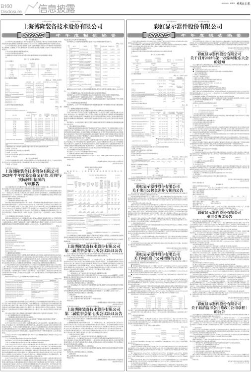 公司代码:603325 公司简称:博隆技术 第一节 重要提示 1.1本半年度报告摘要来自半年度报告全文,为全面了解本公司的经营成果、财务状况及未来发展规划,投资者应当到www.sse.com.cn网站仔细阅读半年度报告全文。 1.2本公司董事会、监事会及董事、监事、高级管理人员保证半年度报告内容的真实性、准确性、完整性,不存在虚假记载、误导性陈述或重大遗漏,并承担个别和连带的法律责任。 1.3公司全体董事出席董事会会议。 1.4本半年度报告未经审计。 1.5董事会决议通过的本报告期利润分配预案或公积金转增股本预案 无 第二节 公司基本情况 2.1公司简介 ■ ■ 2.2主要财务数据 单位:元 币种:人民币 ■ 2.3前10名股东持股情况表 单位: 股 ■ 2.4截至报告期末的优先股股东总数、前10名优先股股东情况表 □适用 √不适用 2.5控股股东或实际控制人变更情况 □适用 √不适用 2.6在半年度报告批准报出日存续的债券情况 □适用 √不适用 第三节 重要事项 公司应当根据重要性原则,说明报告期内公司经营情况的重大变化,以及报告期内发生的对公司经营情况有重大影响和预计未来会有重大影响的事项 □适用 √不适用 证券代码:603325 证券简称:博隆技术 公告编号:2025-024 上海博隆装备技术股份有限公司 2025年半年度募集资金存放、管理与实际使用情况的 专项报告 本公司董事会及全体董事保证本公告内容不存在任何虚假记载、误导性陈述或者重大遗漏,并对其内容的真实性、准确性和完整性承担法律责任。 根据《上市公司募集资金监管规则》《上海证券交易所上市公司自律监管指引第1号一一规范运作》等法律、行政法规、部门规章、规范性文件的规定,上海博隆装备技术股份有限公司(以下简称公司)董事会编制了2025年半年度募集资金存放、管理与实际使用情况的专项报告,具体情况如下: 一、募集资金基本情况 (一)募集资金金额及到账时间 经中国证券监督管理委员会《关于同意上海博隆装备技术股份有限公司首次公开发行股票注册的批复》(证监许可[2023]2041号)同意注册,公司向社会公众首次公开发行人民币普通股(A股)1,667万股,发行价格为72.46元/股,本次发行募集资金总额为120,790.82万元,扣除发行费用(不含增值税)10,362.56万元后,募集资金净额为110,428.26万元。募集资金已于2024年1月5日到账,上述募集资金到账情况已经上会会计师事务所(特殊普通合伙)审验,并出具《验资报告》(上会师报字(2024)第0040号)。 (二)募集资金使用金额及当前余额 截至2025年6月30日,公司募集资金本年度投入募集资金投资项目(以下简称募投项目)12,064.09万元,累计投入募投项目55,157.41万元,募集资金余额56,761.54万元(包括利息收入、理财产品收益等),其中,募集资金专项账户余额7,761.54万元,以闲置募集资金进行现金管理未到期余额49,000.00万元。具体使用情况如下: 单位:元 ■ 二、募集资金管理情况 为规范募集资金的使用与管理,提高募集资金使用效益,保护投资者的合法权益,公司根据中国证券监督管理委员会和上海证券交易所的规定,结合公司实际情况,制订了《公司募集资金管理制度》,对募集资金的存放、使用、改变用途、管理与监督等方面作出了明确的规定。公司对募集资金实行专户存储,严格按照法律、行政法规、部门规章、规范性文件及《公司募集资金管理制度》的规定存放、管理和使用募集资金。 公司已同保荐人国信证券股份有限公司分别与中国建设银行股份有限公司上海长三角一体化示范区支行、招商银行股份有限公司上海东方支行、招商银行股份有限公司上海青浦支行、中国银行股份有限公司上海长三角一体化示范区分行于2024年1月5日在上海签署了《募集资金专户存储三方监管协议》,协议内容与上海证券交易所制订的《募集资金专户存储三方监管协议(范本)》不存在重大差异,公司在使用募集资金时已严格遵照履行。 截至2025年6月30日,公司募集资金存储情况如下: 单位:万元 ■ 注1:中国建设银行股份有限公司上海华新支行为中国建设银行股份有限公司上海长三角一体化示范区支行的分支机构,本次募集资金三方监管协议以中国建设银行股份有限公司上海长三角一体化示范区支行的名义签署;中国银行股份有限公司上海市华新支行为中国银行股份有限公司上海长三角一体化示范区分行的分支机构,本次募集资金三方监管协议以中国银行股份有限公司上海长三角一体化示范区分行的名义签署; 注2:如合计数与各分项数值之和尾数存在微小差异,为四舍五入造成(下同)。 三、本年度募集资金的实际使用情况 (一)募集资金投资项目的资金使用情况 募集资金投资项目的资金使用情况,详见附表“募集资金使用情况对照表”。 (二)募投项目先期投入及置换情况 公司于2024年1月22日召开第一届董事会第十八次会议和第一届监事会第十七次会议,审议通过《关于使用募集资金置换预先投入募投项目及已支付发行费用的自筹资金的议案》,同意公司使用募集资金9,133.64万元置换预先投入募投项目的自筹资金,使用募集资金236.13万元置换已支付发行费用的自筹资金。保荐人国信证券股份有限公司已出具无异议的专项核查意见,上会会计师事务所(特殊普通合伙)已出具鉴证报告。 公司已于2024年1月使用募集资金9,369.77万元置换预先投入募投项目及已支付发行费用的