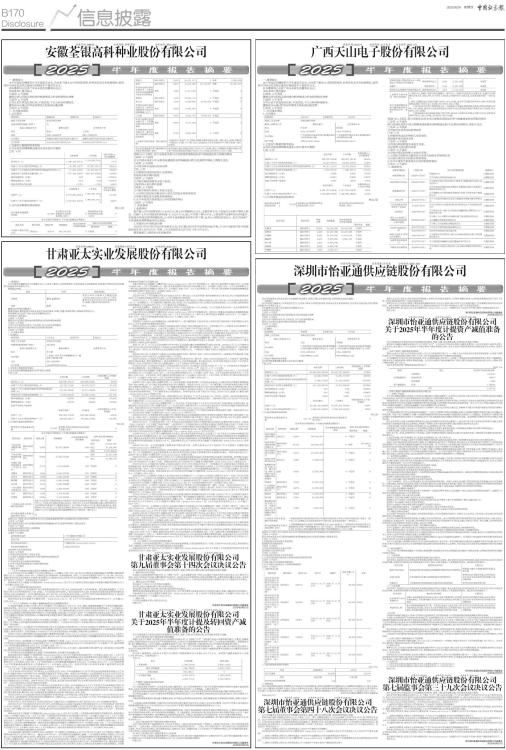 证券代码:300087 证券简称:荃银高科 公告编号:2025-029 安徽荃银高科种业股份有限公司 一、重要提示 本半年度报告摘要来自半年度报告全文,为全面了解本公司的经营成果、财务状况及未来发展规划,投资者应当到证监会指定媒体仔细阅读半年度报告全文。 所有董事均已出席了审议本报告的董事会会议。 非标准审计意见提示 □适用 √不适用 董事会审议的报告期利润分配预案或公积金转增股本预案 □适用 √不适用 公司计划不派发现金红利,不送红股,不以公积金转增股本。 董事会决议通过的本报告期优先股利润分配预案 □适用 √不适用 二、公司基本情况 1、公司简介 ■ 2、主要会计数据和财务指标 公司是否需追溯调整或重述以前年度会计数据 □是 √否 ■ 3、公司股东数量及持股情况 单位:股 ■ ■ 持股5%以上股东、前10名股东及前10名无限售流通股股东参与转融通业务出借股份情况 □适用 √不适用 前10名股东及前10名无限售流通股股东因转融通出借/归还原因导致较上期发生变化 □适用 √不适用 公司是否具有表决权差异安排 □是 √否 4、控股股东或实际控制人变更情况 控股股东报告期内变更 □适用 √不适用 公司报告期控股股东未发生变更。 实际控制人报告期内变更 □适用 √不适用 公司报告期实际控制人未发生变更。 5、公司优先股股东总数及前10名优先股股东持股情况表 公司报告期无优先股股东持股情况。 6、在半年度报告批准报出日存续的债券情况 □适用 √不适用 三、重要事项 1、业绩情况 报告期,公司实现营业收入14.36亿元,较上年同期增长1.81%,主要是种子出口及国内玉米种子等收入增加。归属于上市公司股东的净利润-4,132.91万元,较上年同期下降85.85%,主要受国内品种同质化程度高、市场竞争持续加剧等因素影响,公司种子业务整体毛利率有所下降,此外公司增加研发投入、加大市场推广力度等致经营管理费用同比增加。 2、实施2024年度权益分派 2025年5月28日召开2024年度股东大会,审议通过2024年年度利润分配方案,公司向全体股东每10股派发现金红利人民币0.5元(含税),合计派发现金人民币47,366,587.55元。 截至披露日,该权益分派实施完毕。
