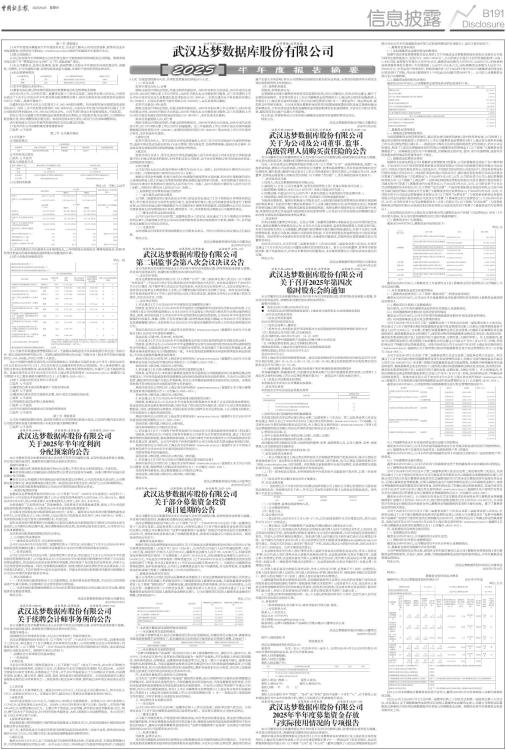 第一节 重要提示 1.1本半年度报告摘要来自半年度报告全文,为全面了解本公司的经营成果、财务状况及未来发展规划,投资者应当到http://www.sse.com.cn网站仔细阅读半年度报告全文。 1.2重大风险提示 公司已在本报告中详细阐述公司在经营过程中可能面临的各种风险及应对措施,敬请查阅本报告第三节“管理层讨论与分析”之“四、风险因素”部分。 1.3本公司董事会、监事会及董事、监事、高级管理人员保证半年度报告内容的真实性、准确性、完整性,不存在虚假记载、误导性陈述或重大遗漏,并承担个别和连带的法律责任。 1.4未出席董事情况 ■ 1.5本半年度报告未经审计。 1.6董事会决议通过的本报告期利润分配预案或公积金转增股本预案 2025年8月27日,公司召开第二届董事会第十三次会议及第二届监事会第八次会议,分别审议通过了《关于公司2025年半年度利润分配预案的议案》,拟向全体股东每10股派发现金股利6.00元(含税),具体方案如下: 以截至2025年6月30日公司总股本113,240,000股为基数,向全体股东每10股派发现金股利6.00元(含税),合计派发现金股利67,944,000.00元,占2025年半年度合并报表中归属于上市公司股东的净利润204,675,088.62元的33.20%。公司不进行资本公积金转增股本,不送红股。 如在公司公告披露日至实施权益分派股权登记日期间,公司总股本发生变动的,公司维持分配总额不变,相应调整每股分配比例。如后续总股本发生变化,将另行公告具体调整情况。 该方案尚需公司2025年第四次临时股东会审议通过后实施。 1.7是否存在公司治理特殊安排等重要事项 □适用 √不适用 第二节 公司基本情况 2.1公司简介 公司股票简况 ■ 公司存托凭证简况 □适用 √不适用 联系人和联系方式 ■ 2.2主要财务数据 单位:元 币种:人民币 ■ 注:本报告期内公司实施资本公积转增股本,上年同期基本每股收益、稀释每股收益、扣除非经常性损益后的基本每股收益按转股后股数重新计算。 2.3前10名股东持股情况表 单位: 股 ■ 注1:宁波丰年荣通投资管理有限公司-宁波梅山保税港区丰年君和投资合伙企业(有限合伙)和信风投资管理有限公司-芜湖信湦投资管理合伙企业(有限合伙)期末持有的股份数量同为2,980,000股,并列公司第十大股东。 注2:中国软件承诺自其持有公司首发限售股上市流通之日起的未来12个月内(即自2025年6月12日至2026年6月11日),不以任何形式主动减持所持有的公司的股票。在上述承诺期内,如因发生资本公积转增股本、派送股票红利、配股、增发等而增加的股份,亦遵守上述不减持的承诺。具体内容详见公司于2025年6月5日在上海证券交易所网站(www.sse.com.cn)披露的《关于持股5%以上股东承诺不减持的公告》(公告编号:2025-029)。 2.4前十名境内存托凭证持有人情况表 □适用 √不适用 2.5截至报告期末表决权数量前十名股东情况表 □适用 √不适用 2.6截至报告期末的优先股股东总数、前10名优先股股东情况表 □适用 √不适用 2.7控股股东或实际控制人变更情况 □适用 √不适用 2.8在半年度报告批准报出日存续的债券情况 □适用 √不适用 第三节 重要事项 公司应当根据重要性原则,说明报告期内公司经营情况的重大变化,以及报告期内发生的对公司经营情况有重大影响和预计未来会有重大影响的事项 □适用 √不适用 证券代码:688692 证券简称:达梦数据 公告编号:2025-040 武汉达梦数据库股份有限公司 关于2025年半年度利润 分配预案的公告 本公司董事会及全体董事保证本公告内容不存在任何虚假记载、误导性陈述或者重大遗漏,并对其内容的真实性、准确性和完整性依法承担法律责任。 重要内容提示: ●每股分配比例:每股派发现金红利0.6元(含税),不进行资本公积转增股本,不送红股。 ●本次利润分配以实施权益分派股权登记日登记的总股本为基数,具体日期将在权益分派实施公告中明确。 ●如在公司公告披露日至实施权益分派的股权登记日期间,公司总股本发生变动的,公司维持分配总额不变,相应调整每股分配比例。如后续总股本发生变化,将另行公告具体调整情况。 ●本次利润分配预案尚需提交公司2025年第四次临时股东会审议。 一、利润分配预案内容 根据武汉达梦数据库股份有限公司(以下简称“公司”)2025年半年度报告(未经审计),2025年1-6月实现合并利润表归属于上市公司股东的净利润为人民币204,675,088.62元;截至2025年6月30日,母公司期末累计未分配利润为人民币1,425,451,414.76元。 为持续践行“以投资者为本”的发展理念,与投资者共享经营发展成果,推动上市公司高质量发展和投资价值提升,公司拟定2025年半年度利润分配预案如下: 公司拟向全体股东每10股派发现金红利6元(含税)。截至审议本次利润分配预案的董事会召开日,公司总股本113,240,000股,以此计算合计拟派发现金红利67,944,000.00元(含税)。本次利润分配不进行资本公积转增股本,不送红股。 如在本次利润分配预案的公告披露之日起至实施权益分派股权登记日期间公司总股本发生变动的,公司维持分配总额不变,相应调整每股分配比例。如后续总股本发生变化,公司将另行公告具体调整情况。 本次利润分配预案尚需提交股东会审议。 二、公司履行的决策程序 (一)董事会会议的召开、审议和表决情况 公司于2025年8月27日召开第二届董事会第十三次会议,审议通过了《关于