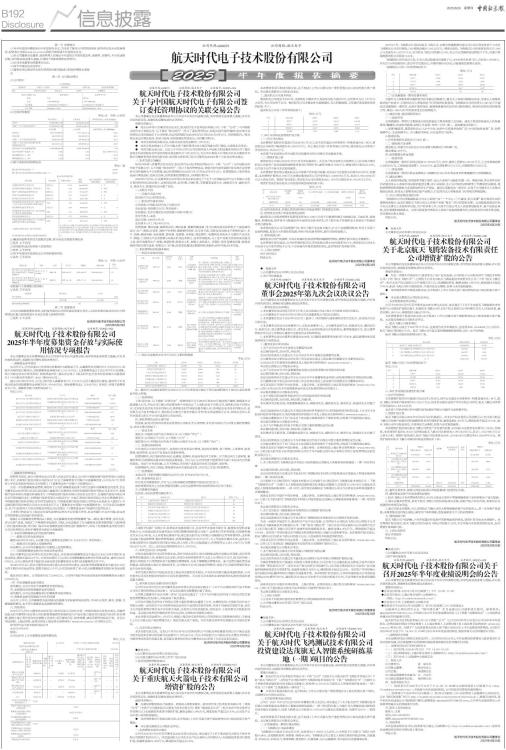 第一节 重要提示 1.1本半年度报告摘要来自半年度报告全文,为全面了解本公司的经营成果、财务状况及未来发展规划,投资者应当到www.sse.com.cn网站仔细阅读半年度报告全文。 1.2本公司董事会及董事、高级管理人员保证半年度报告内容的真实性、准确性、完整性,不存在虚假记载、误导性陈述或重大遗漏,并承担个别和连带的法律责任。 1.3公司全体董事出席董事会会议。 1.4本半年度报告未经审计。 1.5董事会决议通过的本报告期利润分配预案或公积金转增股本预案 无 第二节 公司基本情况 2.1公司简介 ■ ■ 2.2主要财务数据 单位:元 币种:人民币 ■ 2.3前10名股东持股情况表 单位: 股 ■ 2.4截至报告期末的优先股股东总数、前10名优先股股东情况表 □适用 √不适用 2.5控股股东或实际控制人变更情况 □适用 √不适用 2.6在半年度报告批准报出日存续的债券情况 √适用 □不适用 单位:元 币种:人民币 ■ 反映发行人偿债能力的指标: √适用 □不适用 ■ 第三节 重要事项 公司应当根据重要性原则,说明报告期内公司经营情况的重大变化,以及报告期内发生的对公司经营情况有重大影响和预计未来会有重大影响的事项 □适用 √不适用 航天时代电子技术股份有限公司 2025年8月28日 证券代码:600879 证券简称:航天电子 公告编号:临2025-053 航天时代电子技术股份有限公司 2025年半年度募集资金存放与实际使用情况专项报告 本公司董事会及全体董事保证本公告内容不存在任何虚假记载、误导性陈述或者重大遗漏,并对其内容的真实性、准确性和完整性承担法律责任。 一、募集资金基本情况 2023年7月,公司完成2021年向特定对象发行A股股票工作,共募集资金总额为413,560.00万元,扣除不含税的发行费用后,实际募集资金净额为411,591.39万元。上述募集资金已于2023年7月18日到账,经中兴财光华会计师事务所(特殊普通合伙)验证并出具了《航天时代电子技术股份有限公司验资报告》(中兴财光华审验字(2023)第400003号)。 截止2025年6月30日,公司已累计投入募集资金172,721.28万元用于募投项目建设,暂时用于补充流动资金的闲置募集资金余额为236,950.00万元。剩余募集资金2,114.90万元(含利息)存放于募集资金专户内。募集资金账户明细情况如下: 单位:万元 ■ 二、募集资金管理情况 按照有关规定,经公司董事会2023年第八次会议审议通过,公司在中国建设银行股份有限公司武汉硚口支行、招商银行股份有限公司武汉分行开立了募集资金专用账户存放募集资金,公司与开户行及保荐人中信证券股份有限公司分别签订了《募集资金专户存储三方监管协议》。 为进一步加强募集资金管理,规范各子公司在募集资金投资子项目实施中对募集资金的使用,经公司董事会2024年第七次会议审议通过,募投项目实施单位分别在招商银行股份有限公司北京分行、招商银行股份有限公司重庆科园路支行、中国建设银行股份有限公司北京玉泉支行、交通银行股份有限公司北京自贸试验区支行、招商银行股份有限公司武汉分行、中国工商银行股份有限公司北京翠微路支行、中国建设银行股份有限公司宝鸡宝光路支行、中国建设银行股份有限公司西安长安区航天大道支行、中国建设银行股份有限公司北京生命园支行开立了募集资金专用账户存放募集资金,公司与项目实施单位、开户行及保荐人中信证券股份有限公司分别签订了《募集资金专户存储四方监管协议》。 上述签订的协议与上海证券交易所监管协议范本不存在重大差异,协议的履行不存在问题,协议各方均按照协议规定履行相关职责。 根据《公司募集资金管理办法》规定,公司募集资金使用管理遵循“统一规划、集中管理、项目负责、审计监督”原则,并规定了严格使用审批程序。同时,办法还规定了公司募集资金使用管理部门与财务部门的月度对账机制,审计部门每半年对募集资金使用情况进行跟踪审计,形成了对募集资金的使用进行全方位监控格局,有利于募集资金的安全有效使用。 三、本报告期募集资金的实际使用情况 (一)募投项目资金使用情况 截至2025年6月30日,公司累计投入募集资金总额172,721.28万元(详见附表)。 (二)募投项目先期投入及置换情况 报告期内,公司不存在募投项目先期投入及置换情况。 (三)用闲置募集资金暂时补充流动资金情况 经公司董事会2023年第九次会议审议通过,决定使用闲置募集资金不超过32.35亿元用于暂时补充流动资金,期限不超过12个月。公司实际使用了32.24亿元闲置募集资金暂时补充流动资金。截至2024年8月9日,公司已将前次用于暂时补充流动资金的募集资金全部归还至募集资金专户中。 2024年8月14日,经公司董事会2024年第九次会议审议通过,决定使用闲置募集资金不超过26.90亿元用于暂时补充流动资金,期限不超过12个月。公司实际使用了26.50亿元闲置募集资金暂时补充流动资金。 截至本报告期末,公司提前归还了2.805亿元,公司用于暂时补充流动资金的闲置募集资金余额为23.695亿元。 (四)节余募集资金使用情况 报告期内,公司不存在节余募集资金使用情况。 四、变更募投项目的募集资金使用情况 报告期内,公司无变更募投项目的募集资金使用情况。 五、募集资金使用及披露中存在的问题 2025年上半年,公司募集资金使用情况的披露与实际使用情况相符,不存在未及时、真实、准确、