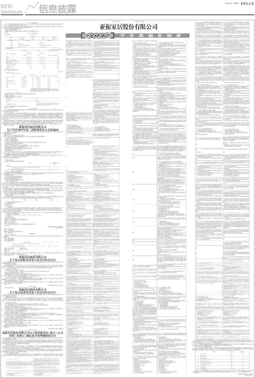第一节 重要提示 1.1本半年度报告摘要来自半年度报告全文,为全面了解本公司的经营成果、财务状况及未来发展规划,投资者应当到www.sse.com.cn网站仔细阅读半年度报告全文。 1.2本公司董事会、监事会及董事、监事、高级管理人员保证半年度报告内容的真实性、准确性、完整性,不存在虚假记载、误导性陈述或重大遗漏,并承担个别和连带的法律责任。 1.3公司全体董事出席董事会会议。 1.4本半年度报告未经审计。 1.5董事会决议通过的本报告期利润分配预案或公积金转增股本预案 不适用 第二节 公司基本情况 2.1公司简介 ■ ■ 2.2主要财务数据 单位:元 币种:人民币 ■ 2.3前10名股东持股情况表 单位: 股 ■ 2.4截至报告期末的优先股股东总数、前10名优先股股东情况表 □适用 √不适用 2.5控股股东或实际控制人变更情况 √适用 □不适用 ■ 2.6在半年度报告批准报出日存续的债券情况 □适用 √不适用 第三节 重要事项 公司应当根据重要性原则,说明报告期内公司经营情况的重大变化,以及报告期内发生的对公司经营情况有重大影响和预计未来会有重大影响的事项 √适用 □不适用 近年来,国内家具行业受房地产市场深度调整、原材料价格波动、宏观经济变化等多重因素影响,整体面临增长瓶颈。公司未来业务增长压力较大,同行业及上下游企业发展均面临瓶颈。为了顺应国家战略产业发展趋势、保护股东利益、提升上市公司持续经营能力和质量,公司向海南锆钛资源控股集团有限公司购买其持有的广西锆业51.00%的股权(以下简称“标的资产”),标的资产的交易价格为5,544.8985万元。具体内容详见公司于2025年8月2日在指定信息披露媒体及上海证券交易所网站(www.sse.com.cn)上披露的《关于现金收购广西锆业科技有限公司51%股权的公告》(公告编号:2025-064)。 截至本报告披露日,公司已取得标的公司控制权,公司业务拓展至锆钛选矿领域,形成具备中高端家具业务与锆钛选矿业务的多元化业务布局,一定程度上将改善公司的经营情况并提升盈利能力,分散经营风险,实现公司主营业务适度多元化的战略布局。具体内容详见公司于2025年8月21日在指定信息披露媒体及上海证券交易所网站(www.sse.com.cn)上披露的《关于现金收购广西锆业科技有限公司51%股权进展暨完成工商变更登记的公告》(公告编号:2025-064)。 证券代码:603389 证券简称:*ST亚振 公告编号:2025-080 亚振家居股份有限公司 关于召开2025年第三次临时股东大会的通知 本公司董事会及全体董事保证本公告内容不存在任何虚假记载、误导性陈述或者重大遗漏,并对其内容的真实性、准确性和完整性承担法律责任。 重要内容提示: ● 股东大会召开日期:2025年9月12日 ● 本次股东大会采用的网络投票系统:上海证券交易所股东大会网络投票系统 一、召开会议的基本情况 (一)股东大会类型和届次 2025年第三次临时股东大会 (二)股东大会召集人:董事会 (三)投票方式:本次股东大会所采用的表决方式是现场投票和网络投票相结合的方式 (四)现场会议召开的日期、时间和地点 召开的日期时间:2025年9月12日 14点00分 召开地点:江苏省南通市如东县曹埠镇亚振桥公司博物馆一楼会议室 (五)网络投票的系统、起止日期和投票时间。 网络投票系统:上海证券交易所股东大会网络投票系统 网络投票起止时间:自2025年9月12日 至2025年9月12日 采用上海证券交易所网络投票系统,通过交易系统投票平台的投票时间为股东大会召开当日的交易时间段,即9:15-9:25,9:30-11:30,13:00-15:00;通过互联网投票平台的投票时间为股东大会召开当日的9:15-15:00。 (六)融资融券、转融通、约定购回业务账户和沪股通投资者的投票程序 涉及融资融券、转融通业务、约定购回业务相关账户以及沪股通投资者的投票,应按照《上海证券交易所上市公司自律监管指引第1号 一 规范运作》等有关规定执行。 (七)涉及公开征集股东投票权 无。 二、会议审议事项 本次股东大会审议议案及投票股东类型 ■ 1、各议案已披露的时间和披露媒体 上述议案已分别经公司第五届董事会第十次会议、第五届监事会第八次会议审议通过,具体内容详见公司于同日在指定信息披露媒体及上海证券交易所网站(www.sse.com.cn)披露的相关公告文件。 2、特别决议议案:1 3、对中小投资者单独计票的议案:无。 4、涉及关联股东回避表决的议案:无。 应回避表决的关联股东名称:无。 5、涉及优先股股东参与表决的议案:无。 三、股东大会投票注意事项 (一)本公司股东通过上海证券交易所股东大会网络投票系统行使表决权的,既可以登陆交易系统投票平台(通过指定交易的证券公司交易终端)进行投票,也可以登陆互联网投票平台(网址:vote.sseinfo.com)进行投票。首次登陆互联网投票平台进行投票的,投资者需要完成股东身份认证。具体操作请见互联网投票平台网站说明。 (二)持有多个股东账户的股东,可行使的表决权数量是其名下全部股东账户所持相同类别普通股和相同品种优先股的数量总和。 持有多个股东账户的股东通过本所网络投票系统参与股东大会网络投票的,可以通过其任一股东账户参加。投票后,视为其全部股东账户下的相同类别普通股和相同品种优先股均已分别投出同一意见的表决票。 持有多个股东账户的股东,通过多个股东账户重复进行表决的,其全部股东账户下的