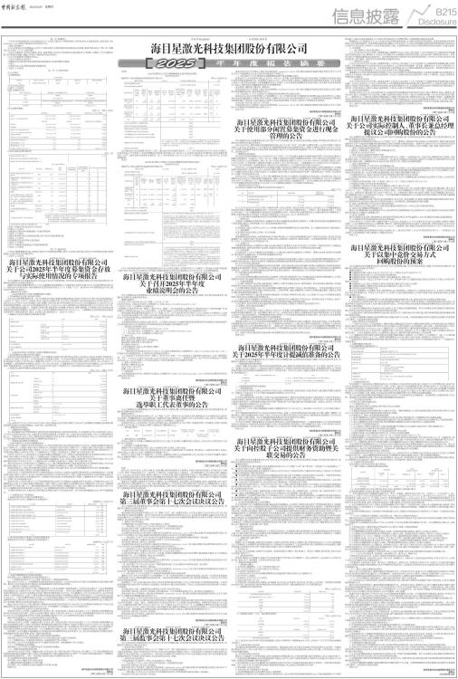 第一节 重要提示 1.1本半年度报告摘要来自半年度报告全文,为全面了解本公司的经营成果、财务状况及未来发展规划,投资者应当到www.sse.com.cn网站仔细阅读半年度报告全文。 1.2重大风险提示 公司已在本报告中详细阐述公司在生产经营过程中可能面临的各种风险及应对措施,敬请查阅本报告“第三节 管理层讨论与分析”之“四、风险因素”。 1.3本公司董事会、监事会及董事、监事、高级管理人员保证半年度报告内容的真实性、准确性、完整性,不存在虚假记载、误导性陈述或重大遗漏,并承担个别和连带的法律责任。 1.4公司全体董事出席董事会会议。 1.5本半年度报告未经审计。 1.6董事会决议通过的本报告期利润分配预案或公积金转增股本预案 不适用 1.7是否存在公司治理特殊安排等重要事项 □适用 √不适用 第二节 公司基本情况 2.1公司简介 公司股票简况 ■ 公司存托凭证简况 □适用 √不适用 联系人和联系方式 ■ 2.2主要财务数据 单位:元 币种:人民币 ■ 2.3前10名股东持股情况表 单位: 股 ■ 2.4前十名境内存托凭证持有人情况表 □适用 √不适用 2.5截至报告期末表决权数量前十名股东情况表 □适用 √不适用 2.6截至报告期末的优先股股东总数、前10名优先股股东情况表 □适用 √不适用 2.7控股股东或实际控制人变更情况 □适用 √不适用 2.8在半年度报告批准报出日存续的债券情况 □适用 √不适用 第三节 重要事项 公司应当根据重要性原则,说明报告期内公司经营情况的重大变化,以及报告期内发生的对公司经营情况有重大影响和预计未来会有重大影响的事项 □适用 √不适用 证券代码:688559 证券简称:海目星 公告编号:2025-038 海目星激光科技集团股份有限公司 关于公司2025年半年度募集资金存放与实际使用情况的专项报告 本公司董事会及全体董事保证本公告内容不存在任何虚假记载、误导性陈述或者重大遗漏,并对其内容的真实性、准确性和完整性依法承担法律责任。 根据中国证券监督管理委员会《上市公司募集资金监管规则》《上海证券交易所科创板上市公司自律监管指引第1号一一规范运作》的相关规定,海目星激光科技集团股份有限公司(以下简称“公司”)就2025年半年度募集资金存放与使用情况作如下专项报告: 一、募集资金基本情况 (一)2020年度首次公开发行股票募集资金情况 1、实际募集资金金额、资金到位情况 经中国证券监督管理委员会《关于同意深圳市海目星激光智能装备股份有限公司首次公开发行股票注册的批复》(证监许可〔2020〕1630号)文核准,并经上海证券交易所同意,本公司由主承销商中信证券股份有限公司采用询价方式,向社会公众公开发行人民币普通股(A股)股票5,000万股,发行价为每股人民币14.56元,共计募集资金72,800.00万元,坐扣承销和保荐费用5,660.38万元后的募集资金为67,139.62万元,已由主承销商中信证券股份有限公司于2020年9月1日汇入本公司募集资金监管账户。另减除上网发行费、招股说明书印刷费、申报会计师费、律师费、评估费等与发行权益性证券直接相关的新增外部费用2,230.83万元后,公司本次募集资金净额为64,908.79万元。上述募集资金到位情况业经天健会计师事务所(特殊普通合伙)验证,并由其出具《验资报告》(〔2020〕3-73号)。 2、募集资金本报告期使用金额及期末余额 单位:万元 币种:人民币 ■ (二)2024年度向特定对象发行A股股票募集资金情况 1、实际募集资金金额、资金到位情况 经中国证券监督管理委员会出具的《关于同意海目星激光科技集团股份有限公司向特定对象发行股票注册的批复》(证监许可〔2024〕901号文),公司获准向特定对象发行股票。公司本次向特定对象发行人民币普通股股票40,000,000股,每股发行价格为人民币25.49元,募集资金人民币1,019,600,000.00元,扣除各项发行费用人民币9,076,976.62元(不含增值税),实际募集资金净额为人民币1,010,523,023.38元。上述募集资金已于2024年8月19日全部到位,立信会计师事务所(特殊普通合伙)已进行验资并于2024年8月20日出具了《验资报告》(信会师报字[2024]第ZI10524号)。 2、募集资金本报告期使用金额及期末余额 单位:万元 币种:人民币 ■ [注]:差异367.31万元:其中397.90万元系公司以自筹资金支付的发行费用,另30.59万元系募集资金到账时承销商扣除的承销保荐费对应的进项税税金(非发行费),故导致差异。 二、募集资金管理情况 (一)募集资金管理制度 为了规范募集资金的管理和使用,提高资金使用效率和效益,保护投资者权益,本公司按照《中华人民共和国公司法》《中华人民共和国证券法》及《上海证券交易所科创板股票上市规则》及《上海证券交易所科创板上市公司自律监管指引第1号一一规范运作》及《上市公司募集资金监管规则》等有关法律、法规和规范性文件的规定,结合公司实际情况,制定了《海目星激光科技集团股份有限公司募集资金管理制度》。 (二)募集资金监管协议签署情况 1、2020年度首次公开发行股票募集资金 2020年9月1日,根据上述文件相关规定,公司连同保荐机构中信证券股份有限公司分别与上海浦东发展银行股份有限公司深圳分行、上海银行股份有限公司深圳分行、招商银行股份有限公司深圳分行、中国民生银行股份有限公司深圳蛇口支行、中国建设银行股份有限公司深圳上步支行、交通银行股份