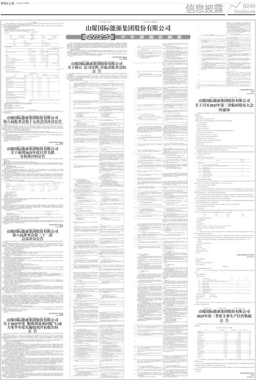 第一节 重要提示 1.1本半年度报告摘要来自半年度报告全文,为全面了解本公司的经营成果、财务状况及未来发展规划,投资者应当到上海证券交易所网站(http://www.sse.com.cn/)网站仔细阅读半年度报告全文。 1.2本公司董事会、监事会及董事、监事、高级管理人员保证半年度报告内容的真实性、准确性、完整性,不存在虚假记载、误导性陈述或重大遗漏,并承担个别和连带的法律责任。 1.3公司全体董事出席董事会会议。 1.4本半年度报告未经审计。 1.5董事会决议通过的本报告期利润分配预案或公积金转增股本预案 本报告期不进行利润分配,不实施资本公积金转增股本。 第二节 公司基本情况 2.1公司简介 ■ ■ 2.2主要财务数据 单位:元 币种:人民币 ■ 2.3前10名股东持股情况表 单位: 股 ■ 2.4截至报告期末的优先股股东总数、前10名优先股股东情况表 □适用 √不适用 2.5控股股东或实际控制人变更情况 □适用 √不适用 2.6在半年度报告批准报出日存续的债券情况 □适用 √不适用 第三节 重要事项 公司应当根据重要性原则,说明报告期内公司经营情况的重大变化,以及报告期内发生的对公司经营情况有重大影响和预计未来会有重大影响的事项 □适用 √不适用 证券代码:600546 证券简称:山煤国际 公告编号:临2025-031号 山煤国际能源集团股份有限公司 第八届监事会第十五次会议决议公告 本公司监事会及全体监事保证本公告内容不存在任何虚假记载、误导性陈述或者重大遗漏,并对其内容的真实性、准确性和完整性承担法律责任。 山煤国际能源集团股份有限公司(以下简称“公司”)第八届监事会第十五次会议(以下简称“本次会议”)通知于2025年8月15日以送达、邮件形式向公司全体监事发出,本次会议于2025年8月27日在太原市小店区晋阳街162号三层会议室以现场方式召开。本次会议应到监事7人,实到监事7人。会议的召集、召开及表决程序符合《中华人民共和国公司法》及《公司章程》的规定。本次会议由公司监事会主席钟晓强先生主持,经与会监事认真审议,形成监事会决议如下: 一、审议通过《关于〈2025年半年度报告及摘要〉的议案》 公司监事会已按规定认真审核了公司《2025年半年度报告及摘要》的全部内容,并发表如下审核意见: 1、《2025年半年度报告及摘要》的编制和审议程序规范合法,符合法律、法规、公司章程和公司内部管理制度的各项规定,内容真实、准确、完整。 2、《2025年半年度报告及摘要》的内容和格式符合中国证监会和上海证券交易所的各项规定,所包含的信息真实客观反映了公司2025年半年度的财务状况和经营成果。 3、未发现参与2025年半年度报告编制和审议的人员存在违反保密规定的行为。 表决结果:7票同意,0票反对,0票弃权。 二、审议通过《关于新增2025年度日常关联交易预计的议案》 表决结果:7票同意,0票反对,0票弃权。 特此公告。 山煤国际能源集团股份有限公司 监事会 2025年8月27日 证券代码:600546 证券简称:山煤国际 公告编号:临2025-032号 山煤国际能源集团股份有限公司 关于新增2025年度日常关联 交易预计的公告 本公司董事会及全体董事保证本公告内容不存在任何虚假记载、误导性陈述或者重大遗漏,并对其内容的真实性、准确性和完整性承担法律责任。 重要内容提示: ●本次新增2025年度日常关联交易预计事项无需提交公司股东大会审议。 ●本次新增2025年度日常关联交易预计事项,是根据公司经营活动实际情况确定,是公司生产经营及业务发展的客观需要,不会对公司本期以及未来的财务状况和经营成果产生重大影响。关联交易的定价原则遵循公平公正原则,不存在损害公司和中小股东利益的情形,不影响公司的独立性。 一、日常关联交易基本情况 (一)新增日常关联交易预计履行的审议程序 1.董事会审议情况 2025年8月27日,山煤国际能源集团股份有限公司(以下简称“公司”)召开的第八届董事会第三十二次会议审议通过了《关于新增2025年度日常关联交易预计的议案》,关联董事回避表决,其他4名非关联董事对本议案进行了表决。表决结果:4票同意,0票反对,0票弃权。根据《上海证券交易所股票上市规则》的规定,本事项无需提交股东大会审议。 2.独立董事专门会议审议情况 2025年8月27日,公司第八届董事会独立董事专门会议2025年第三次会议审议通过了《关于新增2025年度日常关联交易预计的议案》,全体独立董事认为:公司本次新增的2025年度日常关联交易预计为公司正常生产经营需要,交易事项定价公允,符合公司实际情况,不会对公司及公司财务状况、经营成果产生不利影响,不会影响上市公司的独立性,不存在损害公司股东特别是中小股东的利益的情形。 3.监事会审议情况 2025年8月27日,公司第八届监事会第十五次会议审议通过了《关于新增2025年度日常关联交易预计的议案》。表决结果:7票同意,0票反对,0票弃权。 (二)本次新增日常关联交易预计金额和类别 2025年,在实际运行中,基于公司业务开展需要,公司新增与部分关联方之间的关联交易预计金额,具体情况如下: 单位:万元 币种:人民币 ■ 二、关联方介绍和关联关系 (一)关联方介绍 1.山西焦煤集团有限责任公司 成立日期:2001年10月12日 注册资本:1,062,322.99万元 法定代表人:王强 主营业务:矿产资源开采:煤炭开采;煤炭加工;煤炭销售;机械修造;批发