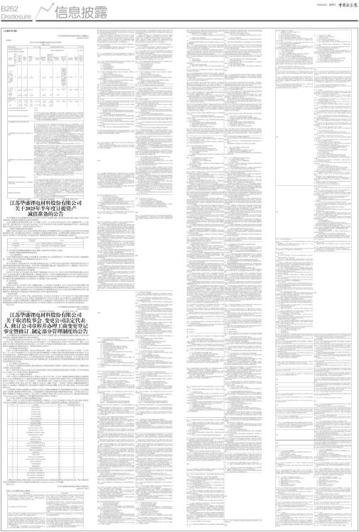 江苏华盛锂电材料股份有限公司董事会 2025年8月28日 附表1: 2025年半年度募集资金使用情况对照表 单位:万元 ■ 证券代码:688353 证券简称:华盛锂电 公告编号:2025-052 江苏华盛锂电材料股份有限公司 关于2025年半年度计提资产 减值准备的公告 本公司董事会及全体董事保证本公告内容不存在任何虚假记载、误导性陈述或者重大遗漏,并对其内容的真实性、准确性和完整性依法承担法律责任。 江苏华盛锂电材料股份有限公司(以下简称“公司”)于2025年8月26日召开了第二届董事会第二十三次会议、第二届监事会第十九次会议,审议通过了《关于2025年半年度计提资产减值准备的议案》,本事项无需提交公司股东大会审议。现将有关事项公告如下: 一、计提资产减值准备的情况概述 根据《企业会计准则》及公司会计政策的相关规定,本着谨慎性原则,公司对截至2025年6月30日存在减值迹象的存货、合同履约成本等进行了减值测试,根据减值测试结果,公司管理层基于谨慎性原则,并与公司年审会计师进行了充分的沟通,对可能发生资产减值损失的相关资产计提减值准备,具体如下: 单位:万元人民币 ■ 注:合计数与各明细数直接相加之和在尾数上存在差异为四舍五入所致。 二、计提资产减值准备事项的具体说明 (一)信用减值损失 公司以预期信用损失为基础,对应收账款、应收票据、其它应收款等进行了分析和评估并相应计提减值准备。经测试,2025年半年度信用减值损失共计467.51万元。 (二)资产减值损失 资产负债表日,存货采用成本与可变现净值孰低计量,公司评估存货可变现净值,并按照存货成本高于可变现净值的差额计提存货跌价准备。对合同资产按账龄组合确认资产减值准备并计入当期损益。2025年半年度公司合并报表口径发生资产减值损失合计1,542.33万元。 三、计提资产减值准备对公司的影响 2025年半年度公司合并报表口径计提资产减值准备2,009.85万元,减少公司合并报表利润总额2,009.85万元(合并利润总额未计算所得税影响),该数据未经审计。本次计提减值准备符合《企业会计准则》及公司会计政策的相关规定,能够真实客观地反映公司截至2025年6月30日的财务状况和2025年半年度的经营成果,符合相关法律法规的规定和公司实际情况,不会影响公司的正常经营。 四、专项意见 1、董事会意见 2025年8月26日,公司召开了第二届董事会第二十三次会议,审议通过了《关于2025年半年度计提资产减值准备的议案》。董事会认为:2025年半年度计提信用减值损失及资产减值损失符合《企业会计准则》及公司相关会计政策的规定,是根据相关资产的实际情况进行减值测试后作出的,公司计提信用减值损失及资产减值损失后,能够更加公允地反映公司的财务状况、资产价值及经营成果。 2、监事会意见 2025年8月26日,公司召开了第二届监事会第十九次会议,审议通过了《关于2025年半年度计提资产减值准备的议案》。监事会认为:本次计提资产减值准备符合《企业会计准则》及公司相关会计政策的规定,符合公司实际情况。计提资产减值准备后,能够更加客观、公允地反映公司的财务状况、资产价值和经营成果;本次计提减值准备决策程序规范,符合法律法规和《公司章程》的规定,不存在损害公司和全体股东利益的情形。 特此公告。 江苏华盛锂电材料股份有限公司董事会 2025年8月28日 证券代码:688353 证券简称:华盛锂电 公告编号:2025-055 江苏华盛锂电材料股份有限公司 关于取消监事会、变更公司法定代表人、修订公司章程并办理工商变更登记事宜暨修订、制定部分管理制度的公告 本公司董事会及全体董事保证本公告内容不存在任何虚假记载、误导性陈述或者重大遗漏,并对其内容的真实性、准确性和完整性依法承担法律责任。 江苏华盛锂电材料股份有限公司(以下简称“公司”)于2025年8月26日召开了公司第二届董事会第二十三次会议、第二届监事会第十九次会议,会议审议通过了《关于取消监事会、变更公司法定代表人、修订〈公司章程〉并办理工商变更登记事宜的议案》、《关于修订公司部分治理制度的议案》,公司章程及部分管理制度的修订尚需提交公司股东会审议。现将具体情况公告如下: 一、关于取消监事会的情况 为进一步完善公司治理结构,促进公司规范运作,根据《中华人民共和国公司法》(以下简称“《公司法》”)《上市公司章程指引》《上海证券交易所科创板股票上市规则》等法律法规及规范性文件的规定,公司不再设置监事会,监事会的职权由董事会审计委员会行使,《江苏华盛锂电材料股份有限公司监事会议事规则》等监事会相关制度相应废止,公司各项规章制度中涉及监事会、监事的规定不再适用。在公司股东大会审议通过取消监事会事项前,公司监事会仍将严格按照法律、法规及规范性文件的要求继续履行职能,维护公司及全体股东的合法利益。 二、关于变更公司法定代表人 为了提高公司管理及运营效率,更好地规范公司经营和落实主体责任,现将公司法定代表人由董事长担任变更为由总经理担任。 鉴于上述拟变更公司法定代表人由公司总经理担任事项,根据相关法律法规的有关规定,并结合实际情况,公司拟对《公司章程》的部分条款进行修订。 三、关于修订《公司章程》的情况 为进一步提升公司的规范运作水平,根据《