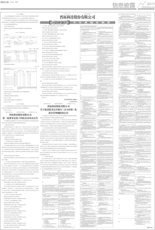 第一节 重要提示 1.1本半年度报告摘要来自半年度报告全文,为全面了解本公司的经营成果、财务状况及未来发展规划,投资者应当到www.sse.com.cn网站仔细阅读半年度报告全文。 1.2本公司董事会、监事会及董事、监事、高级管理人员保证半年度报告内容的真实性、准确性、完整性,不存在虚假记载、误导性陈述或重大遗漏,并承担个别和连带的法律责任。 1.3公司全体董事出席董事会会议。 1.4本半年度报告未经审计。 1.5董事会决议通过的本报告期利润分配预案或公积金转增股本预案 无 第二节 公司基本情况 2.1公司简介 ■ ■ 2.2主要财务数据 单位:元 币种:人民币 ■ 2.3前10名股东持股情况表 单位: 股 ■ 2.4截至报告期末的优先股股东总数、前10名优先股股东情况表 □适用 √不适用 2.5控股股东或实际控制人变更情况 □适用 √不适用 2.6在半年度报告批准报出日存续的债券情况 □适用 √不适用 第三节 重要事项 公司应当根据重要性原则,说明报告期内公司经营情况的重大变化,以及报告期内发生的对公司经营情况有重大影响和预计未来会有重大影响的事项 □适用 √不适用 证券代码:603211 证券简称:晋拓股份 公告编号:2025-022 晋拓科技股份有限公司 第二届董事会第十四次会议决议公告 本公司董事会及全体董事保证本公告内容不存在任何虚假记载、误导性陈述或者重大遗漏,并对其内容的真实性、准确性和完整性承担法律责任。 一、董事会会议召开情况 晋拓科技股份有限公司(以下简称“公司”)于2025年8月27日举行了公司第二届董事会第十四次会议。会议通知已于2025年8月15日以书面和电话的方式向各位董事发出。本次会议以现场结合通讯的方式在公司会议室召开。会议由公司董事长张东召集和主持,应到董事5人,实到董事5人,公司相关高级管理人员列席了本次会议。本次会议的召开符合《中华人民共和国公司法》和《公司章程》的有关规定。 二、董事会会议审议情况 与会董事经认真审议和表决,通过如下决议: (一)审议通过《2025年半年度报告》及摘要 本议案已经公司董事会审计委员会审议通过后提交至董事会审议。 公司严格按照各项规定完成了《2025年半年度报告》及摘要的编制和审议工作;其内容和格式符合中国证监会和上海证券交易所的各项规定,所包含的信息能从各个方面真实、公允地反映出公司2025年半年度的财务状况和经营成果等事项,不存在任何虚假记载、误导性陈述或者重大遗漏。公司董事、监事、高级管理人员就该报告签署了书面确认意见。 表决结果:5票同意、0票反对、0票弃权。 具体内容详见同日披露于上海证券交易所网站(www.sse.com.cn)的《2025年半年度报告》及摘要。 (二)审议通过《关于取消监事会并修订〈公司章程〉及相关议事规则的议案》 根据《中华人民共和国公司法》《关于新〈公司法〉配套制度规则实施相关过渡期安排》《上市公司章程指引(2025年修订)》《上市公司股东会规则》等法律、法规及规范性文件的有关规定,结合公司实际情况,公司将不再设置监事会, 监事会的职权由董事会审计委员会行使, 《监事会议事规则》 相关制度相应废止;同时为进一步完善公司治理结构, 更好地促进规范运作, 公司一并对《公司章程》《股东大会议事规则》《董事会议事规则》部分条款进行修订,并将《股东大会议事规则》更名为《股东会议事规则》。 表决结果:5票同意,0票反对,0票弃权。 具体内容详见同日披露于上海证券交易所网站(www.sse.com.cn)的《关于取消监事会并修订〈公司章程〉及部分管理制度的公告》(公告编号:2025-024)。 该议案尚需提交公司2025年第一次临时股东大会审议。 (三)审议通过《关于修订公司部分管理制度的议案》 为进一步规范公司运作,提升公司治理水平,根据《中华人民共和国公司法》《上市公司章程指引(2025年修订)》《上海证券交易所上市公司自律监管指引第1号一一规范运作(2025年5月修订)》等法律法规及规范性文件的规定, 并结合公司实际情况,修订了相关制度。董事会逐项审议了以下议案: 1、《关于修订〈独立董事工作制度〉的议案》 表决结果:5票同意,0票反对,0票弃权。 该议案尚需提交公司2025年第一次临时股东大会审议。 2、《关于修订〈对外担保管理制度〉的议案》 表决结果:5票同意,0票反对,0票弃权。 该议案尚需提交公司2025年第一次临时股东大会审议。 3、《关于修订〈关联交易管理制度〉的议案》 表决结果:5票同意,0票反对,0票弃权。 该议案尚需提交公司2025年第一次临时股东大会审议。 4、《关于修订〈对外投资管理制度〉的议案》 表决结果:5票同意,0票反对,0票弃权。 该议案尚需提交公司2025年第一次临时股东大会审议。 5、《关于修订〈募集资金管理制度〉的议案》 表决结果:5票同意,0票反对,0票弃权。 该议案尚需提交公司2025年第一次临时股东大会审议。 6、《关于修订〈董事会审计委员会工作细则〉的议案》 表决结果:5票同意,0票反对,0票弃权。 7、《关于修订〈董事会提名委员会工作细则〉的议案》 表决结果:5票同意,0票反对,0票弃权。 8、《关于修订〈董事会薪酬与考核委员会工作细则〉的议案》 表决结果:5票同意,0票反对,0票弃权。 9、《关于修订〈董事会战略委员会工作细则〉的议案》 表决结果:5票同意,0票反对,0票弃权。 10、《关于