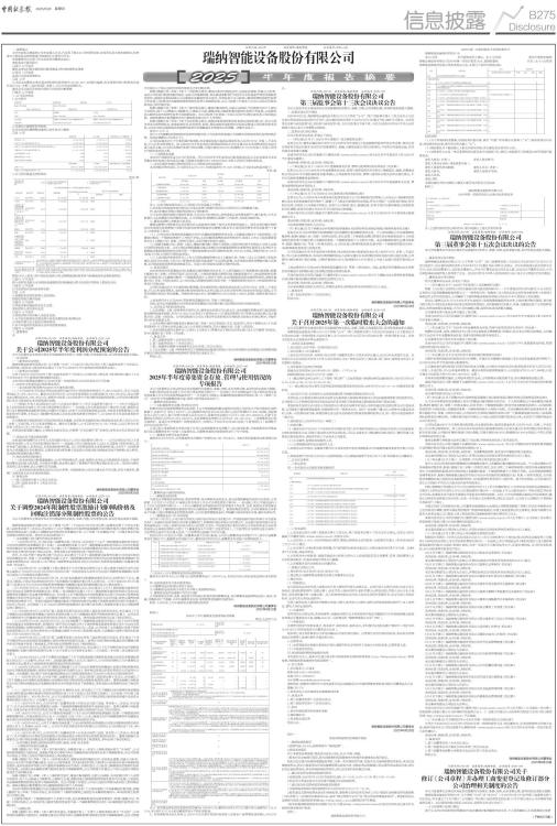 证券代码:301129 证券简称:瑞纳智能 公告编号:2025-048 一、重要提示 本半年度报告摘要来自半年度报告全文,为全面了解本公司的经营成果、财务状况及未来发展规划,投资者应当到证监会指定媒体仔细阅读半年度报告全文。 所有董事均已出席了审议本报告的董事会会议。 非标准审计意见提示 □适用 √不适用 董事会审议的报告期利润分配预案或公积金转增股本预案 √适用 □不适用 是否以公积金转增股本 □是 √否 公司经本次董事会审议通过的利润分配预案为:以135,917,400股为基数,向全体股东每10股派发现金红利0.74元(含税),送红股0股(含税),不以公积金转增股本。 董事会决议通过的本报告期优先股利润分配预案 □适用 √不适用 二、公司基本情况 1、公司简介 ■ 2、主要会计数据和财务指标 公司是否需追溯调整或重述以前年度会计数据 □是 √否 ■ 3、公司股东数量及持股情况 单位:股 ■ 持股5%以上股东、前10名股东及前10名无限售流通股股东参与转融通业务出借股份情况 □适用 √不适用 前10名股东及前10名无限售流通股股东因转融通出借/归还原因导致较上期发生变化 □适用 √不适用 公司是否具有表决权差异安排 □是 √否 4、控股股东或实际控制人变更情况 控股股东报告期内变更 □适用 √不适用 公司报告期控股股东未发生变更。 实际控制人报告期内变更 □适用 √不适用 公司报告期实际控制人未发生变更。 5、公司优先股股东总数及前10名优先股股东持股情况表 公司报告期无优先股股东持股情况。 6、在半年度报告批准报出日存续的债券情况 □适用 √不适用 三、重要事项 无 证券代码:301129 证券简称:瑞纳智能 公告编号:2025-050 瑞纳智能设备股份有限公司 关于公司2025年半年度利润分配预案的公告 本公司及董事会全体成员保证信息披露的内容真实、准确、完整,没有虚假记载、误导性陈述或重大遗漏。 一、审议程序 (一)董事会审议情况 瑞纳智能设备股份有限公司(以下简称“公司”)于2025年8月27日召开了第三届董事会第十五次会议,以9票同意、0票反对、0票弃权审议通过了《关于公司2025年半年度利润分配预案的议案》。 (二)监事会审议情况 公司于2025年8月27日召开了第三届监事会第十三次会议,以3票同意、0票反对、0票弃权审议通过了《关于公司2025年半年度利润分配预案的议案》。 本次利润分配预案尚需经公司2025年第一次临时股东大会审议通过后方可实施。 二、2025年半年度利润分配的基本情况 (一)本次利润分配预案为2025年半年度利润分配。 (二)公司2025年半年度合并报表实现的归属于母公司股东的净利润为-6,928,680.20元,母公司实现净利润-25,864,353.81元。截至2025年6月30日,公司合并报表期末未分配利润574,643,298.30元,母公司期末未分配利润505,899,095.83元。按照合并报表、母公司报表中可供分配利润孰低的原则,公司可供分配的利润以母公司报表期末未分配利润为依据。 (三)根据《中华人民共和国公司法》《企业会计准则》《上市公司监管指引第3号一一上市公司现金分红》《深圳证券交易所上市公司自律监管指引第2号一一创业板上市公司规范运作》等法律、法规、规范性文件以及《瑞纳智能设备股份有限公司章程》的规定,并鉴于公司目前盈利状况良好,为保持长期积极稳定回报股东的分红策略,在保证公司健康持续发展以及未来业务发展需求的情形下,公司2025年半年度具体利润分配预案为: 以实施权益分派股权登记日登记的总股本为基数,公司拟向全体股东每10股派发现金红利人民币0.74元(含税),不送红股,不以公积金转增股本。截至公告披露日,公司总股本为135,917,400股,以此计算合计拟派发人民币10,057,887.60元(含税)。 在利润分配预案实施前,公司股本如发生变动,将按照“分红总额不变”的原则,对现金分红比例进行调整。 三、现金分红方案合理性说明 本利润分配预案符合《中华人民共和国公司法》《上市公司监管指引第3号一一上市公司现金分红》《深圳证券交易所上市公司自律监管指引第2号一一创业板上市公司规范运作》以及《公司章程》等相关规定,综合考虑了盈利能力、财务状况、未来发展前景等因素,与公司经营业绩及未来发展相匹配,有利于广大投资者参与公司发展及分享经营成果。实施本利润分配预案不会造成公司流动资金短缺或其他不利影响。综上所述,本利润分配预案具备合理性。 四、相关说明及风险提示 (一)在本次利润分配预案披露前,公司严格按照法律、法规、规范性文件及公司制度的有关规定,严格控制内幕信息知情人的范围,并对相关内幕信息知情人履行了保密和严禁内幕交易的告知义务。同时对内幕信息知情人及时备案,防止内幕信息的泄露。 (二)本次利润分配预案尚须经公司2025年第一次临时股东大会审议通过后方可实施,存在不确定性,敬请广大投资者关注并注意投资风险。 五、备查文件 (一)第三届董事会第十五次会议决议; (二)第三届监事会第十三次会议决议。 特此公告。 瑞纳智能设备股份有限公司董事会 2025年8月28日 证券代码:301129 证券简称:瑞纳智能 公告编号:2025-051 瑞纳智能设备股份有限公司 关于调整2024年限制性股票激励计划回购价格及 回购注销部分限制性股票的公告 本公司及董事会全体成员保证信息披露的内容真实、准确、完整,没有虚假记载