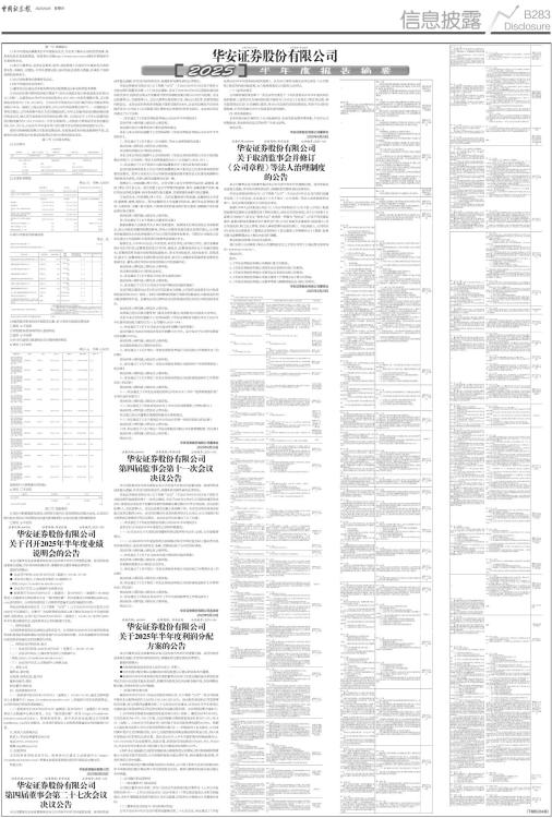 第一节 重要提示 1.1本半年度报告摘要来自半年度报告全文,为全面了解本公司的经营成果、财务状况及未来发展规划,投资者应当到http://www.sse.com.cn网站仔细阅读半年度报告全文。 1.2本公司董事会、监事会及董事、监事、高级管理人员保证半年度报告内容的真实性、准确性、完整性,不存在虚假记载、误导性陈述或重大遗漏,并承担个别和连带的法律责任。 1.3公司全体董事出席董事会会议。 1.4本半年度报告未经审计。 1.5董事会决议通过的本报告期利润分配预案或公积金转增股本预案 公司2025年度中期利润分配方案如下:拟向全体股东每10股派发现金红利0.4元(含税)。以截至2025年6月30日的总股本4,678,398,535股为基数计算,共计派发现金红利187,135,941.40元,占2025年半年度合并口径归属于母公司股东净利润的18.08%。根据《上海证券交易所上市公司自律监管指引第7号一一回购股份》等有关规定,公司采用集中竞价方式回购股份的,当年已实施的股份回购金额应视同现金分红,纳入该年度现金分红的相关比例计算。公司2025年上半年已实施的股份回购金额为18,519,819.60元(不含交易费用),若按此计算则现金红利总额为205,655,761元,占2025年半年度合并口径归属于母公司股东净利润的19.87%。 如因可转债转股导致公司股份总数变动,每股现金红利分配金额保持不变,总额及分红比例将由分红派息股权登记日时公司的总股本决定。 第二节 公司基本情况 2.1公司简介 ■ ■ 2.2主要财务数据 单位:元 币种:人民币 ■ 2.3前10名股东持股情况表 单位: 股 ■ 2.4截至报告期末的优先股股东总数、前10名优先股股东情况表 □适用 √不适用 2.5控股股东或实际控制人变更情况 □适用 √不适用 2.6在半年度报告批准报出日存续的债券情况 √适用 □不适用 单位:元 币种:人民币 ■ 反映发行人偿债能力的指标: √适用 □不适用 ■ 第三节 重要事项 公司应当根据重要性原则,说明报告期内公司经营情况的重大变化,以及报告期内发生的对公司经营情况有重大影响和预计未来会有重大影响的事项 □适用 √不适用 证券代码:600909 证券简称:华安证券 公告编号:2025-055 华安证券股份有限公司 关于召开2025年半年度业绩 说明会的公告 本公司董事会及全体董事保证本公告内容不存在任何虚假记载、误导性陈述或者重大遗漏,并对其内容的真实性、准确性和完整性承担法律责任。 重要内容提示: ● 会议召开时间:2025年10月10日(星期五)14:00-15:00 ● 会议召开地点:上海证券交易所上证路演中心 (网址:https://roadshow.sseinfo.com/) ● 会议召开方式:上证路演中心网络互动 ● 投资者可于2025年09月25日 (星期四) 至10月09日 (星期四)16:00前登录上证路演中心网站首页点击“提问预征集”栏目或通过公司邮箱bgs@hazq.com进行提问。公司将在说明会上对投资者普遍关注的问题进行回答。 华安证券股份有限公司(以下简称“公司”)已于2025年8月28日发布公司2025年半年度报告,为便于广大投资者更全面深入地了解公司2025年半年度经营成果、财务状况,公司计划于2025年10月10日 (星期五) 14:00-15:00举行2025年半年度业绩说明会,就投资者关心的问题进行交流。 一、 说明会类型 本次投资者说明会以网络互动形式召开,公司将针对2025年半年度的经营成果及财务指标的具体情况与投资者进行互动交流和沟通,在信息披露允许的范围内就投资者普遍关注的问题进行回答。 二、 说明会召开的时间、地点 (一) 会议召开时间:2025年10月10日 (星期五) 14:00-15:00 (二) 会议召开地点:上海证券交易所上证路演中心 (网址:https://roadshow.sseinfo.com/) (三) 会议召开方式:上证路演中心网络互动 三、 参加人员 董事长:章宏韬 总经理、财务总监:赵万利 董事会秘书:储军 独立董事:韩东亚 四、 投资者参加方式 (一)投资者可在2025年10月10日 (星期五) 14:00-15:00,通过互联网登录上证路演中心(https://roadshow.sseinfo.com/),在线参与本次业绩说明会,公司将及时回答投资者的提问。 (二)投资者可于2025年09月25日(星期四)至10月09日 (星期四)16:00前登录上证路演中心网站首页,点击“提问预征集”栏目(https://roadshow.sseinfo.com/preCallQa),根据活动时间,选中本次活动或通过公司邮箱bgs@hazq.com向公司提问,公司将在说明会上对投资者普遍关注的问题进行回答。 五、联系人及咨询办法 联系人:华安证券董事会办公室 电话:0551-65161691 邮箱:bgs@hazq.com 六、其他事项 本次投资者说明会召开后,投资者可以通过上证路演中心(https://roadshow.sseinfo.com/)查看本次投资者说明会的召开情况及主要内容。 特此公告。 华安证券股份有限公司 2025年8月28日 证券代码:600909 证券简称:华安证券 公告编号:2025-052 华安证券股份有限公司 第四届董事会第二十七次会议决议公告 本公司董事会及全体董事保证本公告内容不存在任何虚假记载、误导性陈述或者重大遗漏,并对其内容的真实性、准确性和完整性承担法律责任。 华安证券股份有限公司(以下简称“公司”)于2025年8月16日以电子邮件方式发出第四届董事会第二十七次会议通知。会议于2025年8月26日以现场加通讯表决形式召开,现场会议地点在安徽省合肥市滨湖新区紫云路1018号公司总部。会议应到董事9人,实到董事9人。会议由董事长章宏韬主持。部分公司监事、经营管理层列席会议。本次会议的有效表决权数占董事总数的100%,会议的召集
