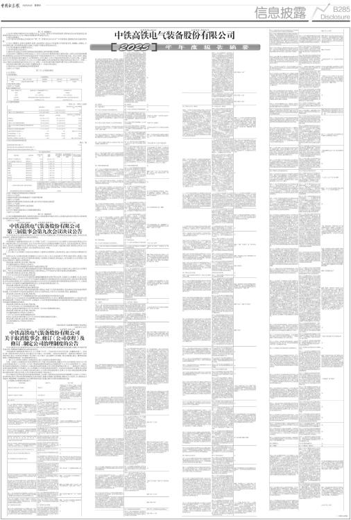 第一节 重要提示 1.1本半年度报告摘要来自半年度报告全文,为全面了解本公司的经营成果、财务状况及未来发展规划,投资者应当到www.sse.com.cn网站仔细阅读半年度报告全文。 1.2重大风险提示 公司可能存在的风险已在本报告中“第三节 管理层讨论与分析”中详细描述,敬请投资者注意投资风险。 1.3本公司董事会、监事会及董事、监事、高级管理人员保证半年度报告内容的真实性、准确性、完整性,不存在虚假记载、误导性陈述或重大遗漏,并承担个别和连带的法律责任。 1.4公司全体董事出席董事会会议。 1.5本半年度报告未经审计。 1.6董事会决议通过的本报告期利润分配预案或公积金转增股本预案 公司2024年年度股东大会审议通过了《关于公司2024年度利润分配方案的议案》,股东大会同意授权董事会根据股东大会决议在符合利润分配的条件下制定具体的2025年上半年利润分配方案。经公司研究,提出2025年半年度利润分配方案如下:公司拟按照上半年归属于上市公司股东的净利润的10%进行分配。以截至2025年6月30日的公司总股本376,289,913.00股为基数,拟向全体股东每10股派发现金红利0.08元(含税),以此计算合计拟派发现金红利301.03万元(含税),占合并层面当期实现的归属于母公司净利润的10.59%。 本次利润分配方案已经公司第三届董事会第十一次会议审议通过。 1.7是否存在公司治理特殊安排等重要事项 □适用 √不适用 第二节 公司基本情况 2.1公司简介 公司股票简况 ■ 公司存托凭证简况 □适用 √不适用 联系人和联系方式 ■ 2.2主要财务数据 单位:元 币种:人民币 ■ 2.3前10名股东持股情况表 单位: 股 ■ 2.4前十名境内存托凭证持有人情况表 □适用 √不适用 2.5截至报告期末表决权数量前十名股东情况表 □适用 √不适用 2.6截至报告期末的优先股股东总数、前10名优先股股东情况表 □适用 √不适用 2.7控股股东或实际控制人变更情况 □适用 √不适用 2.8在半年度报告批准报出日存续的债券情况 □适用 √不适用 第三节 重要事项 公司应当根据重要性原则,说明报告期内公司经营情况的重大变化,以及报告期内发生的对公司经营情况有重大影响和预计未来会有重大影响的事项 □适用 √不适用 证券代码:688285 证券简称:高铁电气 公告编号:2025-020 中铁高铁电气装备股份有限公司 第三届监事会第九次会议决议公告 本公司监事会及全体监事保证本公告内容不存在任何虚假记载、误导性陈述或者重大遗漏,并对其内容的真实性、准确性和完整性依法承担法律责任。 一、监事会召开情况 中铁高铁电气装备股份有限公司(以下简称“公司”)于2025年8月15日以邮件方式向全体监事发出召开第三届监事会第九次会议的通知。会议于2025年8月26日以现场结合视频方式召开。会议应到监事3名,实际到会3人。监事会主席连鹏飞先生主持本次会议。会议的召开符合有关法律、行政法规、规章、规范性文件及《公司章程》《监事会议事规则》的规定,会议形成的决议合法、有效。 二、监事会会议审议情况 1、关于修订《公司章程》《股东会议事规则》《董事会议事规则》,取消监事会,废止《监事会议事规则》的议案 监事会认为:本次取消监事会系根据《公司法》以及《上市公司章程指引》等有关规定进行,同意公司取消监事会,由董事会审计委员会行使监事会职权,《监事会议事规则》相应废止,并同步修订《公司章程》《股东会议事规则》《董事会议事规则》。 表决结果:同意3票,反对0票,弃权0票。 本议案尚需提交公司股东大会审议。 2、关于公司计提信用减值损失和资产减值准备的议案 监事会认为:公司本次计提信用减值损失和资产减值准备符合《企业会计准则》和公司相关会计政策的规定。符合公司实际情况,能够客观反映公司财务状况,不存在损害公司和全体股东利益的情形。 表决结果:同意3票,反对0票,弃权0票。 3、关于公司2025年半年度报告的议案 监事会认为:(1)公司2025年半年度报告及摘要的编制和审议程序符合法律、法规和《公司章程》以及公司内部管理制度的规定;(2)公司2025年半年度报告及摘要的内容和格式符合中国证监会和上海证券交易所的规定,所包含的信息能从各个方面真实地反映出公司2025年半年度的经营管理和财务状况等事项;(3)未发现参与2025年半年度报告及摘要编制和审议的人员有违反保密规定的行为。 表决结果:同意3票,反对0票,弃权0票。 4、关于2025年度中期利润分配方案的议案 监事会认为:公司2025年度中期利润分配方案充分考虑了公司的盈利情况、现金流状态及资金需求等各种因素,不存在损害中小股东利益的情形,符合公司经营现状,有利于公司的持续、稳定、健康发展。 表决结果:同意3票,反对0票,弃权0票。 5、关于公司2025年半年度募集资金存放与实际使用情况的专项报告的议案 监事会认为:公司2025年半年度募集资金存放和使用符合《上市公司募集资金监管规则》《上海证券交易所科创板股票上市规则》等有关法律、法规要求,不存在变相改变募集资金用途和损害股东利益的情形,不存在违规使用募集资金的情形。 表决结果:同意3票,反对0票,弃权0票。 6、关于公司未来三年分红回报规划的议案 经审议,监事会同意并通过《关于公司未来三年分红回报规划的议案》。 表决结果:同意3票,反对0票,弃权0票。 本议
