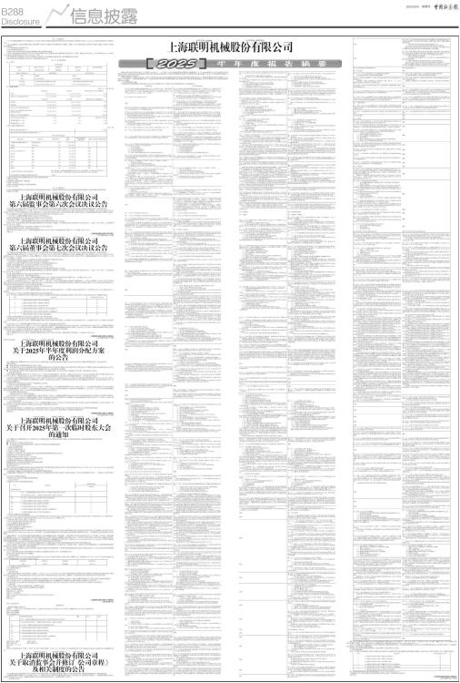 第一节 重要提示 1.1本半年度报告摘要来自半年度报告全文,为全面了解本公司的经营成果、财务状况及未来发展规划,投资者应当到www.sse.com.cn网站仔细阅读半年度报告全文。 1.2本公司董事会、监事会及董事、监事、高级管理人员保证半年度报告内容的真实性、准确性、完整性,不存在虚假记载、误导性陈述或重大遗漏,并承担个别和连带的法律责任。 1.3公司全体董事出席董事会会议。 1.4本半年度报告未经审计。 1.5董事会决议通过的本报告期利润分配预案或公积金转增股本预案 公司拟以实施权益分派股权登记日登记的总股本为基数,向公司全体股东每10股派发现金红利3.80元(含税)。截至2025年6月30日,公司总股本254,254,250股,以此计算合计拟派发现金红利96,616,615.00元(含税)。 如在实施权益分派股权登记日前公司总股本发生变动的,公司拟维持分配总额不变,相应调整每股分配比例。 本次利润分配方案尚需提交2025年第一次临时股东大会审议。 第二节 公司基本情况 2.1公司简介 ■ ■ 2.2主要财务数据 单位:元 币种:人民币 ■ 2.3前10名股东持股情况表 单位: 股 ■ 2.4截至报告期末的优先股股东总数、前10名优先股股东情况表 □适用 √不适用 2.5控股股东或实际控制人变更情况 □适用 √不适用 2.6在半年度报告批准报出日存续的债券情况 □适用 √不适用 第三节 重要事项 公司应当根据重要性原则,说明报告期内公司经营情况的重大变化,以及报告期内发生的对公司经营情况有重大影响和预计未来会有重大影响的事项 □适用 √不适用 证券代码:603006 证券简称:联明股份 编号:2025-019 上海联明机械股份有限公司 第六届监事会第六次会议决议公告 本公司监事会及全体监事保证本公告内容不存在任何虚假记载、误导性陈述或者重大遗漏,并对其内容的真实性、准确性和完整性承担个别及连带责任。 上海联明机械股份有限公司(以下简称“公司”)于2025年8月15日以书面方式向公司监事发出召开第六届监事会第六次会议的通知。会议于2025年8月27日上午以现场方式召开。会议应出席监事3名,实际出席监事3名。会议的召开符合有关法律、行政法规、部门规章、规范性文件和《上海联明机械股份有限公司章程》的规定。 会议由余国香女士主持,与会监事经过认真审议后以现场举手表决方式做出如下决议: 一、审议通过《上海联明机械股份有限公司2025年半年度报告》; 实际参与表决的监事共3名,表决结果为:同意3票,反对0票,弃权0票。 具体内容同日披露于上海证券交易所网站 https://www.sse.com.cn。 二、审议通过《关于〈上海联明机械股份有限公司2025年半年度利润分配方案〉的议案》。 同意以公司未来实施利润分配方案时确定的股权登记日的总股本为基数,向全体股东按每10股派送现金红利3.80元(含税)进行分配,共分配利润96,616,615.00元(含税)。 实际参与表决的监事共3名,表决结果为:同意3票,反对0票,弃权0票。 本议案尚需提交2025年第一次临时股东大会审议。 具体内容详见公司同日公告的《上海联明机械股份有限公司关于2025年半年度利润分配方案的公告》(公告编号:2025-021)。 特此公告。 上海联明机械股份有限公司监事会 二〇二五年八月二十七日 证券代码:603006 证券简称:联明股份 编号:2025-020 上海联明机械股份有限公司 第六届董事会第七次会议决议公告 本公司董事会及全体董事保证本公告内容不存在任何虚假记载、误导性陈述或者重大遗漏,并对其内容的真实性、准确性和完整性承担个别及连带责任。 上海联明机械股份有限公司(以下简称“公司”)于2025年8月15日以书面方式向公司董事发出召开第六届董事会第七次会议的通知。会议于2025年8月27日上午以现场方式召开。会议应出席董事9名,实际出席董事9名。会议的召开符合有关法律、行政法规、部门规章、规范性文件和《上海联明机械股份有限公司章程》(以下简称“《公司章程》”)的规定。 会议由董事长徐涛明先生主持,与会董事经过认真审议后现场举手表决做出如下决议: 一、审议通过《上海联明机械股份有限公司2025年半年度报告》; 本议案已经公司第六届董事会审计委员会审议通过,并同意提交董事会审议。 实际参与表决的董事共9名,表决结果为:同意9票,反对0票,弃权0票。 具体内容同日披露于上海证券交易所网站 https://www.sse.com.cn。 二、审议通过《关于〈上海联明机械股份有限公司2025年半年度利润分配方案〉的议案》; 同意以公司未来实施利润分配方案时确定的股权登记日的总股本为基数,向全体股东按每10股派送现金红利3.80元(含税)进行分配,共分配利润96,616,615.00元(含税)。 实际参与表决的董事共9名,表决结果为:同意9票,反对0票,弃权0票。 本议案尚需提交2025年第一次临时股东大会审议。 详见于本董事会决议同日公告的《上海联明机械股份有限公司关于2025年半年度利润分配方案的公告》(公告编号:2025-021)。 三、审议通过《关于取消监事会并修订〈上海联明机械股份有限公司章程〉的议案》; 根据《中华人民共和国公司法》(以下简称“《公司法》”)、《关于新〈公司法〉配套制度规则实施相关过渡期安排》、《上市公司章程指引》以及《上海证券交易所股票上市规则》等相关法律法规和规范性文件的规定,结合公司实际情况,公司将不再设置监事会和监事,由董事