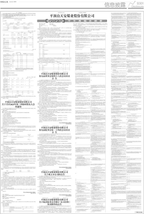 第一节 重要提示 1.1本半年度报告摘要来自半年度报告全文,为全面了解本公司的经营成果、财务状况及未来发展规划,投资者应当到http://www.sse.com.cn网站仔细阅读半年度报告全文。 1.2本公司董事会、监事会及董事、监事、高级管理人员保证半年度报告内容的真实性、准确性、完整性,不存在虚假记载、误导性陈述或重大遗漏,并承担个别和连带的法律责任。 1.3公司全体董事出席董事会会议。 1.4本半年度报告未经审计。 1.5董事会决议通过的本报告期利润分配预案或公积金转增股本预案 无 第二节 公司基本情况 2.1公司简介 ■ ■ 2.2主要财务数据 单位:元 币种:人民币 ■ 2.3前10名股东持股情况表 单位: 股 ■ 2.4截至报告期末的优先股股东总数、前10名优先股股东情况表 □适用 √不适用 2.5控股股东或实际控制人变更情况 □适用 √不适用 2.6在半年度报告批准报出日存续的债券情况 √适用 □不适用 单位:亿元 币种:人民币 ■ 反映发行人偿债能力的指标: √适用 □不适用 ■ 第三节 重要事项 公司应当根据重要性原则,说明报告期内公司经营情况的重大变化,以及报告期内发生的对公司经营情况有重大影响和预计未来会有重大影响的事项 □适用 √不适用 证券代码:601666 证券简称:平煤股份 公告编号:2025-073 平顶山天安煤业股份有限公司 关于召开2025年第三次临时股东大会的通知 本公司董事会及全体董事保证本公告内容不存在任何虚假记载、误导性陈述或者重大遗漏,并对其内容的真实性、准确性和完整性承担法律责任。 重要内容提示: ● 股东大会召开日期:2025年9月16日 ● 本次股东大会采用的网络投票系统:上海证券交易所股东大会网络投票系统 一、召开会议的基本情况 (一)股东大会类型和届次 2025年第三次临时股东大会 (二)股东大会召集人:董事会 (三)投票方式:本次股东大会所采用的表决方式是现场投票和网络投票相结合的方式 (四)现场会议召开的日期、时间和地点 召开的日期时间:2025年9月16日 9点30分 召开地点:河南省平顶山市民主路2号平安大厦 (五)网络投票的系统、起止日期和投票时间。 网络投票系统:上海证券交易所股东大会网络投票系统 网络投票起止时间:自2025年9月16日 至2025年9月16日 采用上海证券交易所网络投票系统,通过交易系统投票平台的投票时间为股东大会召开当日的交易时间段,即9:15-9:25,9:30-11:30,13:00-15:00;通过互联网投票平台的投票时间为股东大会召开当日的9:15-15:00。 (六)融资融券、转融通、约定购回业务账户和沪股通投资者的投票程序 涉及融资融券、转融通业务、约定购回业务相关账户以及沪股通投资者的投票,应按照《上海证券交易所上市公司自律监管指引第1号 一 规范运作》等有关规定执行。 二、会议审议事项 本次股东大会审议议案及投票股东类型 ■ 1、各议案已披露的时间和披露媒体 上述议案已经公司第九届董事会第四十六次会议审议通过,并于2025年8月28日刊登在上海证券交易所网站;具体披露内容详见上海证券交易所网站及公司指定媒体《中国证券报》、《上海证券报》和《证券日报》。 2、特别决议议案:1 3、对中小投资者单独计票的议案:1-2 三、股东大会投票注意事项 (一)本公司股东通过上海证券交易所股东大会网络投票系统行使表决权的,既可以登陆交易系统投票平台(通过指定交易的证券公司交易终端)进行投票,也可以登陆互联网投票平台(网址:vote.sseinfo.com)进行投票。首次登陆互联网投票平台进行投票的,投资者需要完成股东身份认证。具体操作请见互联网投票平台网站说明。 (二)持有多个股东账户的股东,可行使的表决权数量是其名下全部股东账户所持相同类别普通股和相同品种优先股的数量总和。 持有多个股东账户的股东通过本所网络投票系统参与股东大会网络投票的,可以通过其任一股东账户参加。投票后,视为其全部股东账户下的相同类别普通股和相同品种优先股均已分别投出同一意见的表决票。 持有多个股东账户的股东,通过多个股东账户重复进行表决的,其全部股东账户下的相同类别普通股和相同品种优先股的表决意见,分别以各类别和品种股票的第一次投票结果为准。 (三)股东所投选举票数超过其拥有的选举票数的,或者在差额选举中投票超过应选人数的,其对该项议案所投的选举票视为无效投票。 (四)同一表决权通过现场、本所网络投票平台或其他方式重复进行表决的,以第一次投票结果为准。 (五)股东对所有议案均表决完毕才能提交。 (六)采用累积投票制选举董事、独立董事和监事的投票方式,详见附件2 四、会议出席对象 (一)股权登记日收市后在中国证券登记结算有限责任公司上海分公司登记在册的公司股东有权出席股东大会(具体情况详见下表),并可以以书面形式委托代理人出席会议和参加表决。该代理人不必是公司股东。 ■ (二)公司董事、监事和高级管理人员。 (三)公司聘请的律师。 (四)其他人员 五、会议登记方法 1、登记时间:2025年9月15日(星期一)上午9:00~12:00,下午3:00~6:00。2、登记地点:河南省平顶山市矿工中路21号(经调大厦五楼)平顶山天安煤业股份有限公司证券法务部(邮编:467000)。 3、登记事项:法人股东应当由法定代表人或其委托的代理人出席会议。由法定代表人出席会议的,应当持营业执照副本复印件、本人身份证和法人股东账