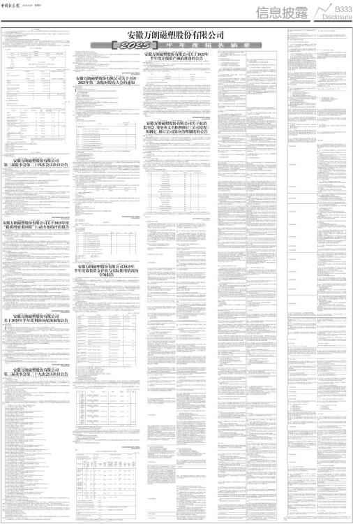 第一节 重要提示 1.1本半年度报告摘要来自半年度报告全文,为全面了解本公司的经营成果、财务状况及未来发展规划,投资者应当到www.sse.com.cn网站仔细阅读半年度报告全文。 1.2本公司董事会、监事会及董事、监事、高级管理人员保证半年度报告内容的真实性、准确性、完整性,不存在虚假记载、误导性陈述或重大遗漏,并承担个别和连带的法律责任。 1.3公司全体董事出席董事会会议。 1.4本半年度报告未经审计。 1.5董事会决议通过的本报告期利润分配预案或公积金转增股本预案 在综合考虑经营发展资金需求及持续回报股东等因素后,公司拟以未来实施分配方案时股权登记日扣除回购专户上已回购股份后的总股本为基数,向全体股东每10股派发现金红利1.50元(含税)。截至2025年6月30日,公司总股本85,483,000股,扣除回购股票专用账户1,111股,应分配股份数为85,481,889股,以此计算合计拟派发现金红利12,822,283.35元。 如在实施权益分派的股权登记日前公司总股本发生变动的,公司拟维持分配总额不变,相应调整每股分配比例。上述预案须提交公司2025年第二次临时股东大会审议批准。 第二节 公司基本情况 2.1公司简介 ■ ■ 2.2主要财务数据 单位:元 币种:人民币 ■ 2.3前10名股东持股情况表 单位: 股 ■ 2.4截至报告期末的优先股股东总数、前10名优先股股东情况表 □适用 √不适用 2.5控股股东或实际控制人变更情况 □适用 √不适用 2.6在半年度报告批准报出日存续的债券情况 □适用 √不适用 第三节 重要事项 公司应当根据重要性原则,说明报告期内公司经营情况的重大变化,以及报告期内发生的对公司经营情况有重大影响和预计未来会有重大影响的事项 □适用 √不适用 证券代码:603150 证券简称:万朗磁塑 公告编号:2025-066 安徽万朗磁塑股份有限公司 第三届监事会第二十四次会议决议公告 本公司监事会及全体监事保证本公告内容不存在任何虚假记载、误导性陈述或者重大遗漏,并对其内容的真实性、准确性和完整性承担法律责任。 安徽万朗磁塑股份有限公司(以下简称“公司”)于2025年8月17日以通讯方式发出第三届监事会第二十四次会议通知,会议于2025年8月27日以现场结合通讯方式在合肥市经济技术开发区汤口路678号召开,会议应出席监事3名,实际出席监事3名(其中,以通讯表决方式出席1人)。公司部分高级管理人员列席会议,会议由监事会主席赵莉莉主持。 本次会议的召集、召开及表决程序符合《中华人民共和国公司法》《公司章程》等相关规定。会议合法有效,经各位监事认真审议,会议形成了如下决议: (一)审议通过《关于公司2025年半年度报告及其摘要的议案》 监事会认为: 1、公司2025年半年度报告及其摘要的编制和审议程序符合法律、法规及中国证券监督管理委员会的规定。 2、公司2025年半年度报告及其摘要真实、准确、完整地反映了公司报告期内实际情况。 3、截至提出本意见时,未发现参与2025年半年度报告编制人员有违反保密规定的行为。 表决结果:3票同意,0票反对,0票弃权 具体内容详见公司同日在上海证券交易所网站(www.sse.com.cn)披露的《安徽万朗磁塑股份有限公司2025年半年度报告》《安徽万朗磁塑股份有限公司2025年半年度报告摘要》。 (二)审议通过《关于取消监事会、变更英文名称暨修订〈公司章程〉的议案》 表决结果:3票同意,0票反对,0票弃权 具体内容详见公司同日在上海证券交易所网站(www.sse.com.cn)披露的《安徽万朗磁塑股份有限公司关于取消监事会、变更英文名称暨修订〈公司章程〉及公司部分治理制度的公告》(公告编号:2025-068)《安徽万朗磁塑股份有限公司公司章程》。 (三)审议通过《关于公司2025年半年度利润分配预案的议案》 公司2025年半年度利润分配预案符合《公司章程》《未来三年股东回报规划(2023-2025)》等要求,能够兼顾股东利益及公司可持续发展,监事会认为公司2025年半年度利润分配预案是合理的,符合公司长远利益。公司严格执行现金分红政策和股东回报规划、严格履行现金分红相应决策程序,并真实、准确、完整地披露了现金分红政策及其执行情况。 表决结果:3票同意,0票反对,0票弃权 具体内容详见公司同日在上海证券交易所网站(www.sse.com.cn)披露的《安徽万朗磁塑股份有限公司关于公司2025年半年度利润分配预案的公告》(公告编号:2025-070)。 (四)审议通过《关于公司2025年半年度募集资金存放与实际使用情况的专项报告的议案》 表决结果:3票同意,0票反对,0票弃权 具体内容详见公司同日在上海证券交易所网站(www.sse.com.cn)披露的《安徽万朗磁塑股份有限公司2025年半年度募集资金存放与实际使用情况的专项报告》(公告编号:2025-071)。 (五)审议通过《关于公司2025年半年度计提资产减值准备的议案》 表决结果:3票同意,0票反对,0票弃权 具体内容详见公司同日在上海证券交易所网站(www.sse.com.cn)披露的《安徽万朗磁塑股份有限公司关于2025年半年度计提资产减值准备的公告》(公告编号:2025-072)。 特此公告。 安徽万朗磁塑股份有限公司监事会 2025年8月28日 证券代码:603150 证券简称:万朗磁塑 公告编号:2025-069 安徽万朗磁塑股份有限公司关于2025年度“提质增效重回报”行动方案的评估报告 本公司董事会及全体董事保证本公告内容不存在任何虚假记载、误导性陈述或者重大遗漏,并对其内容的