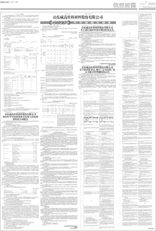 第一节 重要提示 1.1本半年度报告摘要来自半年度报告全文,为全面了解本公司的经营成果、财务状况及未来发展规划,投资者应当到http://www.sse.com.cn/网站仔细阅读半年度报告全文。 1.2重大风险提示 公司已在本报告中详细描述未来将面临的主要风险及应对措施,详情请查阅本报告“第三节管理层讨论与分析”之“四、风险因素”部分,请投资者注意投资风险。 1.3本公司董事会、监事会及董事、监事、高级管理人员保证半年度报告内容的真实性、准确性、完整性,不存在虚假记载、误导性陈述或重大遗漏,并承担个别和连带的法律责任。 1.4公司全体董事出席董事会会议。 1.5本半年度报告未经审计。 1.6董事会决议通过的本报告期利润分配预案或公积金转增股本预案 为进一步提高分红频次,增强投资者回报水平,结合公司实际情况,公司2025年度的中期分红安排如下: 截至目前,公司总股本为400,000,000股,扣减公司回购专用证券账户股份数2,713,876股后,剩余股本数为397,286,124股。公司拟以前述剩余股本数为基数,向全体股东(不含公司回购专户回购股份)每10股派发现金红利1.00元(含税),向股东派发现金分红总额为39,728,612.40元,约占2025年半年度合并归属于公司股东净利润的27.99%。 1.7是否存在公司治理特殊安排等重要事项 □适用 √不适用 第二节 公司基本情况 2.1公司简介 公司股票简况 ■ 公司存托凭证简况 □适用 √不适用 联系人和联系方式 ■ 2.2主要财务数据 单位:元 币种:人民币 ■ 2.3前10名股东持股情况表 单位: 股 ■ 2.4前十名境内存托凭证持有人情况表 □适用 √不适用 2.5截至报告期末表决权数量前十名股东情况表 □适用 √不适用 2.6截至报告期末的优先股股东总数、前10名优先股股东情况表 □适用 √不适用 2.7控股股东或实际控制人变更情况 □适用 √不适用 2.8在半年度报告批准报出日存续的债券情况 □适用 √不适用 第三节 重要事项 公司应当根据重要性原则,说明报告期内公司经营情况的重大变化,以及报告期内发生的对公司经营情况有重大影响和预计未来会有重大影响的事项 □适用 √不适用 证券代码:688161 证券简称:威高骨科 公告编号:2025-026 山东威高骨科材料股份有限公司 2025年半年度募集资金存放与实际使用情况专项报告 本公司董事会及全体董事保证本公告内容不存在任何虚假记载、误导性陈述或者重大遗漏,并对其内容的真实性、准确性和完整性依法承担法律责任。 一、募集资金基本情况 (一)实际募集资金金额和资金到账时间 经上海证券交易所科创板股票上市委员会审核同意,并根据中国证券监督管理委员会出具证监许可〔2021〕1876号同意注册文件,山东威高骨科材料股份有限公司(以下简称“公司”、“本公司”)由主承销商华泰联合证券有限责任公司(以下简称“华泰联合”“保荐机构”)采用向战略投资者定向配售、网下向符合条件的投资者询价配售和网上向持有上海市场非限售A股股份和非限售存托凭证市值的社会公众投资者定价发行相结合的方式,向社会公开发行人民币普通股(A股)股票41,414,200股,每股面值人民币1.00元,发行价格为每股人民币36.22元,共计募集资金人民币150,002.23万元。扣除与发行有关的费用人民币11,773.74万元后,募集资金净额为人民币138,228.49万元。上述募集资金到位情况经大华会计师事务所(特殊普通合伙)验证,并由其出具《验资报告》(大华验字[2021]000392号)。 (二)2025年半年度募集资金使用金额及期末余额 截至2025年6月30日,公司累计使用募集资金544,970,661.87元,2025年1-6月份使用募集资金17,914,178.43元,募集资金账户余额为人民币884,203,197.29元。具体情况如下: 单位:人民币元 ■ 二、募集资金的管理情况 (一)募集资金管理情况 为了规范募集资金的管理和使用,提高资金使用效率和效益,保护投资者权益,公司按照《中华人民共和国公司法》《中华人民共和国证券法》《上海证券交易所科创板股票上市规则》《上市公司募集资金监管规则》《上海证券交易所科创板上市公司自律监管指引第1号一一规范运作》等有关法律、法规和规范性文件的规定,结合公司实际情况,制定了《募集资金管理制度》,对募集资金的存放、使用、项目实施管理等进行了明确规定,确保募集资金规范使用。 根据公司《募集资金管理制度》的要求,公司董事会批准开设了银行专项账户,仅用于公司募集资金的存储和使用,以便对募集资金的管理和使用进行监督,保证专款专项使用。 (二)募集资金三方监管协议情况 根据《募集资金管理制度》,公司对募集资金实行专户存储,在银行设立募集资金专户,2021年6月8日连同保荐机构华泰联合分别与中国光大银行股份有限公司威海分行、中国银行股份有限有限公司威海分行、上海浦东发展银行股份有限公司威海分行签订了《募集资金专户存储三方监管协议》,2022年12月12日与上海浦东发展银行股份有限公司威海分行、上海威高精创医疗科技有限公司及保荐机构华泰联合签署了《募集资金专户存储四方监管协议》,对公司、保荐机构及存放募集资金的银行的相关责任和义务进行了详细约定。上述监管协议与上海证券交易所监管协议范本不存在重大差异,公司在使用募集资金时已经严格遵照履行。 (三)募集资金存储情况 截至2025年6月30日止,募集资金的存储情况列示如下: 单位:人民币