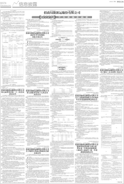 第一节 重要提示 1.1本半年度报告摘要来自半年度报告全文,为全面了解本公司的经营成果、财务状况及未来发展规划,投资者应当到www.sse.com.cn网站仔细阅读半年度报告全文。 1.2本公司董事会、监事会及董事、监事、高级管理人员保证半年度报告内容的真实性、准确性、完整性,不存在虚假记载、误导性陈述或重大遗漏,并承担个别和连带的法律责任。 1.3未出席董事情况 ■ 1.4本半年度报告未经审计。 1.5董事会决议通过的本报告期利润分配预案或公积金转增股本预案 根据2024年度股东大会的授权,董事会可在授权额度内制定和实施2025年中期分红方案。2025年8月26日,第七届董事会第二十三次会议审议通过半年度利润分配方案。 以2025年6月30日公司总股本为基数,每10股派发现金红利人民币0.7元(含税),合计派发现金红利565,217,695.14元。如在利润分配方案发布后至实施前,公司股本发生变动,将维持每股分配金额不变,并对分配总额进行相应调整。本次利润分配方案已经股东大会授权,审议通过后即可实施。 加上期内回购股份310,546,652.65元,上半年现金分红和回购金额合计875,764,347.79元,占上半年归属于上市公司股东净利润的41.22%。 第二节 公司基本情况 2.1公司简介 ■ ■ 2.2主要财务数据 单位:元 币种:人民币 ■ 2.3前10名股东持股情况表 单位: 股 ■ 2.4截至报告期末的优先股股东总数、前10名优先股股东情况表 □适用 √不适用 2.5控股股东或实际控制人变更情况 □适用 √不适用 2.6在半年度报告批准报出日存续的债券情况 □适用 √不适用 第三节 重要事项 公司应当根据重要性原则,说明报告期内公司经营情况的重大变化,以及报告期内发生的对公司经营情况有重大影响和预计未来会有重大影响的事项 □适用 √不适用 证券代码:601872 证券简称:招商轮船 公告编号:2025[038] 招商局能源运输股份有限公司 第七届董事会第二十三次会议决议公告 本公司董事会、全体董事保证本公告内容不存在虚假记载、误导性陈述或者重大遗漏,并对其内容的真实性、准确性和完整性承担法律责任。 招商局能源运输股份有限公司(以下简称“公司”、“本公司”及“招商轮船”) 2025年8月15日、8月20日以电子邮件、书面送达等方式向公司全体董事、监事和高级管理人员书面分别发出《公司第七届董事会第二十三次会议通知》和《补充通知》。2025年8月26日,公司第七届董事会第二十三次会议(以下简称“本次会议”)在深圳以现场结合视频会议方式召开。本次会议由董事长冯波鸣先生主持,应出席董事11名,实际出席董事9名。副董事长刘振华先生、董事钟富良先生因工作原因无法出席本次会议,事前已审阅会议材料,并形成明确意见分别书面委托董事曲保智先生、副董事长陈学先生代为出席会议并投票表决。公司董事会秘书现场出席会议,公司全体监事、部分高级管理人员和相关职能部门负责人列席了本次会议。 本次会议召开的时间、地点、方式符合《公司法》等法律、行政法规和部门规章以及《公司章程》的有关规定,合法、有效。 本次会议以投票表决方式审议通过了以下议案: 一、关于审议《公司2025年半年度报告》及其摘要的议案 董事会审议通过了《公司2025年半年度报告》及其摘要。 表决情况:同意11票,反对0票,弃权0票。 公司2025年半年度报告及摘要会前已经第七届董事会审计委员会第十三次会议审议通过。 详细内容请见公司于同日在《中国证券报》《证券时报》及上海证券交易所网站(http://www.sse.com.cn)上发布的《招商轮船2025年半年度报告》及其摘要。 二、关于审议《招商局集团财务有限公司2025年6月30日风险评估报告》的议案 表决情况:同意7票,反对0票,弃权0票。 董事长冯波鸣先生、董事刘振华先生、余志良先生、曲保智先生为关联董事,对本议案回避表决。 详细内容请见公司于同日在《中国证券报》《证券时报》及上海证券交易所网站(http://www.sse.com.cn)上发布的《招商轮船关于招商局集团财务有限公司2025年6月30日的风险评估报告》。 公司独立董事专门会议审议通过该报告,并同意提交董事会审议。 三、关于《公司2025年半年度利润分配方案》的议案 公司2024年年度股东大会同意进行2025年中期分红,并授权公司董事会制定和实施具体的中期分红方案。 根据上述授权,本次董事会审议通过了公司2025年半年度利润分配方案:以2025年6月30日的公司总股本为基数,拟每10股派发现金红利人民币0.7元(含税),合计派发现金红利565,217,695.14元。 利润分配方案发布后至实施前,公司股本如发生变动,将维持每股分配金额不变,分配总额进行相应调整。 表决情况:同意11票,反对0票,弃权0票。 该议案已经公司董事会审计委员会审议通过。 详细内容请见公司于同日在《中国证券报》《证券时报》及上海证券交易所网站(http://www.sse.com.cn)上发布的《招商轮船关于2025年半年度利润分配方案的公告》,公告编号2025[040]号。 四、关于变更公司注册资本的议案 公司实施了股份回购,并全部注销了回购股份。公司股份总数从8,143,806,353股减少至8,074,538,502股。 按照《公司章程》的规定,公司发行的股份每股面值1元,公司股份总数的减少使得公司注册资本也相应减少69,267,851元,由8,143,806,353元减少至8,074,538,502元。 董事会同意变更公司注册资本为8,074,538,502元,本议案还需提交股