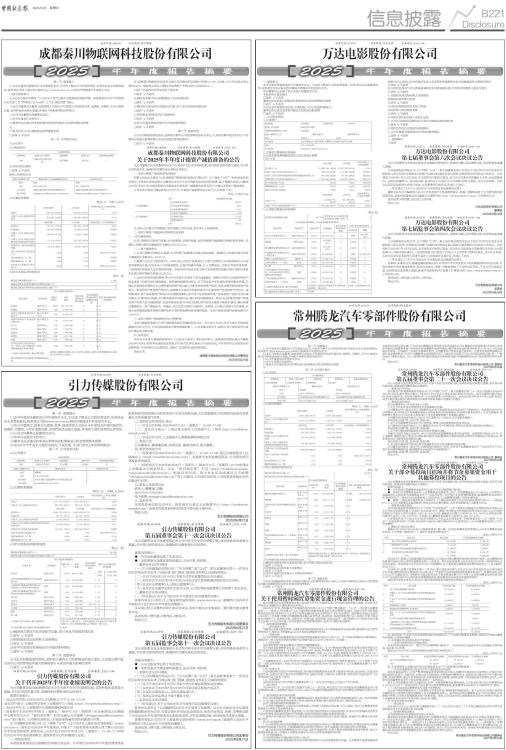 证券代码:002739 证券简称:万达电影 公告编号:2025-046 一、重要提示 本半年度报告摘要来自半年度报告全文,为全面了解本公司的经营成果、财务状况及未来发展规划,投资者应当到证监会指定媒体仔细阅读半年度报告全文。 所有董事均已出席了审议本报告的董事会会议。 非标准审计意见提示 □适用 √不适用 董事会审议的报告期利润分配预案或公积金转增股本预案 □适用 √不适用 公司计划不派发现金红利,不送红股,不以公积金转增股本。 董事会决议通过的本报告期优先股利润分配预案 □适用 √不适用 二、公司基本情况 1、公司简介 ■ 2、主要会计数据和财务指标 公司是否需追溯调整或重述以前年度会计数据 □是 √否 ■ 3、公司股东数量及持股情况 单位:股 ■ 持股5%以上股东、前10名股东及前10名无限售流通股股东参与转融通业务出借股份情况 □适用 √不适用 前10名股东及前10名无限售流通股股东因转融通出借/归还原因导致较上期发生变化 □适用 √不适用 4、控股股东或实际控制人变更情况 控股股东报告期内变更 □适用 √不适用 公司报告期控股股东未发生变更。 实际控制人报告期内变更 □适用 √不适用 公司报告期实际控制人未发生变更。 5、公司优先股股东总数及前10名优先股股东持股情况表 □适用 √不适用 公司报告期无优先股股东持股情况。 6、在半年度报告批准报出日存续的债券情况 □适用 √不适用 三、重要事项 不适用 股票代码:002739 股票简称:万达电影 公告编号:2025-044 万达电影股份有限公司 第七届董事会第六次会议决议公告 本公司及董事会全体成员保证信息披露内容的真实、准确和完整,没有虚假记载、误导性陈述或重大遗漏。 万达电影股份有限公司(以下简称“公司”)第七届董事会第六次会议于2025年8月26日在北京市朝阳区八里庄东里1号莱锦文化创意产业园CN02楼会议室以现场与通讯相结合的表决方式召开,会议通知于2025年8月15日以电话、电子邮件及书面形式发出。会议由公司董事长陈曦女士主持,应出席董事6人,实际出席董事6人,会议的召集、召开符合《公司法》《公司章程》的相关规定,会议合法有效。本次会议采用记名投票方式进行表决,与会董事经认真审议,形成以下决议: 一、审议通过了《关于公司2025年半年度报告及其摘要的议案》 董事会认为公司编制的《2025年半年度报告》及其摘要真实、准确、完整地反映了公司报告期内的经营情况,具体内容请参见同日披露于巨潮资讯网(http://www.cninfo.com.cn)上的相关公告。 表决结果:6票同意,0票反对,0票弃权。 特此公告。 万达电影股份有限公司 董事会 2025年8月28日 股票代码:002739 股票简称:万达电影 公告编号:2025-045 万达电影股份有限公司 第七届监事会第四次会议决议公告 本公司及监事会全体成员保证信息披露内容的真实、准确和完整,没有虚假记载、误导性陈述或重大遗漏。 万达电影股份有限公司(以下简称“公司”)第七届监事会第四次会议于2025年8月26日在北京市朝阳区八里庄东里1号莱锦文化创意产业园CN02楼会议室以现场与通讯相结合的表决方式召开,会议通知于2025年8月15日以电话、电子邮件及书面形式发出。会议由公司监事会主席杨海先生主持,应出席监事3人,实际出席监事3人。会议的召集、召开符合《公司法》《公司章程》的相关规定,会议合法有效。本次会议采用记名投票方式进行表决,与会监事经认真审议,形成以下决议: 一、审议通过了《关于公司2025年半年度报告及其摘要的议案》 经审核,监事会认为:董事会编制和审议的《公司2025年半年度报告》及其摘要的程序符合法律、行政法规和中国证监会的规定,报告内容真实、准确、完整地反映了公司的实际情况,不存在任何虚假记载、误导性陈述或者重大遗漏,具体内容请参见同日披露于巨潮资讯网(http://www.cninfo.com.cn)上的相关公告。 表决结果:3票同意,0票反对,0票弃权。 特此公告。 万达电影股份有限公司 监事会 2025年8月28日