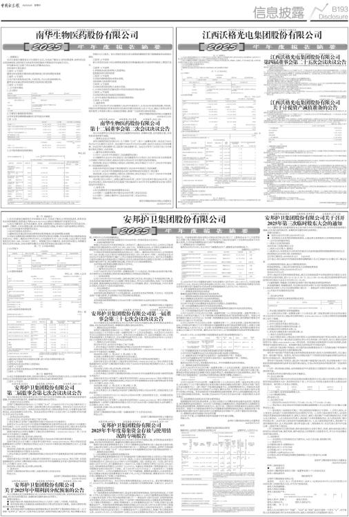 第一节 重要提示 1.1本半年度报告摘要来自半年度报告全文,为全面了解本公司的经营成果、财务状况及未来发展规划,投资者应当到www.sse.com.cn网站仔细阅读半年度报告全文。 1.2本公司董事会、监事会及董事、监事、高级管理人员保证半年度报告内容的真实性、准确性、完整性,不存在虚假记载、误导性陈述或重大遗漏,并承担个别和连带的法律责任。 1.3公司全体董事出席董事会会议。 1.4本半年度报告未经审计。 1.5董事会决议通过的本报告期利润分配预案或公积金转增股本预案 公司拟以实施权益分派股权登记日登记的总股本为基数,向全体股东每10股派发现金红利2.0元(含税)。截至2025年6月30日,公司总股本为107,526,882股,以此计算合计拟派发现金红利21,505,376.40元(含税)。该预案已经公司董事会、监事会审议通过,尚需提交股东大会审议批准,实际分派的金额以公司发布的权益分派实施公告为准。 第二节 公司基本情况 2.1公司简介 ■ ■ 2.2主要财务数据 单位:元 币种:人民币 ■ 2.3前10名股东持股情况表 单位: 股 ■ 2.4截至报告期末的优先股股东总数、前10名优先股股东情况表 □适用 √不适用 2.5控股股东或实际控制人变更情况 □适用 √不适用 2.6在半年度报告批准报出日存续的债券情况 □适用 √不适用 第三节 重要事项 公司应当根据重要性原则,说明报告期内公司经营情况的重大变化,以及报告期内发生的对公司经营情况有重大影响和预计未来会有重大影响的事项 □适用 √不适用 证券代码:603373 证券简称:安邦护卫 公告编号:2025-037 安邦护卫集团股份有限公司 第二届监事会第七次会议决议公告 本公司监事会及全体监事保证本公告内容不存在任何虚假记载、误导性陈述或者重大遗漏,并对其内容的真实性、准确性和完整性承担法律责任。 一、监事会会议召开情况 安邦护卫集团股份有限公司(以下简称“公司”)于2025年8月17日以电子邮件及专人送达方式发出了关于召开公司第二届监事会第七次会议的通知,本次会议于2025年8月27日以现场会议的方式召开。本次会议应出席监事3名,实际出席监事3名,公司董事会秘书列席会议,会议由监事吕玉炜主持。本次会议的召开符合《公司法》和《公司章程》的有关规定,所作决议合法有效。 二、监事会会议审议情况 经过充分讨论,会议审议并通过了如下议案: 1、审议并通过《安邦护卫集团股份有限公司2025年半年度报告》 监事会认为:公司2025年半年度报告的编制和审议程序符合法律、法规及《公司章程》的有关规定;公司 2025年半年度报告的内容和格式符合中国证监会和上海证券交易所的各项规定,所包含的信息能从各方面真实地反映公司2025年半年度的经营和财务状况。 具体内容详见公司同日披露于上海证券交易所网站(www.sse.com.cn)的《公司2025年半年度报告》及摘要。 表决结果:同意3票;反对0票;弃权0票。 2、审议并通过《安邦护卫集团股份有限公司2025年中期利润分配预案》 具体内容详见公司刊载于上海证券交易所网站(www.sse.com.cn)和公司指定信息披露媒体的《安邦护卫集团股份有限公司关于2025年中期利润分配预案的公告》,公告编号:2025-038。 表决结果:同意3票;反对0票;弃权0票。 本议案尚需提交公司股东大会审议。 3、审议并通过《安邦护卫集团股份有限公司2025年半年度募集资金存放与使用情况的专项报告》 具体内容详见公司刊载于上海证券交易所网站(www.sse.com.cn)和公司指 定信息披露媒体的《安邦护卫集团股份有限公司2025年半年度募集资金存放与使用情况的专项报告》,公告编号:2025-039。 表决结果:同意3票;反对0票;弃权0票。 三、备查文件 安邦护卫集团股份有限公司第二届监事会第七次会议决议 特此公告。 安邦护卫集团股份有限公司监事会 2025年8月28日 证券代码:603373 证券简称:安邦护卫 公告编号:2025-038 安邦护卫集团股份有限公司 关于2025年中期利润分配预案的公告 本公司董事会及全体董事保证本公告内容不存在任何虚假记载、误导性陈述或者重大遗漏,并对其内容的真实性、准确性和完整性承担法律责任。 重要内容提示: ● 每股分配比例:每股派发现金红利0.2元人民币(含税),不转增,不送红股。 ● 本次利润分配以实施权益分派股权登记日登记的总股本为基数,具体日期将在权益分派实施公告中披露。 ● 本次利润分配在实施权益分派的股权登记日前安邦护卫集团股份有限公司(以下简称“安邦护卫”或公司)总股本发生变动的,拟维持每股分配比例不变,相应调整分配总额,并将另行公告具体调整情况。 ● 本次利润分配预案尚需提交公司2025年第三次临时股东大会审议。 一、利润分配预案内容 根据公司2025年半年度财务报告(未经审计),截至2025年6月30日,公司母公司报表中期末可供分配利润为人民币119,495,304.71元。经董事会决议,公司拟以实施权益分派股权登记日登记的总股本为基数进行中期利润分配。本次利润分配方案如下: 公司拟向全体股东每股派发现金红利0.2元(含税)。截至2025年6月30日,公司总股本107,526,882股,以此计算合计拟派发现金红利21,505,376.40元(含税)。本次现金分红占2025年半年度合并报表中归属于上市公司股东的净利润比例为38.02%。如在本公告披露之日起至实施权益分派股权登记日期间公司享有分配权的股本总额发生变动的,公司拟维持每股分配比例