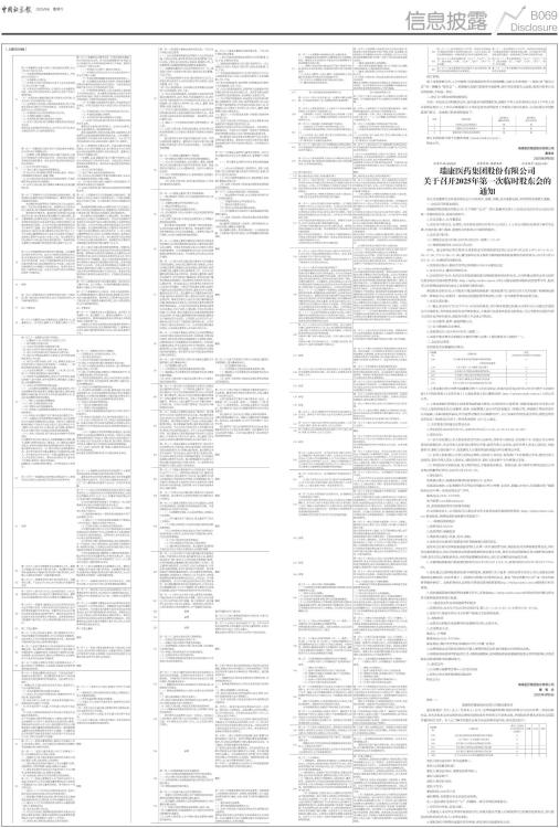 ■ ■ ■ ■ ■ ■ ■ ■ 修订说明: 除上述条款修订外,《公司章程》其他条款仅作非实质性调整,包括文字表述统一(例如:将“股东大会”统一调整为“股东会”)、条款编号及援引条款序号更新等,因不涉及条款含义变更,修改内容多且无实质影响,不再逐一列示。 二、修订公司部分治理制度情况 为进一步促进公司的规范运作,建立健全内部管理机制,根据《中华人民共和国公司法》《中华人民共和国证券法》《上市公司章程指引》《深圳证券交易所股票上市规则》等有关规定,公司对部分治理制度进行修订。具体修订的治理制度如下: ■ 修订后的制度刊登于巨潮资讯网(www.cninfo.com.cn)。 特此公告。 瑞康医药集团股份有限公司 董事会 2025年9月6日 证券代码:002589 证券简称:瑞康医药 公告编号:2025-045 瑞康医药集团股份有限公司 关于召开2025年第一次临时股东会的通知 本公司及董事会全体成员保证公告内容真实、准确、完整,没有虚假记载、误导性陈述或重大遗漏。 一、会议召开的基本情况 瑞康医药集团股份有限公司(以下简称“公司”)第五届董事会第十八次会议决定召开公司2025年第一次临时股东会,具体内容如下。 1、会议召集人:公司董事会 2、会议召开的合法、合规性:本次股东会的召开符合《公司法》、《上市公司股东会规则》等有关法律、行政法规、部门规章、规范性文件和本公司章程的规定。 3、会议召开时间: (1)现场会议召开时间:2025年9月22日(星期一)15:00 (2)网络投票时间:2025年9月22日 其中,通过深圳证券交易所交易系统进行网络投票的时间:2025年9月22日上午9:15-9:25、9:30-11:30、下午13:00-15:00;通过深圳证券交易所互联网投票系统投票的具体时间为:2025年9月22日9:15-15:00期间的任意时间。 4、现场会议地点:烟台市芝罘区凤鸣路103号13号楼会议室 5、会议主持人:董事长韩旭先生 6、会议的召开方式:本次会议采取现场投票与网络投票相结合的方式,公司将通过深圳证券交易所交易系统和互联网投票系统(http://wltp.cninfo.com.cn)向公司股东提供网络形式的投票平台,股东可以在网络投票时间内通过上述系统行使表决权。 参加股东会的方式:公司股东只能选择现场投票(现场投票可以委托代理人代为投票)和网络投票中的一种表决方式,如果同一表决权出现重复投票表决的,以第一次有效投票表决结果为准。 7、会议出席对象: (1)截止2025年9月16日下午15:00交易结束后,在中国证券登记结算公司深圳分公司登记在册的公司全体股东,均有权出席股东会并参加表决。不能亲自出席本次股东会的股东,可以书面形式委托代理人出席会议并参加表决,该股东代理人不必是公司股东。 (2)公司董事、监事、高级管理人员。 (3)公司聘请的见证律师。 8、股权登记日:2025年9月16日(星期二) 9、因故不能出席会议的股东可委托代理人出席(《授权委托书》见附件一)。 二、会议审议事项 本次股东会议案编码示例表: ■ 1、上述议案已经公司第五届董事会第十八次会议审议,具体内容详见2025年9月6日刊登于《证券时报》《中国证券报》《证券日报》《上海证券报》及巨潮资讯网(http://www.cninfo.com.cn)上的公司公告。 2、上述议案属于影响中小投资者利益的重大事项,公司将对中小投资者(指除单独或合计持有公司5%以上股份的股东及公司董事、监事、高级管理人员以外的其他股东)单独计票,并根据计票结果进行公开披露。议案2需逐项表决,作为投票对象的子议案数有2个。以上议案均为特别决议事项,需经出席会议的股东(包括股东代理人)所持表决权的 2/3 以上通过。 三、本次股东会现场会议登记办法 1、登记时间:2025年9月17日-2025年9月18日(9:30-11:30,13:00-15:00) 2、登记办法: (1)法人股东登记:法人股东的法定代表人出席的,须持本人身份证、股东账户卡、加盖公司公章的营业执照复印件、法定代表人证明书办理登记手续;委托代理人出席的,委托代理人凭本人身份证、授权委托书、委托人股东账户卡、加盖委托人公章的营业执照复印件办理登记手续。 (2)自然人股东登记:自然人股东出席的,须持本人身份证、股东账户卡办理登记手续;委托代理人出席的,委托代理人凭本人身份证、授权委托书、委托人股东账户卡办理登记手续。 (3)异地股东可采取信函、电子邮件登记,不接受电话登记。采取信函、电子邮件办理登记送达公司证券办的截至时间为:2025年9月18日15:00。 3、登记地点: 现场登记地点:瑞康医药集团股份有限公司 证券办 信函送达地址:山东省烟台市芝罘区凤鸣路103号13号楼 证券办,邮编:264001,信函请注明“瑞康医药2025年第一次临时股东会”字样。 联系电话:0535-6737695 电子邮箱:stock@realcan.cn 四、参加网络投票的具体操作流程 在本次股东会上,公司股东可以通过深交所交易系统或互联网投票系统(http://wltp.cninfo.com.cn)参加投票,网络投票的具体操作流程如下: (一)网络投票的程序 1、投票代码:362589 2、投票简称:瑞康投票 3、填报表决意见:同意、反对、弃权。 4、股东对总议案进行投票视为所有提案表达相同意见。 股东对总议案与具体提案重复投票时,以第一次有效投票为准。如股东先对具体提案投票表决,再对总议案投票表决,则以已投票表决的具体提案的表决意见为准,其他未表决的提案以总议案的表决意见为准;如先对总议案投票表决,再对具体提案投票表决,则以