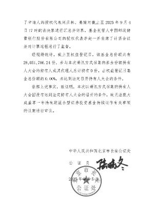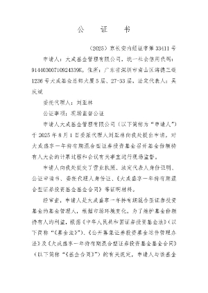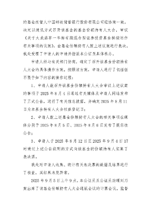 根据《中华人民共和国证券投资基金法》、《公开募集证券投资基金运作管理办法》等法律法规和《大成盛享一年持有期混合型证券投资基金基金合同》的有关规定,现将大成盛享一年持有期混合型证券投资基金(以下简称“本基金”)基金份额持有人大会的相关事项公告如下: 一、本次基金份额持有人大会会议情况 大成基金管理有限公司(以下简称“本公司”、“基金管理人”)旗下大成盛享一年持有期混合型证券投资基金以通讯方式召开了基金份额持有人大会,权益登记日为2025年8月11日。大会表决投票时间自2025年8月12日起,至2025年9月4日17:00止。 2025年9月5日,在本基金的基金托管人中国邮政储蓄银行股份有限公司授权代表的监督下,基金管理人对本次大会表决进行了计票,上海源泰律师事务所对计票过程进行了见证,北京市长安公证处对计票过程及结果进行了公证。 根据计票结果,本人直接出具表决意见或授权他人代表出具表决意见的基金份额持有人所持有的基金份额小于在权益登记日基金总份额的二分之一(含二分之一),因此未达到《中华人民共和国证券投资基金法》和《大成盛享一年持有期混合型证券投资基金基金合同》规定的关于以通讯方式召开基金份额持有人大会的有效开会条件。 二、会议费用明细 本次基金份额持有人大会费用包括公证费、律师费,前述持有人大会费用由本基金的基金管理人承担,不列入基金费用。 三、重要提示 1、本次大会召集人大成基金管理有限公司将就本次会议情况报中国证券监督管理委员会备案。 2、投资人可通过大成基金管理有限公司网站查阅本次基金份额持有人大会的相关公告文件。 四、备查文件 1、《大成基金管理有限公司关于以通讯方式召开大成盛享一年持有期混合型证券投资基金基金份额持有人大会的公告》 2、《大成基金管理有限公司关于以通讯方式召开大成盛享一年持有期混合型证券投资基金基金份额持有人大会的第一次提示性公告》 3、《大成基金管理有限公司关于以通讯方式召开大成盛享一年持有期混合型证券投资基金基金份额持有人大会的第二次提示性公告》 4、《公证书》 5、上海源泰律师事务所关于大成盛享一年持有期混合型证券投资基金召开基金份额持有人大会的法律意见书。 特此公告。 大成基金管理有限公司 2025年9月6日