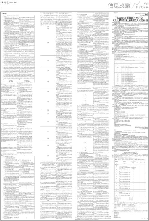 ■ ■ ■ ■ ■ ■ ■ ■ ■ 除上述变动外,《公司章程》的其他内容不变,修订后的《公司章程》于同日披露于巨潮资讯网(www.cninfo.com.cn)。 上述修订内容尚需提交公司2025年第一次临时股东大会审议,并经出席股东大会的股东或股东委托代理人所持表决权的三分之二以上表决通过。 特此公告。 海南瑞泽新型建材股份有限公司 董事会 二〇二五年九月八日 证券代码:002596 证券简称:海南瑞泽 公告编号:2025-051 海南瑞泽新型建材股份有限公司 关于召开2025年第一次临时股东大会的通知 本公司及董事会全体成员保证信息披露的内容真实、准确、完整,没有虚假记载、误导性陈述或重大遗漏。 根据海南瑞泽新型建材股份有限公司(以下简称“公司”)于2025年9月8日召开的第六届董事会第十五次会议决议,决定于2025年9月24日召开公司2025年第一次临时股东大会(以下简称“本次股东大会”),现将本次股东大会有关事项通知如下: 一、召开会议的基本情况 1、股东大会届次:本次股东大会为2025年第一次临时股东大会 2、股东大会的召集人:公司董事会(公司于2025年9月8日召开第六届董事会第十五次会议,审议通过了《关于召开公司2025年第一次临时股东大会的议案》) 3、会议召开的合法合规性:本次股东大会的召开符合《中华人民共和国公司法》《上市公司股东会规则》《深圳证券交易所上市公司自律监管指引第1号一一主板上市公司规范运作》等法律法规、规范性文件及《公司章程》的相关规定。 4、会议召开的日期、时间: (1)现场会议召开日期、时间:2025年9月24日15:00 (2)网络投票时间: ①通过深圳证券交易所交易系统进行网络投票的具体时间为:2025年9月24日的交易时间,即9:15-9:25,9:30-11:30,13:00-15:00。 ②通过深圳证券交易所互联网投票系统投票的时间为:2025年9月24日9:15至2025年9月24日15:00。 5、会议的召开方式:本次临时股东大会采用现场表决与网络投票相结合的方式召开。公司将通过深圳证券交易所交易系统和互联网投票系统向公司全体股东提供网络形式的投票平台,公司股东应选择现场投票、网络投票中的一种方式,如果同一表决权出现重复投票表决的,以第一次投票表决结果为准。 6、会议的股权登记日:2025年9月19日 7、出席对象: (1)在股权登记日持有公司股份的普通股股东或其代理人;于股权登记日下午收市时在中国结算深圳分公司登记在册的公司全体普通股股东均有权出席股东大会,并可以以书面形式委托代理人出席会议和参加表决,该股东代理人不必是本公司股东(授权委托书模板详见附件2)。 本次股东大会提案2.13《关于制定〈公司董事、高级管理人员薪酬管理制度〉的议案》、提案2.14《关于废止〈公司董事、监事薪酬管理制度〉的议案》、提案4.00《关于为公司及董事、高级管理人员购买责任险的议案》,关联股东回避表决,且不可接受其他股东委托进行投票。 (2)公司董事、监事和高级管理人员; (3)公司聘请的律师; (4)根据相关法规应当出席股东大会的其他人员。 8、会议地点:海南省三亚市吉阳区落笔洞路53号君和君泰一期1D幢和悦楼6层会议室 二、会议审议事项 1、提交股东大会表决的提案 本次股东大会提案编码表 ■ 2、上述提案已经公司第六届董事会第十五次会议审议通过,内容详见公司于2025年9月9日披露在《证券时报》《证券日报》《上海证券报》《中国证券报》以及指定信息披露网站巨潮资讯网(www.cninfo.com.cn)的《第六届董事会第十五次会议决议公告》(公告编号:2025-046)、《第六届监事会第十一次会议决议公告》(公告编号:2025-047)。 3、提案2.00需逐项表决,股东对提案2.00投票,视为对其下全部二级子议案表达相同投票意见;提案1.00、提案2.09属于特别决议事项,需经出席股东大会的股东或股东委托代理人所持表决权的2/3以上表决通过。 4、根据《上市公司股东会规则》及《深圳证券交易所上市公司自律监管指引第1号一一主板上市公司规范运作》的要求,上述提案为影响中小投资者利益的重大事项,需对中小投资者单独计票并披露。(中小投资者是指除上市公司的董事、监事、高级管理人员及单独或者合计持有上市公司5%以上股份股东以外的其他股东。) 三、会议登记等事项 1、登记时间、方式:本次股东大会现场登记时间为2025年9月22日、9月23日(具体时间为9:00-12:00,14:00-17:00);异地股东采取信函或传真方式登记的,须在上述时间内送达或传真到公司。 2、登记地点:海南省三亚市吉阳区落笔洞路53号君和君泰一期1D幢和悦楼6层证券部 3、登记办法: (1)自然人股东持本人身份证、股东账户卡、持股凭证等办理登记手续; (2)法人股东凭营业执照复印件(加盖公章)、单位持股凭证、法人授权委托书(加盖公章)和出席人身份证办理登记手续; (3)委托代理人凭本人身份证、授权委托书、委托人身份证、委托人证券账户卡及持股凭证等办理登记手续; (4)异地股东可凭以上有关证件采取信函或传真方式登记。 出席人员应当携带上述文件的原件参加股东大会。 4、会议联系方式: 联系人:秦庆 联系电话:0898-88710266 传 真:0898-88710266 电子邮箱:qinqing@hnruize.com 邮政编码:572000 地址:海南省三亚市吉阳区落笔洞路53号君和君泰一期1D幢和悦楼6层证券部 5、本次大会预期半天,与会股东食宿及交通费自理。 四、参加网络投票的具体操作流程 在本次股东大会