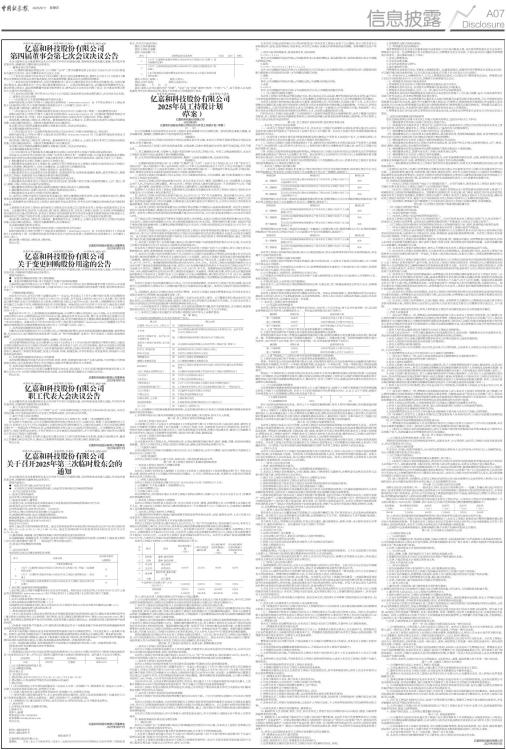 证券代码:603666 证券简称:亿嘉和 公告编号:2025-056 亿嘉和科技股份有限公司 第四届董事会第七次会议决议公告 本公司董事会及全体董事保证本公告内容不存在任何虚假记载、误导性陈述或者重大遗漏,并对其内容的真实性、准确性和完整性承担法律责任。 一、董事会会议召开情况 (一)亿嘉和科技股份有限公司(以下简称“公司”)第四届董事会第七次会议于2025年9月10日以现场结合通讯方式召开,会议由董事长朱付云女士主持。 (二)本次会议通知于2025年9月10日以邮件、电话方式向全体董事发出,根据《公司法》《公司章程》《董事会议事规则》等相关法律法规及规定,经全体董事同意,豁免本次会议通知时间要求。 (三)本次会议应出席董事6名,实际出席董事6名(其中:以通讯表决方式出席会议的董事3名,分别为董事江辉女士、独立董事苏中一先生、独立董事谢世朋先生)。公司总经理汪超先生、公司副总经理郝俊华先生、副总经理江辉女士、副总经理兼董事会秘书张晋博先生、财务总监王立杰先生列席了会议(其中副总经理江辉女士以通讯方式列席会议)。 (四)本次会议的召集、召开符合《公司法》《公司章程》及其他相关法律法规的规定,会议决议合法有效。 二、董事会会议审议情况 (一)审议通过《关于变更回购股份用途的议案》 具体内容详见公司同日刊登于上海证券交易所网站(www.sse.com.cn)及《中国证券报》《上海证券报》《证券时报》的《关于变更回购股份用途的公告》(公告编号:2025-057)。 表决结果:6票同意、0票反对、0票弃权。 (二)审议通过《关于〈亿嘉和科技股份有限公司2025年员工持股计划(草案)〉及其摘要的议案》 具体内容详见公司同日刊登于上海证券交易所网站(www.sse.com.cn)的《亿嘉和科技股份有限公司2025年员工持股计划(草案)》及《亿嘉和科技股份有限公司2025年员工持股计划(草案)摘要》。 表决结果:3票同意、0票反对、0票弃权。董事郝俊华先生、江辉女士、王谦先生拟为本次员工持股计划参加对象,对此议案回避表决。其他非关联董事参与本议案表决。 本议案已经公司第四届董事会薪酬与考核委员会第二次会议审议通过。 本议案尚需提交股东会审议。 (三)审议通过《关于〈亿嘉和科技股份有限公司2025年员工持股计划管理办法〉的议案》 具体内容详见公司同日刊登于上海证券交易所网站(www.sse.com.cn)的《亿嘉和科技股份有限公司2025年员工持股计划管理办法》。 表决结果:3票同意、0票反对、0票弃权。董事郝俊华先生、江辉女士、王谦先生拟为本次员工持股计划参加对象,对此议案回避表决。其他非关联董事参与本议案表决。 本议案已经公司第四届董事会薪酬与考核委员会第二次会议审议通过。 本议案尚需提交股东会审议。 (四)审议通过《关于提请股东会授权董事会办理公司2025年员工持股计划相关事宜的议案》 为保证公司2025年员工持股计划(简称“本次员工持股计划”)的顺利实施,公司董事会提请股东会授权董事会在符合相关法律法规的前提下全权办理本次员工持股计划相关的具体事宜,包括但不限于以下事项: 1、授权董事会负责拟订和修订本次员工持股计划; 2、授权董事会实施本次员工持股计划,包括但不限于按照本次员工持股计划的约定取消本次员工持股计划持有人的资格、增加持有人、持有人份额变动、已身故持有人的继承事宜; 3、授权董事会办理本次员工持股计划的设立、变更和终止; 4、授权董事会在公司出现资本公积转增股本、派送股票红利、股票拆细或缩股、配股、派息等事宜时,按照本次员工持股计划规定的方法对购买价格进行相应的调整; 5、授权董事会对本次员工持股计划的存续期延长作出决定; 6、授权董事会办理本次员工持股计划所涉及的证券、资金账户相关手续以及股票的购买、过户、登记、锁定、解锁、回购、注销以及分配的全部事宜; 7、授权董事会对参加对象放弃认购的份额进行重新分配或计入预留份额; 8、授权董事会拟定、签署与本次员工持股计划相关协议文件; 9、授权董事会对本次员工持股计划作出解释; 10、本次员工持股计划经公司股东会审议通过后,若在实施期限内相关法律、法规、政策发生变化的,授权董事会按照新的法律、法规、政策规定对本次员工持股计划作出相应调整; 11、授权董事会办理本次员工持股计划所需的其他必要事宜,但有关文件明确规定需由股东会行使的权利除外。 上述授权自本次员工持股计划草案经公司股东会审议通过之日起至本次员工持股计划实施完毕之日内有效。上述授权事项,除法律、行政法规、部门规章、规范性文件、本次员工持股计划或《公司章程》有明确规定需由董事会决议通过的事项外,本次员工持股计划约定的其他有关事项可由董事会授权其他适当机构或人士依据本次员工持股计划约定行使,其他事项可由董事长或其授权的适当人士代表董事会直接行使。 表决结果:3票同意、0票反对、0票弃权。董事郝俊华先生、江辉女士、王谦先生拟为本次员工持股计划参加对象,对此议案回避表决。其他非关联董事参与本议案表决。 本议案尚需提交股东会审议。 (五)审议通过《关于提请召开2025年第三次临时股东会的议案》 具体内容详见公司同日刊登于上海证券交易所网站(www.sse.com.cn)及《中国证券报》《上海