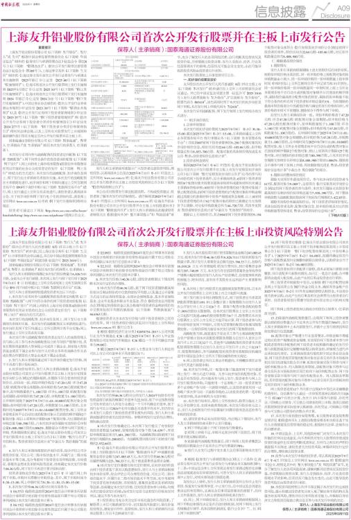 重要提示 上海友升铝业股份有限公司(以下简称“友升股份”、“发行人”或“公司”)根据中国证券监督管理委员会(以下简称“中国证监会”)颁布的《证券发行与承销管理办法》(证监会令〔第228号〕)(以下简称“《管理办法》”)、《首次公开发行股票注册管理办法》(证监会令〔第205号〕),上海证券交易所(以下简称“上交所”)颁布的《上海证券交易所首次公开发行证券发行与承销业务实施细则(2025年修订)》(上证发〔2025〕46号)(以下简称“《实施细则》”)、《上海市场首次公开发行股票网上发行实施细则(2025年3月修订)》(上证发〔2025〕43号)(以下简称“《网上发行实施细则》”)、《上海市场首次公开发行股票网下发行实施细则(2024 年修订)》(上证发〔2024〕112 号)(以下简称“《网下发行实施细则》”),中国证券业协会颁布的《首次公开发行证券承销业务规则》(中证协发〔2023〕18号)(以下简称“《承销业务规则》”)以及《首次公开发行证券网下投资者管理规则》(中证协发〔2025〕57号)(以下简称“《网下投资者管理规则》”)和《首次公开发行证券网下投资者分类评价和管理指引》(中证协发〔2024〕277号)(以下简称“《网下投资者分类评价和管理指引》”)等相关法律法规,以及上交所有关股票发行上市规则和最新操作指引等有关规定首次公开发行股票并在主板上市。 国泰海通证券股份有限公司(以下简称“国泰海通”、“保荐人(主承销商)”或“主承销商”)担任本次发行的保荐人(主承销商)。 本次发行采用向参与战略配售的投资者定向配售(以下简称“战略配售”)、网下向符合条件的投资者询价配售(以下简称“网下发行”)、网上向持有上海市场非限售A股股份和非限售存托凭证市值的社会公众投资者定价发行(以下简称“网上发行”)相结合的方式进行。本次发行的战略配售、初步询价及网上、网下发行由主承销商负责组织实施。本次发行的战略配售在主承销商处进行,初步询价和网下申购均通过上交所互联网交易平台(IPO网下询价申购)(以下简称“互联网交易平台”)进行,网上发行通过上交所交易系统进行,请投资者认真阅读本公告。关于初步询价和网下发行电子化的详细内容,请查阅上交所网站(www.sse.com.cn)公布的《网下发行实施细则》等相关规定。 投资者可通过以下网址(http://www.sse.com.cn/disclosure/listedinfo/listing/、http://www.sse.com.cn/ipo/home/)查阅公告全文。 ■ 发行人和主承销商郑重提示广大投资者注意投资风险,理性投资,认真阅读本公告及在2025年9月11日(T-1日)刊登在上交所网站(www.sse.com.cn)的《上海友升铝业股份有限公司首次公开发行股票并在主板上市投资风险特别公告》(以下简称“《投资风险特别公告》”)。 本公告仅对股票发行事宜扼要说明,不构成投资建议。投资者欲了解本次发行的详细情况,请仔细阅读2025年9月4日(T-6日)刊登在上交所网站(www.sse.com.cn)的《上海友升铝业股份有限公司首次公开发行股票并在主板上市招股意向书》(以下简称“《招股意向书》”)。发行人和主承销商在此提请投资者特别关注《招股意向书》中“重大事项提示”和“风险因素”章节,充分了解发行人的各项风险因素,自行判断其经营状况及投资价值,并审慎做出投资决策。发行人受政治、经济、行业及经营管理水平的影响,经营状况可能会发生变化,由此可能导致的投资风险由投资者自行承担。 本次发行股票的上市事宜将另行公告。 一、初步询价结果及定价 友升股份首次公开发行人民币普通股(A股)并在主板上市(以下简称“本次发行”)的申请已经上交所上市审核委员会审议通过,并已经中国证监会同意注册(证监许可〔2025〕1616号)。发行人股票简称为“友升股份”,扩位简称为“友升股份”,股票代码为“603418”,该代码同时用于本次发行的初步询价及网下申购,本次发行网上申购代码为“732418”。 本次发行采用战略配售、网下发行和网上发行相结合的方式进行。 (一)初步询价情况 1、总体申报情况 本次发行的初步询价期间为2025年9月9日(T-3日)9:30-15:00。截至2025年9月9日(T-3日)15:00,主承销商通过上交所业务管理系统平台(发行承销业务)(以下简称“业务管理系统平台”)共收到697家网下投资者管理的9,256个配售对象的初步询价报价信息,报价区间为22.64元/股-105.46元/股,拟申购数量总和为8,053,700万股。配售对象的具体报价情况请见本公告“附表:投资者报价信息统计表”。 2、投资者核查情况 根据2025年9月4日(T-6日)刊登的《上海友升铝业股份有限公司首次公开发行股票并在主板上市发行安排及初步询价公告》(以下简称“《发行安排及初步询价公告》”)公布的参与初步询价的网下投资者条件,经主承销商核查,6家网下投资者管理的8个配售对象未按要求提供审核材料或提供材料但未通过主承销商资格审核;10家网下投资者管理的52个配售对象属于禁止配售范围;2家网下投资者管理的2个配售对象拟申购金额超过其提交的备案材料中的资产规模或资金规模。以上18家网下投资者管理的共计62个配售对象的报价已被确定为无效报价予以剔除,对应拟申购数量总和为44,720万股。具体参见附表“投资者报价信息统计表”中备注为“无效报价”的部分。 剔除以上无效报价后,其余694家网下投资者管理的9,194个配售对象全部符合《发行安排及初步询