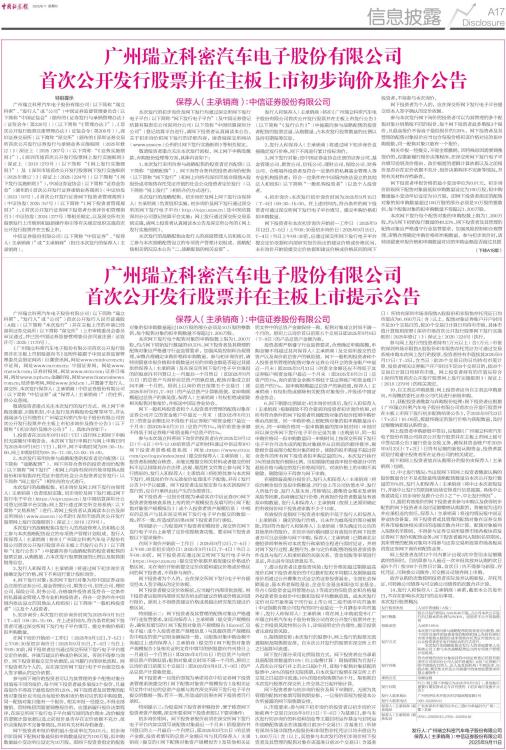 特别提示 广州瑞立科密汽车电子股份有限公司(以下简称“瑞立科密”、“发行人”或“公司”)中国证券监督管理委员会(以下简称“中国证监会”)颁布的《证券发行与承销管理办法》(证监会令〔第228号〕)(以下简称“《管理办法》”)、《首次公开发行股票注册管理办法》(证监会令〔第205号〕),深圳证券交易所(以下简称“深交所”)颁布的《深圳证券交易所首次公开发行证券发行与承销业务实施细则(2025年修订)》(深证上〔2025〕267号)(以下简称“《业务实施细则》”)、《深圳市场首次公开发行股票网上发行实施细则》(深证上〔2018〕279号)(以下简称“《网上发行实施细则》”)及《深圳市场首次公开发行股票网下发行实施细则(2025年修订)》(深证上〔2025〕224号)(以下简称“《网下发行实施细则》”),中国证券业协会(以下简称“证券业协会”)颁布的《首次公开发行证券承销业务规则》(中证协发〔2023〕18号)、《首次公开发行证券网下投资者管理规则》(中证协发〔2025〕57号)(以下简称“《网下投资者管理规则》”)、《首次公开发行证券网下投资者分类评价和管理指引》(中证协发〔2024〕277号)等相关规定,以及深交所有关股票发行上市规则和最新操作指引等有关规定组织实施首次公开发行股票并在主板上市。 中信证券股份有限公司(以下简称“中信证券”、“保荐人(主承销商)”或“主承销商”)担任本次发行的保荐人(主承销商)。 本次发行的初步询价及网下发行均通过深交所网下发行电子平台(以下简称“网下发行电子平台”)及中国证券登记结算有限责任公司深圳分公司(以下简称“中国结算深圳分公司”)登记结算平台进行,请网下投资者认真阅读本公告。关于初步询价和网下发行的详细内容,请查阅深交所网站(www.szse.cn)公布的《网下发行实施细则》等相关规定。 敬请投资者重点关注本次发行流程、网上网下申购及缴款、弃购股份处理等方面,具体内容如下: 1、本次发行采用向参与战略配售的投资者定向配售(以下简称“战略配售”)、网下向符合条件的投资者询价配售(以下简称“网下发行”)和网上向持有深圳市场非限售A股股份或非限售存托凭证市值的社会公众投资者定价发行(以下简称“网上发行”)相结合的方式进行。 本次发行的战略配售、初步询价及网上网下发行由保荐人(主承销商)负责组织实施。初步询价及网下发行通过深交所的网下发行电子平台(http://eipo.szse.cn)及中国结算深圳分公司登记结算平台实施;网上发行通过深交所交易系统实施,请网上投资者认真阅读本公告及深交所公布的《网上发行实施细则》。 本次发行的战略配售由发行人的高级管理人员和核心员工参与本次战略配售设立的专项资产管理计划组成。战略配售相关情况见本公告“二、战略配售的相关安排”。 发行人和保荐人(主承销商)将在《广州瑞立科密汽车电子股份有限公司首次公开发行股票并在主板上市发行公告》(以下简称“《发行公告》”)中披露向参与战略配售的投资者配售的股票总量、认购数量、占本次发行股票数量的比例以及持有期限等信息。 2、发行人和保荐人(主承销商)将通过网下初步询价直接确定发行价格,网下不再进行累计投标询价。 3、网下发行对象:经中国证券业协会注册的证券公司、基金管理公司、期货公司、信托公司、理财公司、保险公司、财务公司、合格境外投资者及符合一定条件的私募基金管理人等专业机构投资者;符合一定条件在中国境内依法设立的其他法人和组织(以下简称“一般机构投资者”)以及个人投资者。 4、初步询价:本次发行初步询价时间为2025年9月15日(T-4日)09:30-15:00。在上述时间内,符合条件的网下投资者可通过深交所网下发行电子平台填写、提交申购价格和拟申购数量。 网下投资者在本次初步询价开始前一工作日(2025年9月12日,T-5日)上午08:30至初步询价日(2025年9月15日,T-4日)当日上午09:30前,应通过深交所网下发行电子平台提交定价依据和内部研究报告给出的建议价格或价格区间。未在询价开始前提交定价依据和建议价格或价格区间的网下投资者,不得参与本次询价。 网下投资者为个人的,应在深交所网下发行电子平台提交经本人签字确认的定价依据。 参与本次发行网下询价的投资者可以为其管理的多个配售对象分别填报不同的报价,每个网下投资者最多填报3个报价,且最高报价不得高于最低报价的120%。网下投资者及其管理的配售对象报价应当包含每股价格和该价格对应的拟申购股数,同一配售对象只能有一个报价。 相关申报一经提交,不得全部撤销。因特殊原因需要调整报价的,应重新履行报价决策程序,在深交所网下发行电子平台填写说明改价理由、改价幅度的逻辑计算依据以及之前报价是否存在定价依据不充分、报价决策程序不完备等情况,并将有关材料存档备查。 网下投资者申报价格的最小变动单位为0.01元,初步询价阶段网下配售对象最低拟申购数量设定为100万股,拟申购数量最小变动单位设定为10万股,即网下投资者指定的配售对象的拟申购数量超过100万股的部分必须是10万股的整数倍,每个配售对象的拟申购数量不得超过1,200万股。 本次网下发行每个配售对象的申购股数上限为1,200万股,约占网下初始发行数量的49.33%。网下投资者及其管理的配售对象应严格遵守行业监