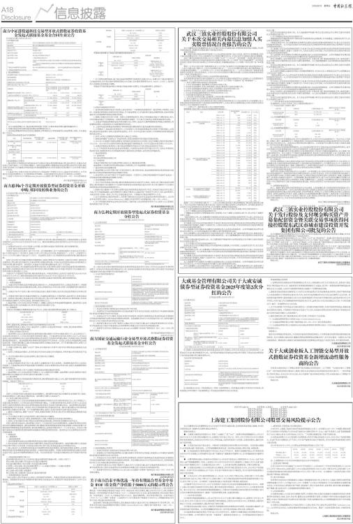 公告送出日期:2025年9月19日 公告基本信息 ■ 注:根据《大成安诚债券型证券投资基金基金合同》的规定,在符合有关基金分红条件的前提下,本基金每年收益分配次数最多为12次,每份基金份额每次基金收益分配比例不得低于基金收益分配基准日每份基金份额可供分配利润的10%。 与分红相关的其他信息 ■ 注:权益登记日以后(含权益登记日)申购(包括转换转入)的本基金份额不享有本次分红权益,而权益登记日申请赎回(包括转换转出)的本基金份额享有本次分红权益。 其他需要提示的事项 1、如果投资者未选择或未有效选择基金分红方式,本基金默认分红方式为现金分红,投资者可通过查询了解其基金分红方式。如投资者在多家销售机构购买了本基金,其在任一家销售机构所做的基金份额的分红方式变更,只适用于该销售机构指定交易账户下托管的基金份额。 2、请投资本基金的基金份额持有人于本次分红的权益登记日前务必致电基金管理人的客户服务热线人工坐席或登陆公司网站核实基金分红方式,本次分红最终确定的分红方式以基金管理人记录为准。若投资者向基金管理人核实的基金分红方式与投资者要求不符或与相关销售机构记录的投资者分红方式不符的,可在任意工作日到销售机构申请更改分红方式,最终分红方式以权益登记日之前(不含权益登记日)最后一次选择的分红方式为准。 3、由于向直销客户支付现金分红款时将发生一定的银行转账手续费,为保护投资者的利益,根据本基金合同的有关规定,当直销客户的现金分红款小于2元时,本基金注册登记机构可将该客户的现金分红款自动转为基金份额计入其基金账户。 4、基金份额持有人欲了解本基金其它有关信息,可采取如下方法咨询: (1)大成基金管理有限公司网站:http://www.dcfund.com.cn。 (2)大成基金管理有限公司客户服务热线:400-888-5558(免长途通话费用) (3)大成基金管理有限公司直销网点及本基金各销售机构的相关网点(详见本基金最新的招募说明书及相关公告)。 风险提示: 基金分红导致基金净值变化,不会改变本基金的风险收益特征,不会降低基金投资风险或提高基金投资收益。本公司承诺以诚实信用、勤勉尽责的原则管理和运用基金资产,但不保证基金一定盈利,也不保证最低收益。敬请投资人根据自身的风险承受能力选择相适应的基金产品进行投资,并注意投资风险。 大成基金管理有限公司 2025年9月19日 关于大成创业板人工智能交易型开放式指数证券投资基金新增流动性服务商的公告 为促进大成创业板人工智能交易型开放式指数证券投资基金(以下简称“大成创业板人工智能ETF”)的市场流动性和平稳运行,根据《深圳证券交易所证券投资基金业务指引第2号一一流动性服务》等有关规定,自2025年9月19日起,本公司新增广发证券股份有限公司为大成创业板人工智能ETF(159242)流动性服务商。 特此公告。 大成基金管理有限公司 2025年9月19日