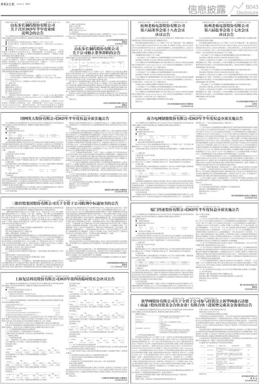 本公司董事会及全体董事保证本公告内容不存在任何虚假记载、误导性陈述或者重大遗漏,并对其内容的真实性、准确性和完整性承担法律责任。 重要内容提示: ● 每股分配比例 A股每股现金红利0.042元 ● 相关日期 ■ ● 差异化分红送转: 否 一、通过分配方案的股东会届次和日期 本次利润分配方案经公司2025年5月16日的2024年年度股东会批准,在2025年中期相应期间持续盈利、累计未分配利润为正、现金流可以满足公司正常经营和长远发展、且满足现金分红条件的情况下,由董事会组织实施2025年中期利润分配。公司于2025年8月27日召开第九届董事会第二次会议审议通过2025年中期利润分配方案。 二、分配方案 1.发放年度:2025年半年度 2.分派对象: 截至股权登记日下午上海证券交易所收市后,在中国证券登记结算有限责任公司上海分公司(以下简称“中国结算上海分公司”)登记在册的本公司全体股东。 3.分配方案: 本次利润分配以方案实施前的公司总股本5,718,435,744股为基数,每股派发现金红利0.042元(含税),共计派发现金红利240,174,301.25元。 三、相关日期 ■ 四、分配实施办法 1.实施办法 (1)无限售条件流通股的红利委托中国结算上海分公司通过其资金清算系统向股权登记日上海证券交易所收市后登记在册并在上海证券交易所各会员办理了指定交易的股东派发。已办理指定交易的投资者可于红利发放日在其指定的证券营业部领取现金红利,未办理指定交易的股东红利暂由中国结算上海分公司保管,待办理指定交易后再进行派发。 (2)派送红股或转增股本的,由中国结算上海分公司根据股权登记日上海证券交易所收市后登记在册股东持股数,按比例直接计入股东账户。 2.自行发放对象 国网英大国际控股集团有限公司、南瑞集团有限公司、上海置信(集团)有限公司、上海置信电气工程安装有限公司、国网新源控股有限公司的现金红利由公司自行发放。 3.扣税说明 (1)对于自然人股东及证券投资基金股东,根据《关于上市公司股息红利差别化个人所得税政策有关问题的通知》(财税[2015]101号)和《关于实施上市公司股息红利差别化个人所得税政策有关问题的通知》(财税[2012]85号)的有关规定,持股期限超过1年的,其股息红利所得暂免征收个人所得税;持股1年以内(含1年)的,公司暂不扣缴个人所得税,待自然人股东及证券投资基金股东转让股票时,中国结算上海分公司根据其持股期限计算实际应纳税额,由证券公司等股份托管机构从个人资金账户中扣收并划付中国结算上海分公司,中国结算上海分公司于次月5个工作日内划付公司,公司在收到税款当月的法定申报期内向主管税务机关申报缴纳。具体实际税负为:股东的持股期限在1个月以内(含1个月)的,其股息红利所得全额计入应纳税所得额,实际税负为20%;持股期限在1个月以上至1年(含1年)的,暂减按50%计入应纳税所得额,实际税负为10%。 (2)对于合格境外机构投资者(“QFII”)股东,公司根据《关于中国居民企业向QFII支付股息、红利、利息代扣代缴企业所得税有关问题的通知》(国税函[2009]47号)的规定,按10%的税率代扣代缴企业所得税,税后实际派发现金红利每股人民币0.0378元。如QFII股东取得的股息红利收入涉及享受税收协定(安排)待遇的,可按照规定在取得股息红利后自行向主管税务机关提出退税申请。 (3)对于通过沪股通投资上海证券交易所上市A股的香港市场投资者(包括企业和个人),根据《财政部、国家税务总局、证监会关于沪港股票市场交易互联互通机制试点有关税收政策的通知》(财税[2014]81号)的规定,其现金红利将由公司通过中国结算上海分公司按股票名义持有人账户(香港中央结算有限公司)以人民币派发。公司按照10%的税率代扣代缴所得税,税后实际派发现金红利每股人民币0.0378元。 (4)对于居民企业股东(含机构投资者),其现金股息所得税按照《中华人民共和国企业所得税法》及相关实施条例计算后自行缴纳,公司实际派发现金红利为税前每股人民币0.042元。 五、有关咨询办法 关于本次权益分派如有任何疑问,请按照以下联系方式咨询: 联系部门:公司证券事务部 联系电话:021-51796818 特此公告 国网英大股份有限公司董事会 2025年9月19日