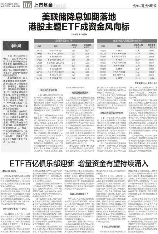 □本报记者 王鹤静 上周(9月15日至9月19日),国内半导体产业链、汽车零部件等板块均有不错表现,多只跟踪科创半导体材料设备指数的ETF涨超7%,另有部分跟踪汽车零部件、智能电车指数的ETF也涨超5%。 值得注意的是,在上周美联储降息落地前后,港股主题ETF交投显著活跃,香港证券、港股创新药、恒生科技等主题的龙头ETF上周成交额排在市场前列。同样受降息预期影响,证券主题ETF吸引了不少资金埋伏布局。此外,在产业催化影响下,机器人、电池等主题ETF上周也有资金增配。 随着近期科技主线行情进入整固期,业内机构提示,四季度市场风格或将迎来再平衡的过程。一方面,顺周期风格进入交易窗口期,前期滞涨的方向或迎来补涨;另一方面,科技风格内部或迎来“高切低”,行情可能从上游算力硬件的“一枝独秀”,转向泛人工智能分支的“多点开花”格局。 半导体产业链走强 上周(9月15日至9月19日),国内半导体产业链领涨市场,中微公司、中芯国际分别涨超20%、10%,华夏基金、鹏华基金旗下科创半导体材料设备主题ETF以及华夏基金、万家基金、易方达基金、广发基金旗下半导体材料设备主题ETF涨幅都在7%以上。 此外,汽车和游戏板块上周也有较好表现。一方面,三花智控、宁德时代上周分别涨超20%、13%,易方达基金、平安基金、华夏基金旗下汽车零部件主题ETF以及华宝基金、易方达基金等旗下智能电车主题ETF涨幅都在5%以上。另一方面,完美世界、恺英网络上周分别涨超14%、11%,带动华夏基金、国泰基金旗下动漫游戏主题ETF也涨超5%。 而有色、黄金股、稀土以及大金融等板块上周跌幅靠前。其中,广发中证港股通非银行金融主题ETF跌超6%,多只黄金股ETF跌幅在4%以上,另有多只有色、矿业、稀土、金融、银行等主题ETF跌超4%。 港股品种交投活跃 上周美联储降息落地前后,港股主题ETF交投活跃度显著提升。易方达中证香港证券投资主题ETF上周成交额突破660亿元,广发中证香港创新药ETF、华泰柏瑞恒生科技ETF、华夏恒生科技ETF的成交额也都在400亿元以上,排名市场前列。 基于此前的降息预期,从ETF资金流向可以发现,部分资金提前埋伏在证券以及港股等品种。跟踪证券公司指数的ETF上周合计净流入超100亿元,跟踪港股通互联网指数的ETF合计净流入额也在50亿元以上。 其中,国泰中证全指证券公司ETF、富国中证港股通互联网ETF两只龙头产品的上周净流入额都在40亿元以上,华宝中证全指证券公司ETF、工银国证港股通科技ETF的上周净流入都在20亿元上下。 此外,近期产业催化不断的机器人、电池等主题ETF也有资金布局,易方达国证机器人产业ETF上周净流入超27亿元,广发国证新能源车电池ETF、华夏中证机器人ETF净流入额也都在10亿元以上。 在上述板块“吸金”的同时,跟踪科创50、沪深300等宽基指数的ETF流出较多资金,华夏上证科创板50ETF上周净流出超43亿元,华泰柏瑞沪深300ETF、南方中证500ETF净流出额也在15亿元以上。 市场风格或迎结构性切换 近期,科技主线行情进入整固期。东吴证券策略团队认为,四季度市场往往会进行结构性切换,市场风格或将迎来再平衡。一方面,顺周期风格进入交易窗口期,前期滞涨的方向或迎来补涨,可以关注PPI交易下的价格主线,如新能源、化工、有色、建材等,以及白酒、餐饮、旅游等估值偏低的板块,服务消费等领域也可能受益于政策有阶段性表现。 另一方面,科技风格内部或迎来“高切低”,行情可能从上游算力硬件的“一枝独秀”,转向泛人工智能分支的“多点开花”格局,可以关注存储、AIDC(人工智能数据中心)相关配套设施、AI应用(包括但不限于智能体、“AI+医药”、人形机器人、端侧AI、智能驾驶)等AI产业链中的细分领域。 上周,美联储降息25个基点如期落地,兴业基金认为,此举表明现在的降息依然是预防式的。在大类资产方面,经济预期和通胀预期的上调相对有利于权益资产以及工业金属等商品资产,对长端美债较为利空,对黄金短期中性偏利空,对美元指数影响相对中性。在A股和港股方面,降息对国内政策思路的影响不大,国内短期跟随降息概率较小。从流动性角度来看,考虑到此前市场对降息已有充分预期,因此或有部分资金获利了结,可能造成短期市场波动,中期不影响上行趋势。 对于港股市场,申万宏源证券策略团队认为,美联储降息落地后,宽货币、弱美元、强黄金和实物资产将构成港股中期的支撑因素,也会支持黄金和其他有色金属的中期行情。同时,港股或将继续受益于产业趋势发酵,港股龙头公司具有较强的代表性。